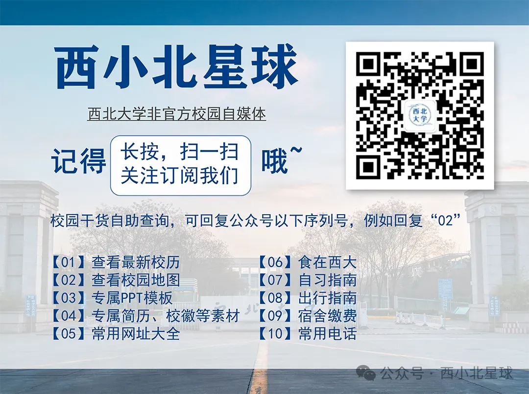 --关注微信公众号“西小北星球”-- “西北大学”PPT模板来啦!快来领取~ 更新!西北大学历年期中期末真题来了~ 西北大学简历模板! 校友会中国大学排名已出!西大排第几? 西大学长学姐薪资爆料第6期! 西大学长学姐薪资爆料第7期! 西大学子拿下“挑战杯"全国一等奖! 西北大上榜!QS2026亚洲大学排名出炉 西北大学2024-2025国家励志奖学金名单 西北大学2025-2026国家助学金推荐名单 西大2024-2025校内奖学金名单公示