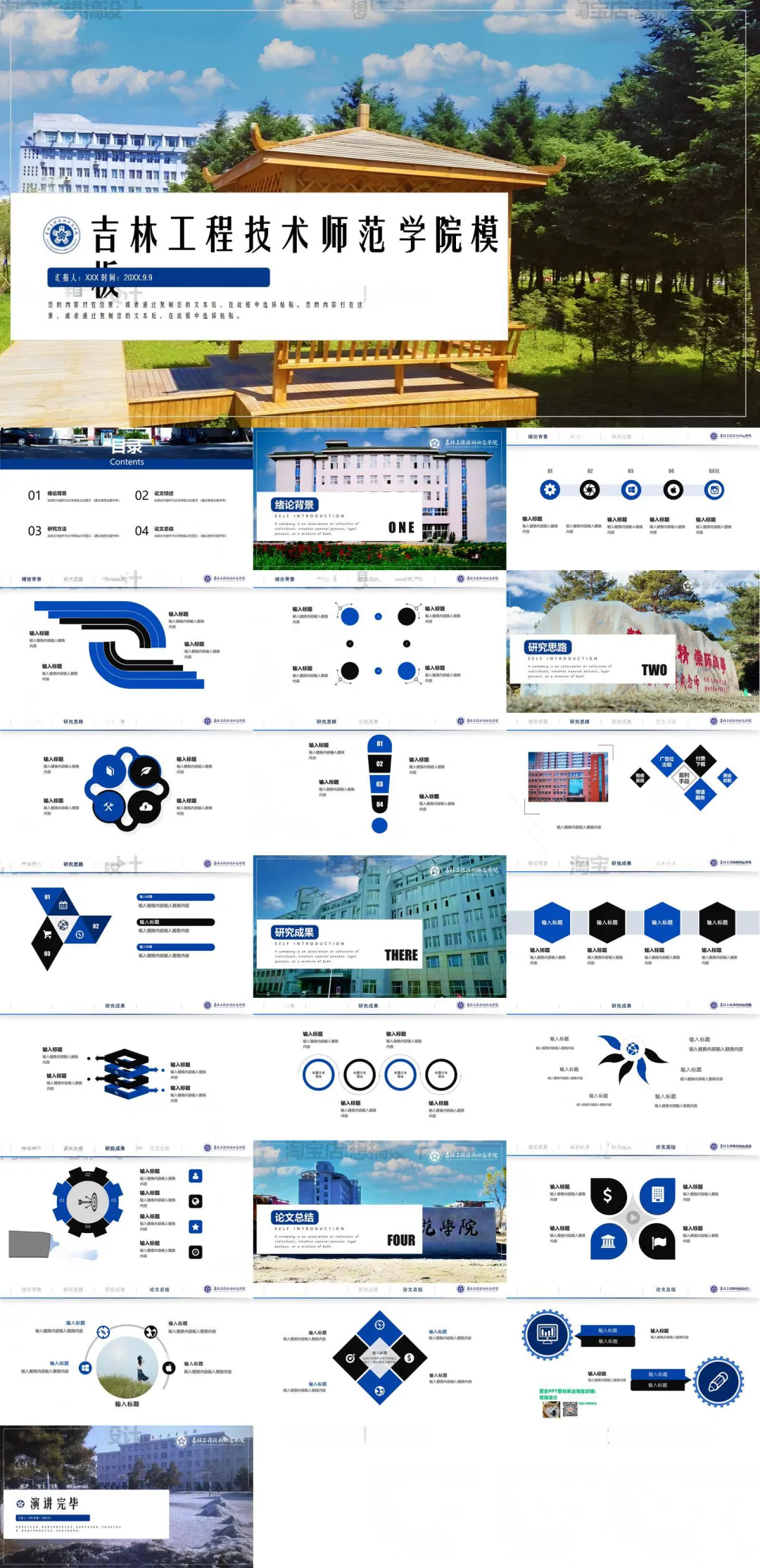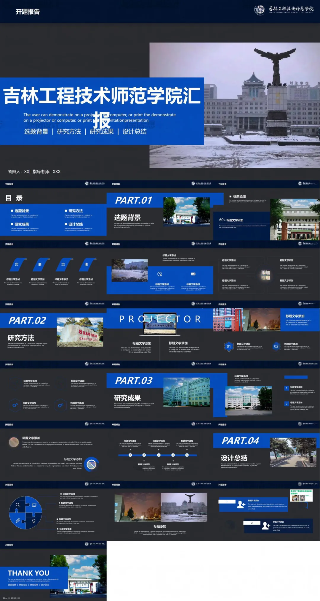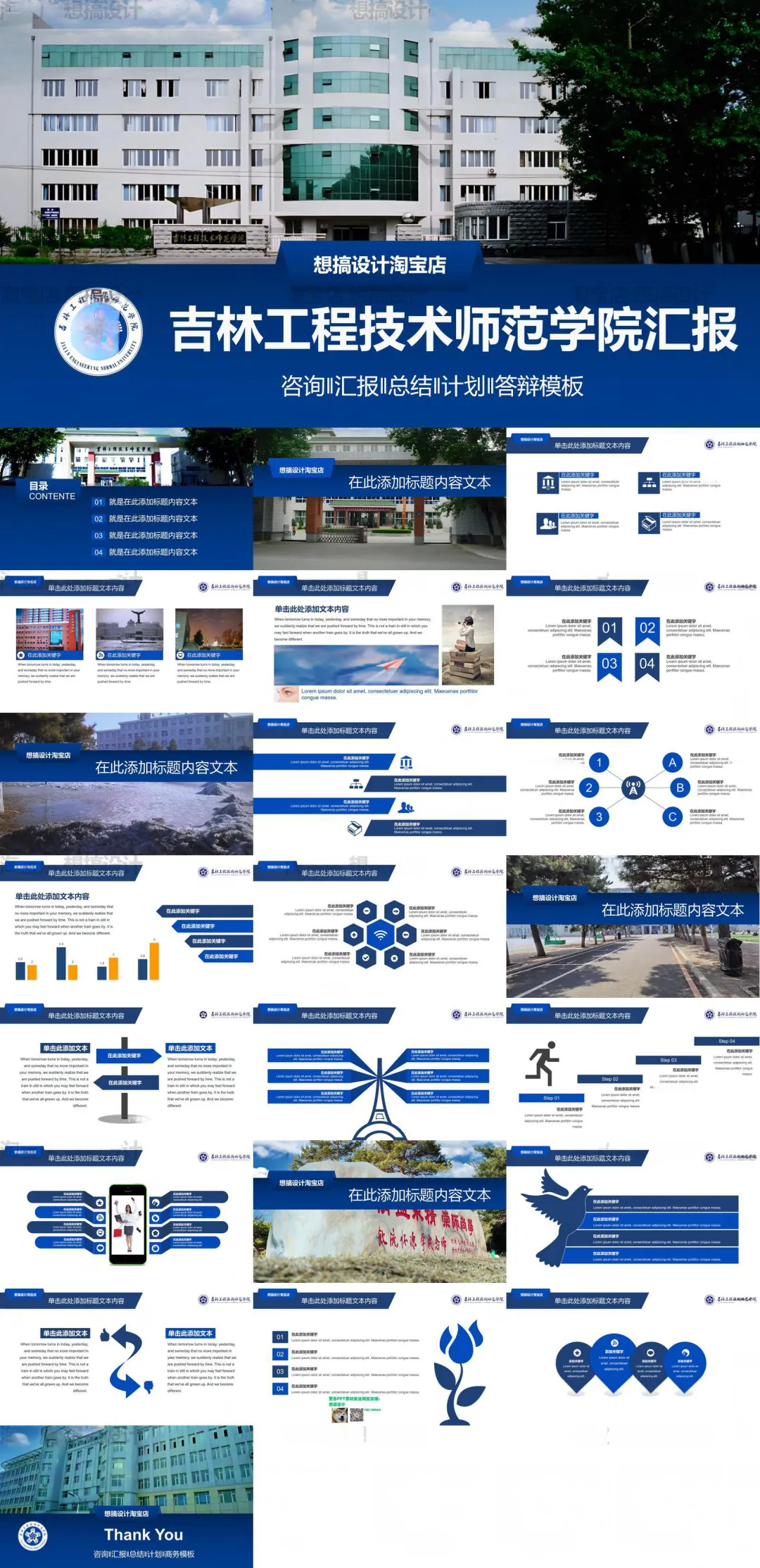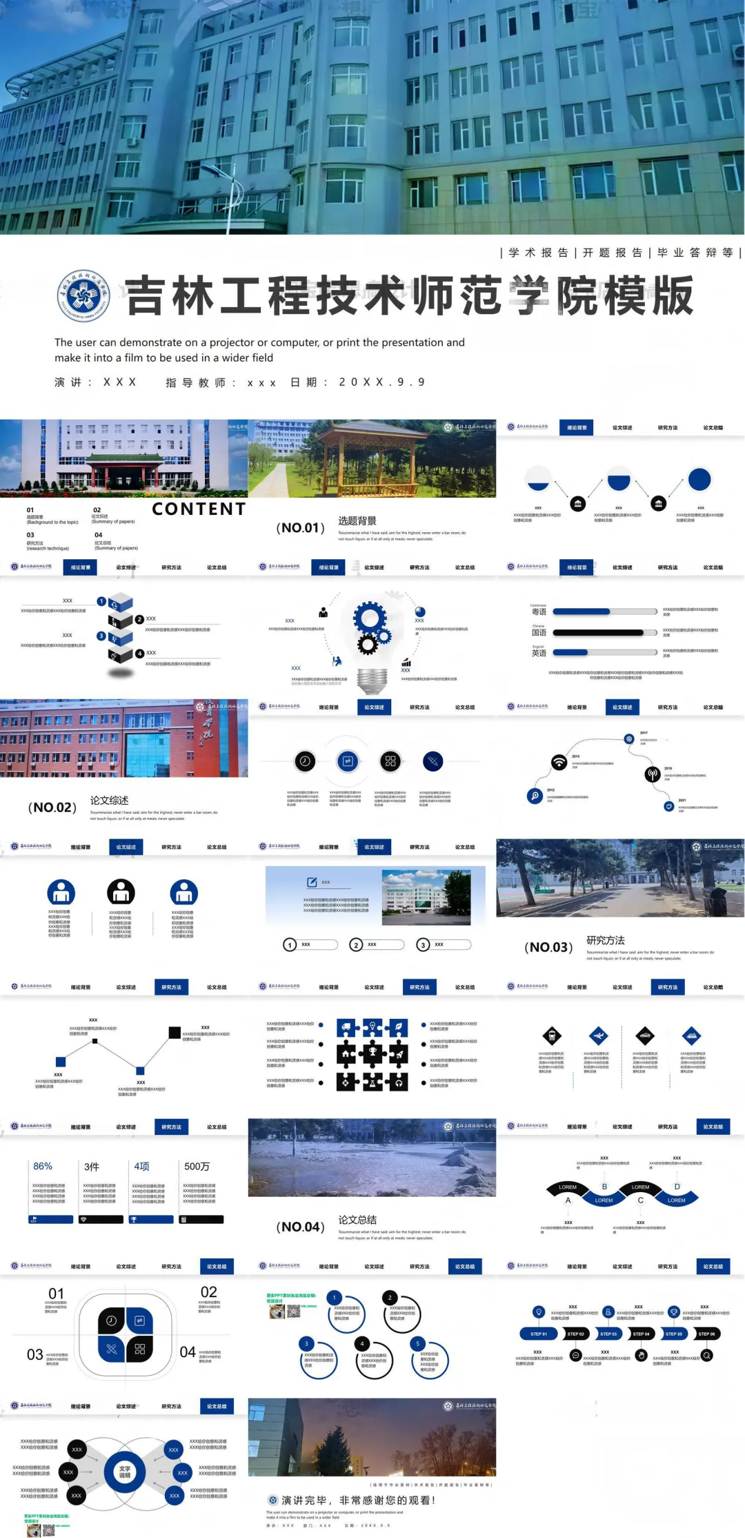 以上是我们为大家准备的吉林工程技术师范学院的专属PPT模板,文中的所有板式都是可编辑的,大家可以上传替换自己喜欢的校园美景,做出具有自己风格的专属PPT哦!