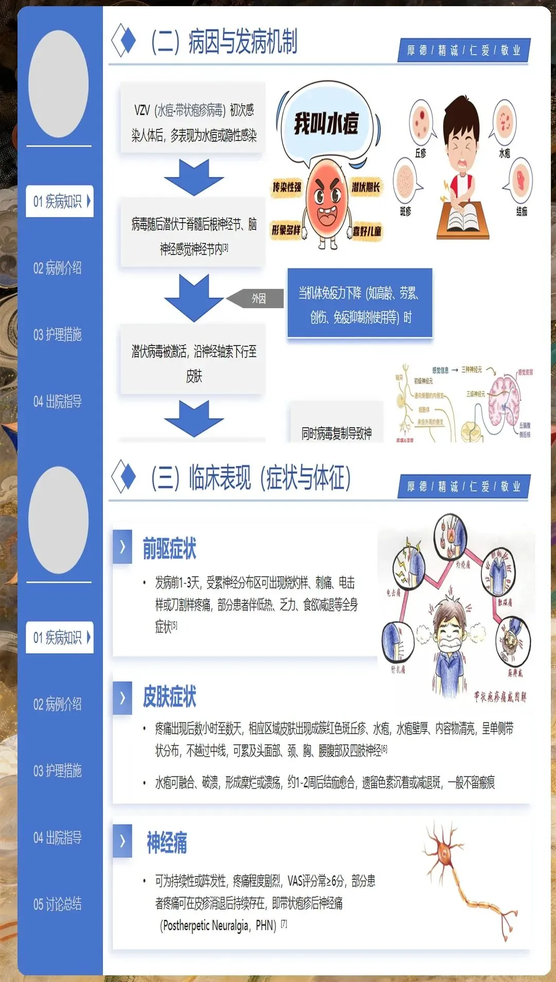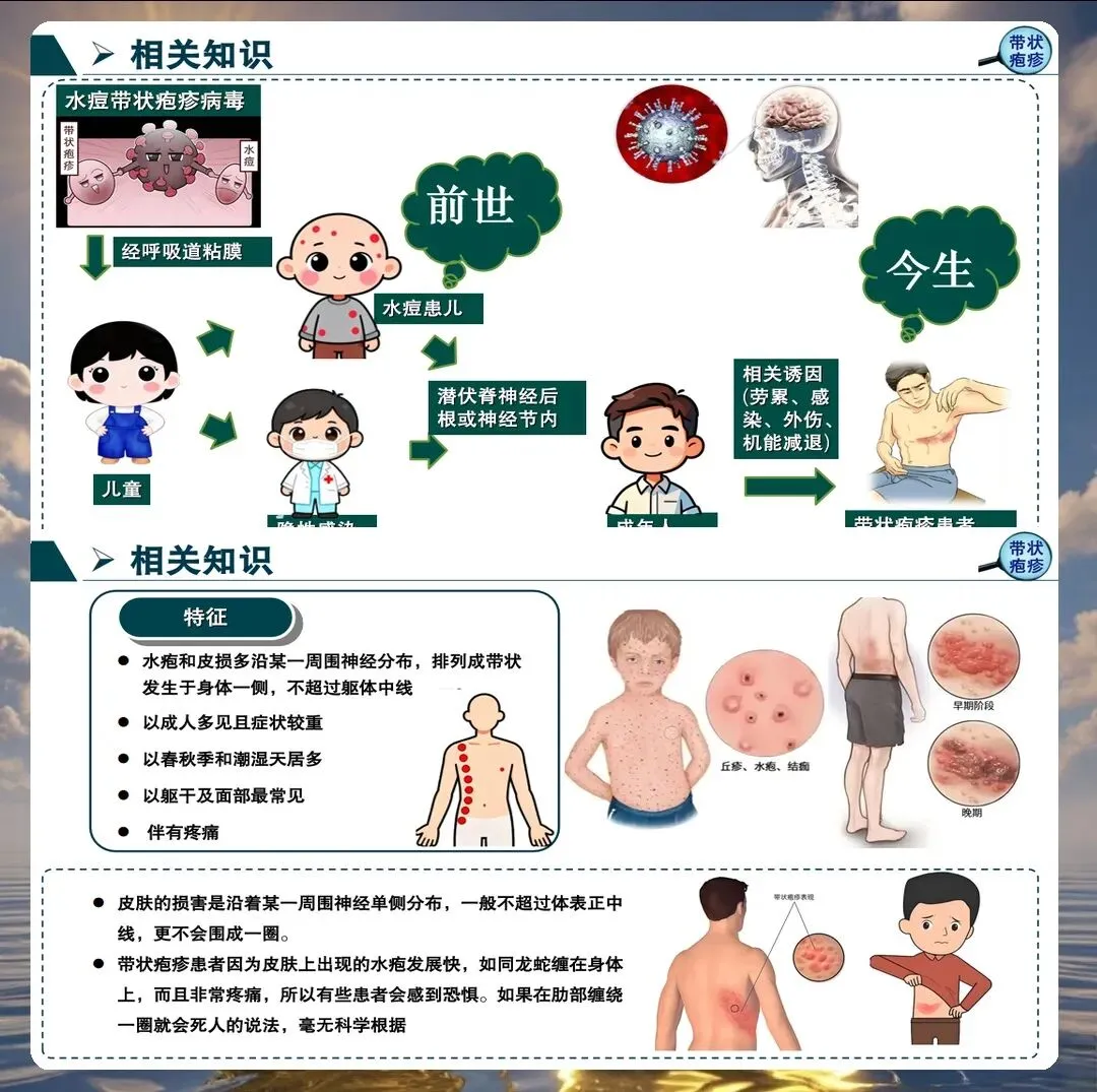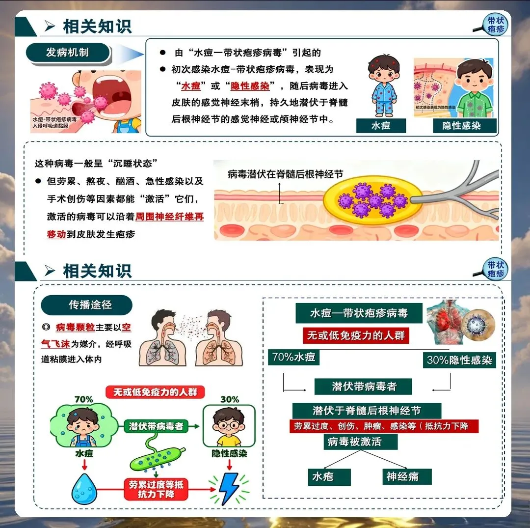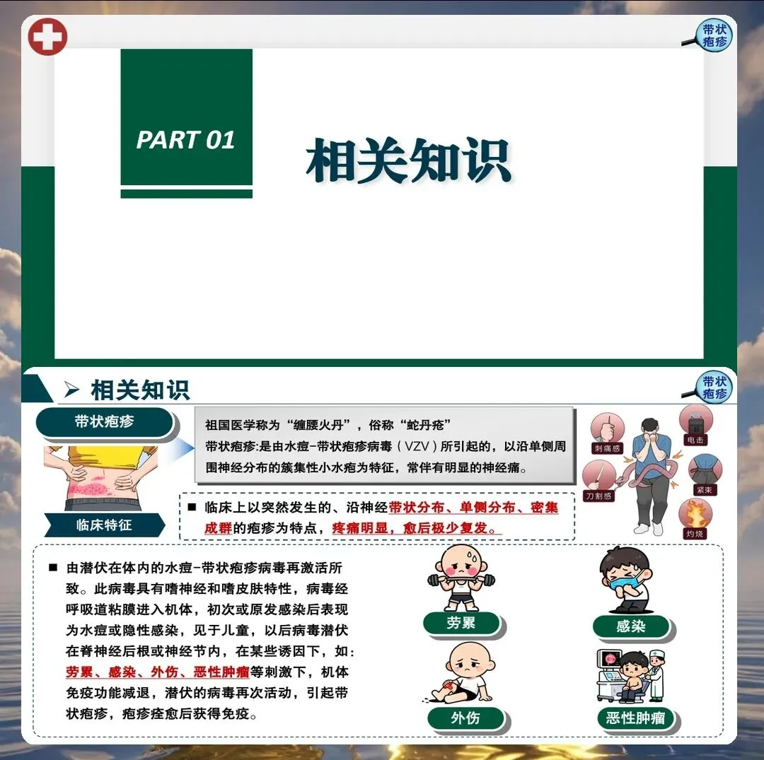 带状疱疹由水痘-带状疱疹病毒再激活引起,主要侵犯感觉神经节,导致神经炎和皮肤损害。护理人员需要深入理解其病理生理过程,特别是神经痛的发生机制,为制定有效的护理措施奠定基础。
