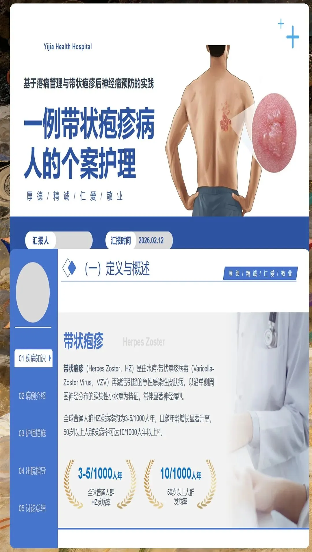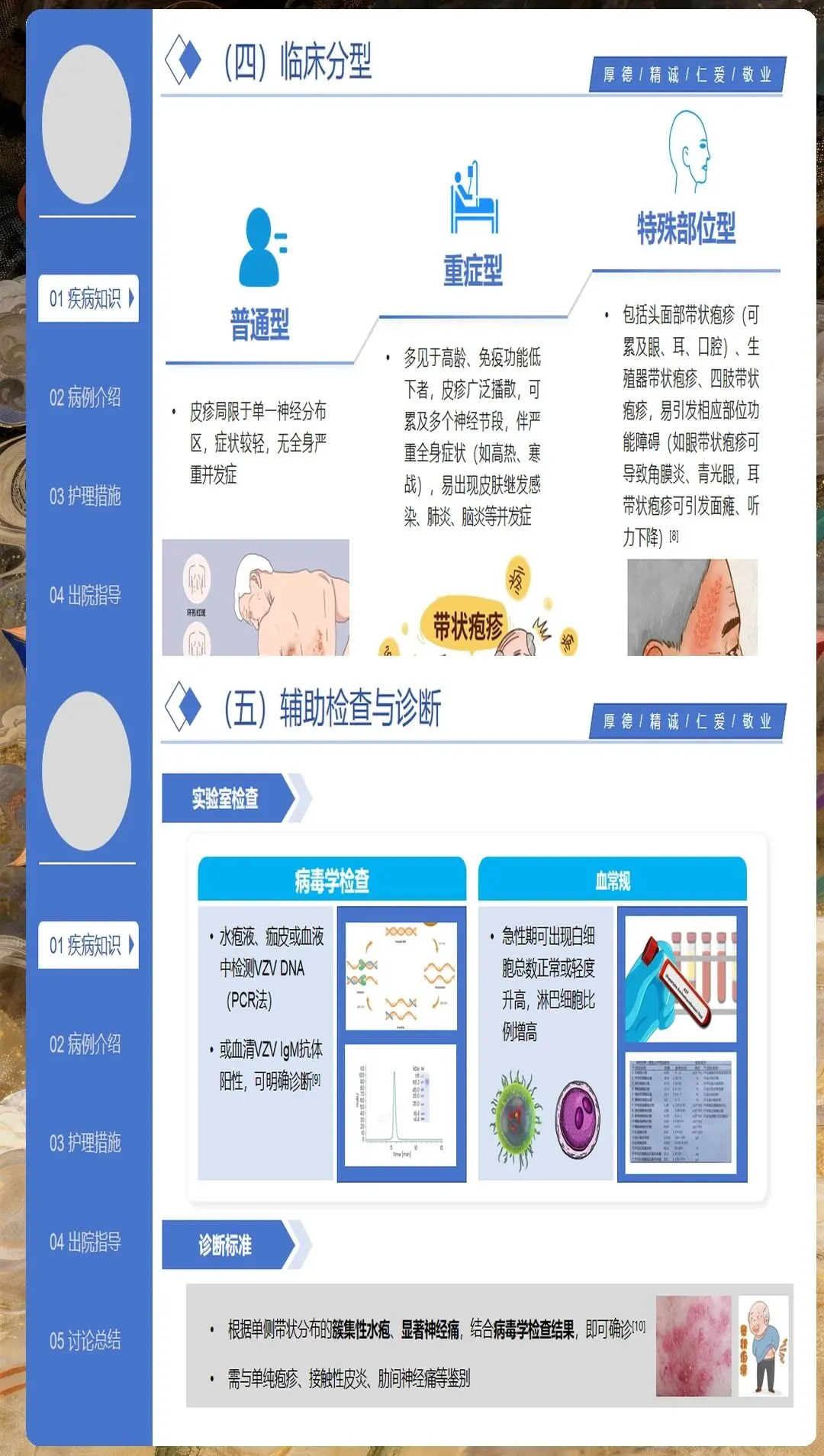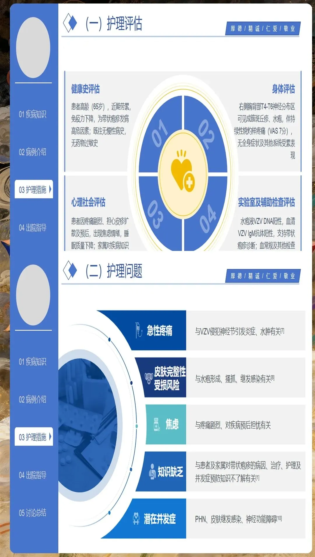 带状疱疹由水痘-带状疱疹病毒再激活引起,主要侵犯感觉神经节,导致神经炎和皮肤损害。护理人员需要深入理解其病理生理过程,特别是神经痛的发生机制,为制定有效的护理措施奠定基础。