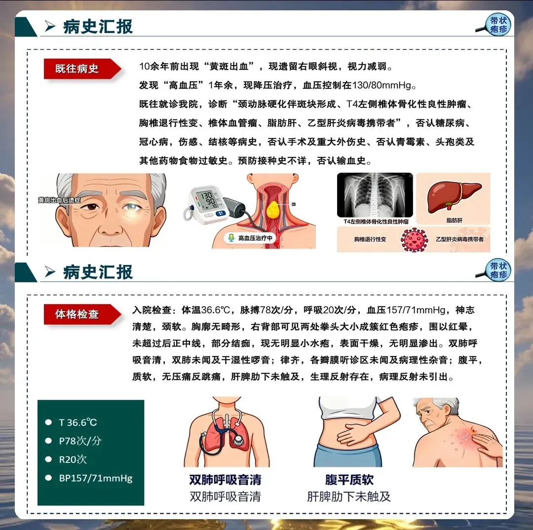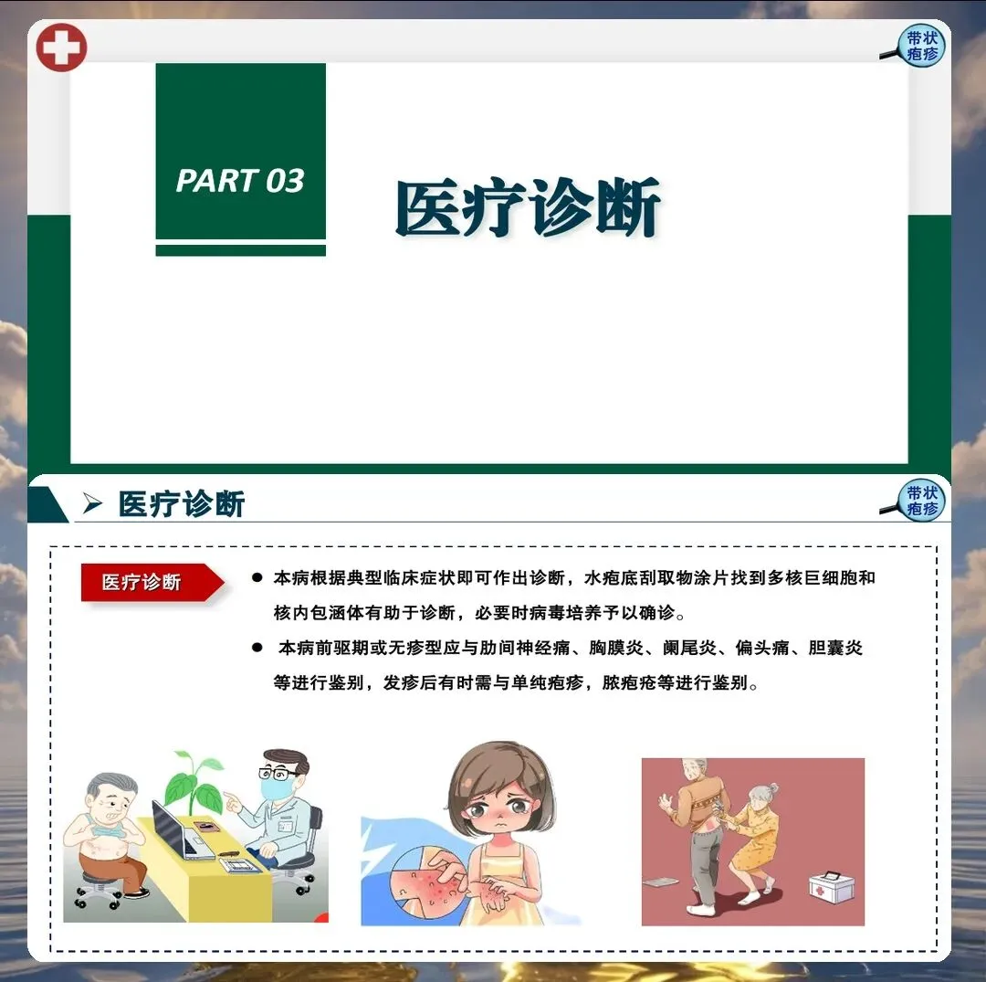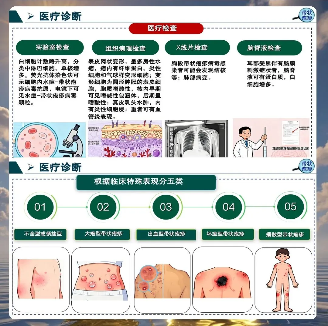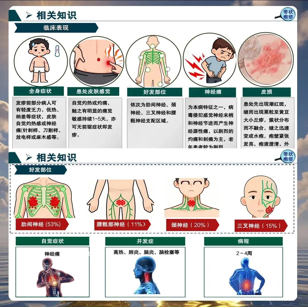 带状疱疹的典型表现包括单侧分布的簇集性水疱、神经痛、发热等。但临床上也存在不典型表现,如无疹型带状疱疹、内脏型带状疱疹等,护理人员必须提高警惕,避免漏诊误诊。