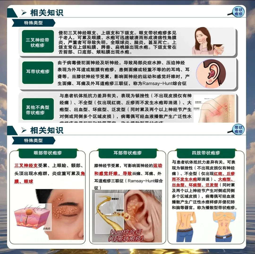眼部并发症是带状疱疹最危险的并发症之一。三叉神经眼支受累时,可能导致角膜炎、葡萄膜炎等严重眼部病变。护理人员应密切观察患者眼部情况,教会患者正确使用眼药水,避免揉眼,及时请眼科会诊。