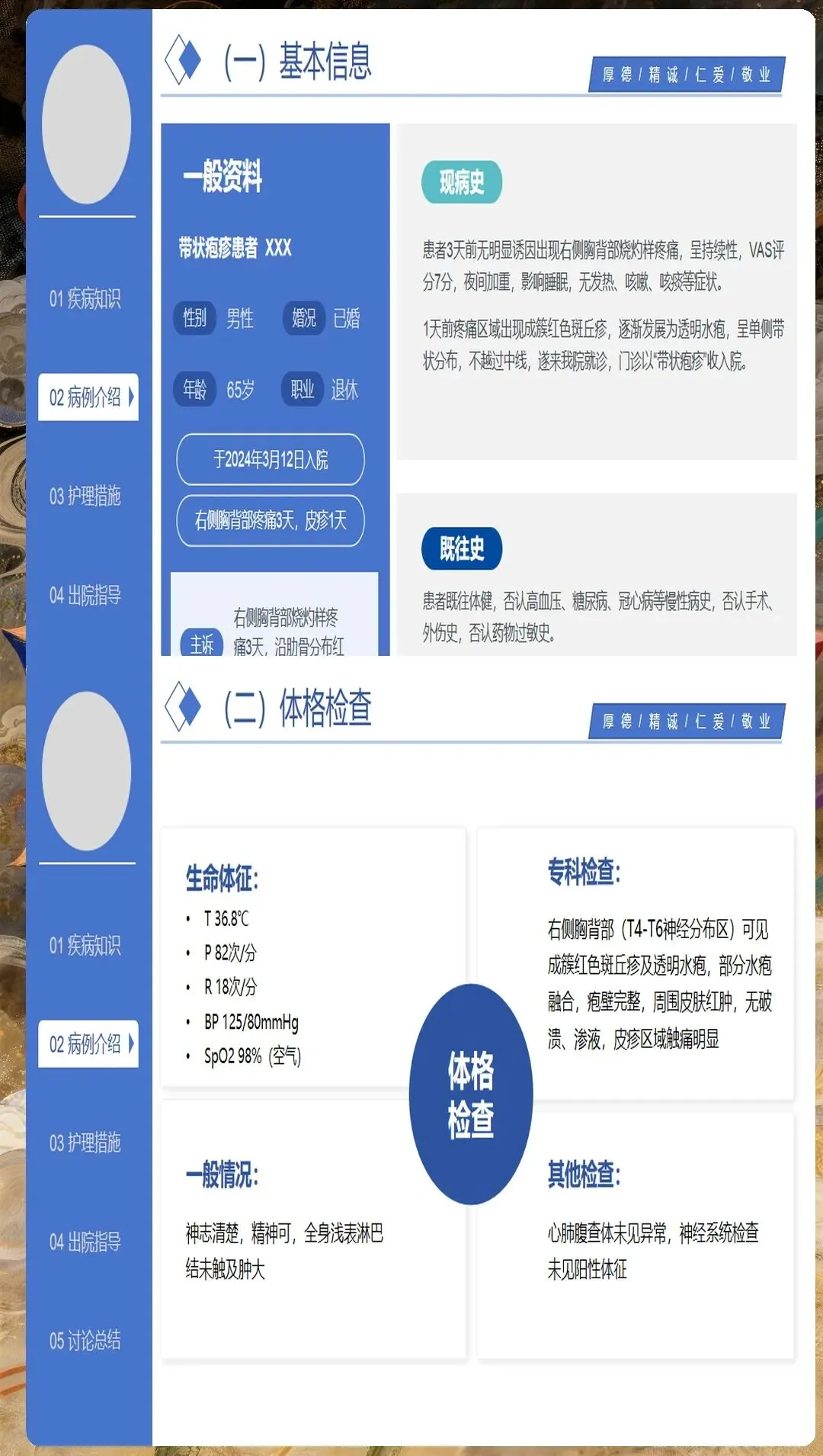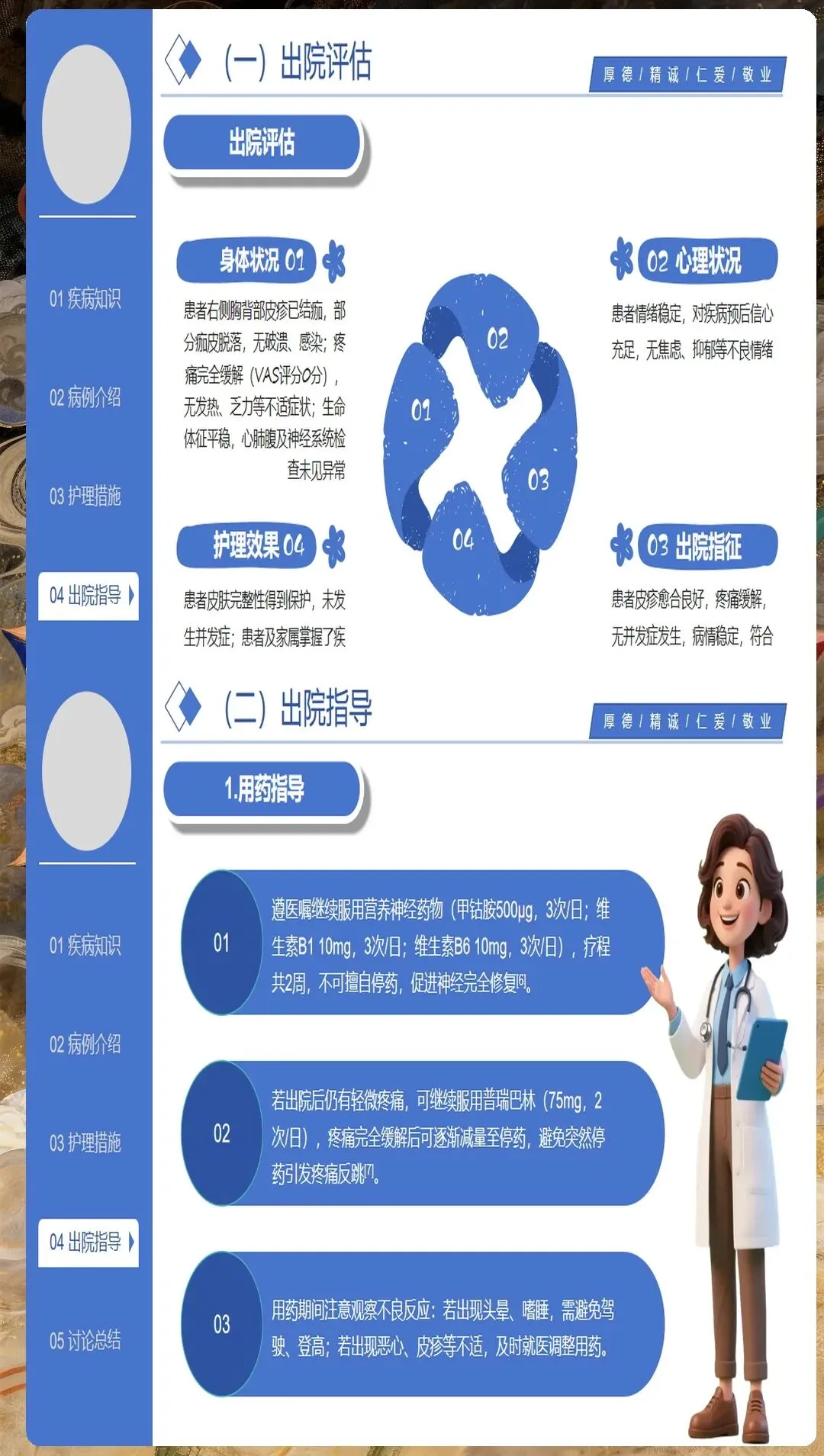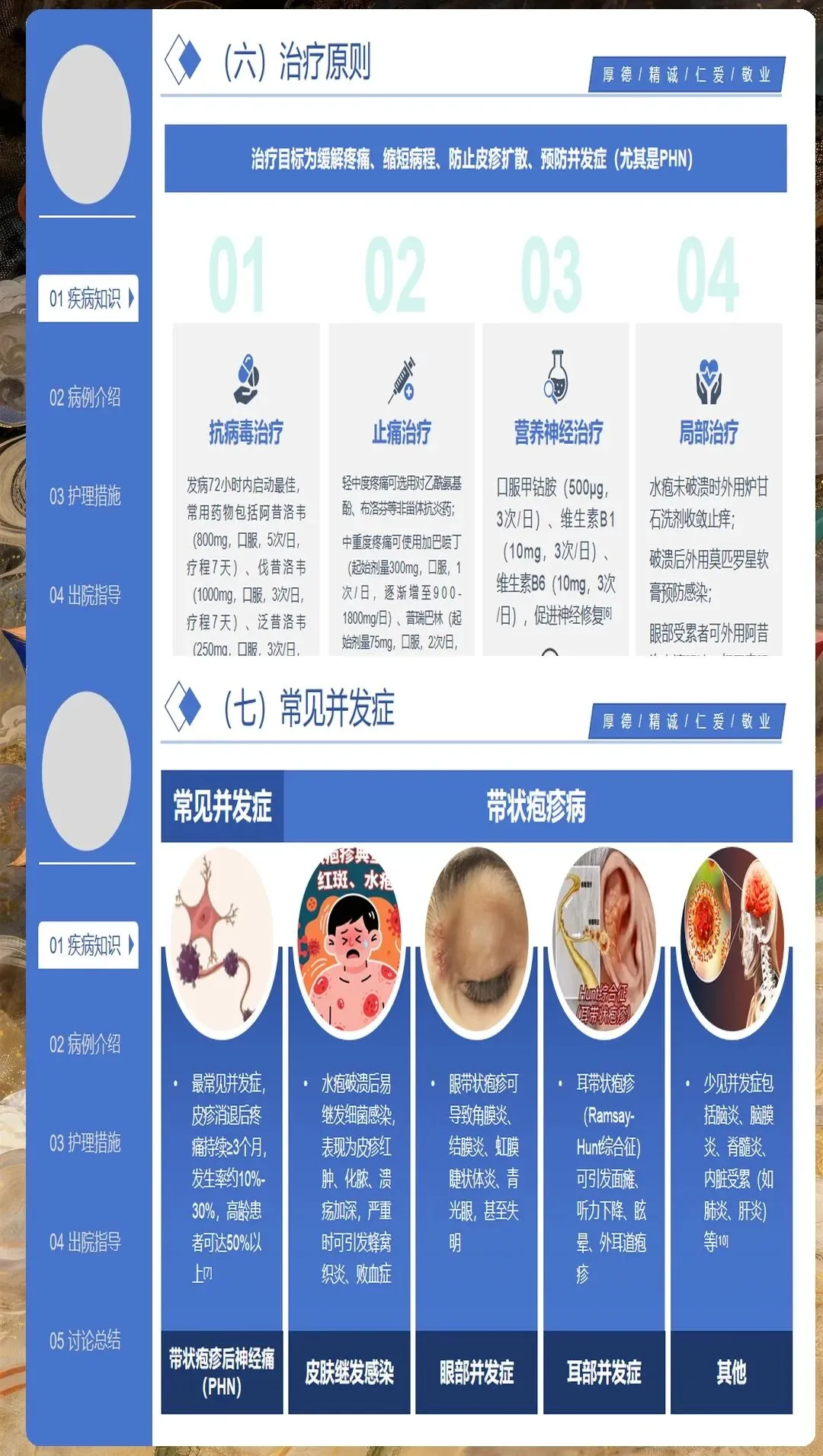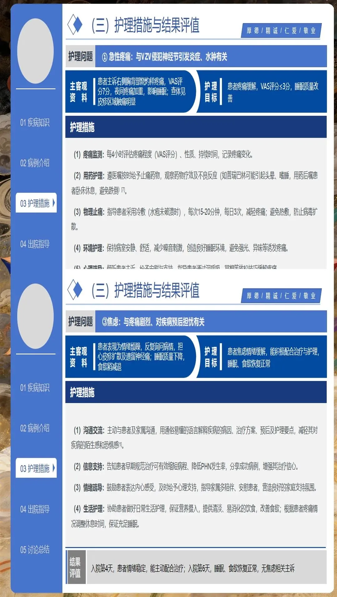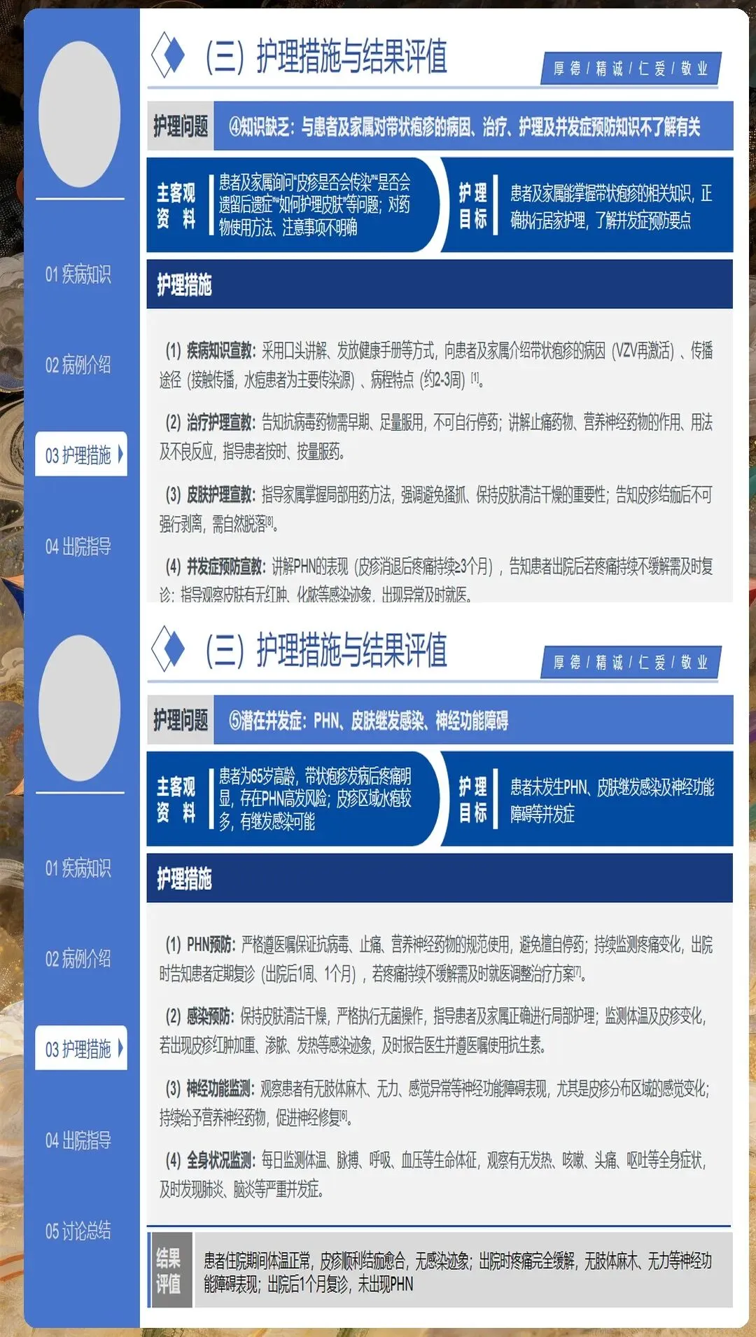 健康教育是心理护理的重要组成部分。向患者解释疾病的发生发展、治疗预后、预防措施等,消除不必要的恐惧和误解。对于担心遗留神经痛的患者,应实事求是地告知可能的情况,同时介绍有效的应对策略。