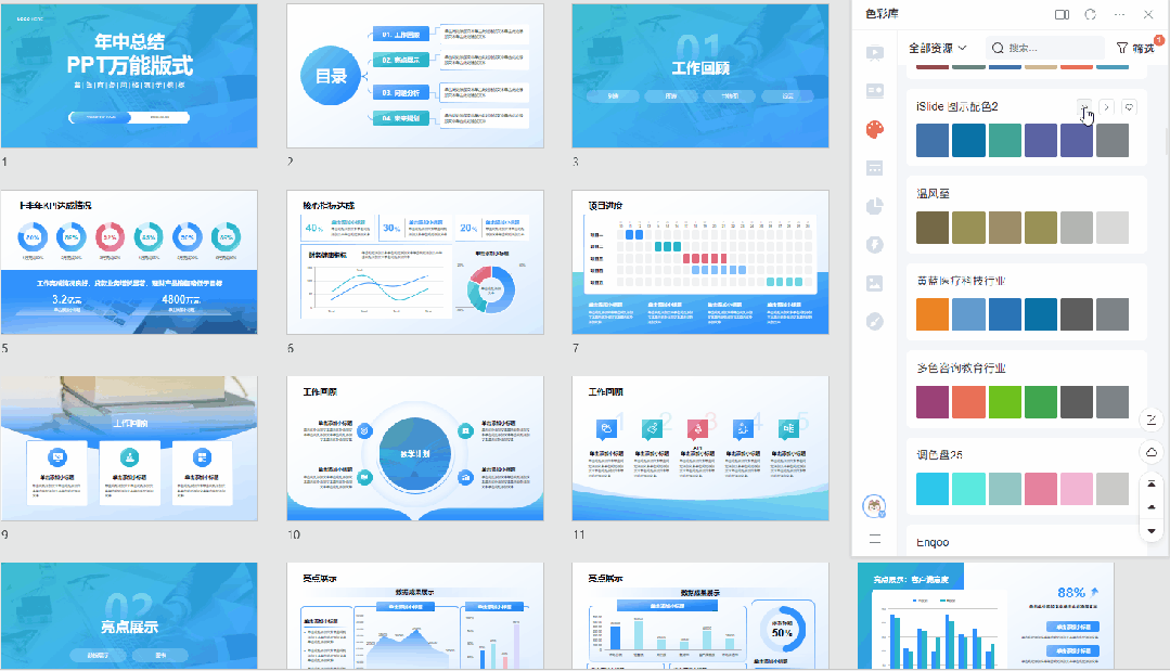 控制数量:整体配色不超过3种主色。用iSlide的"色彩库"一键统一配色