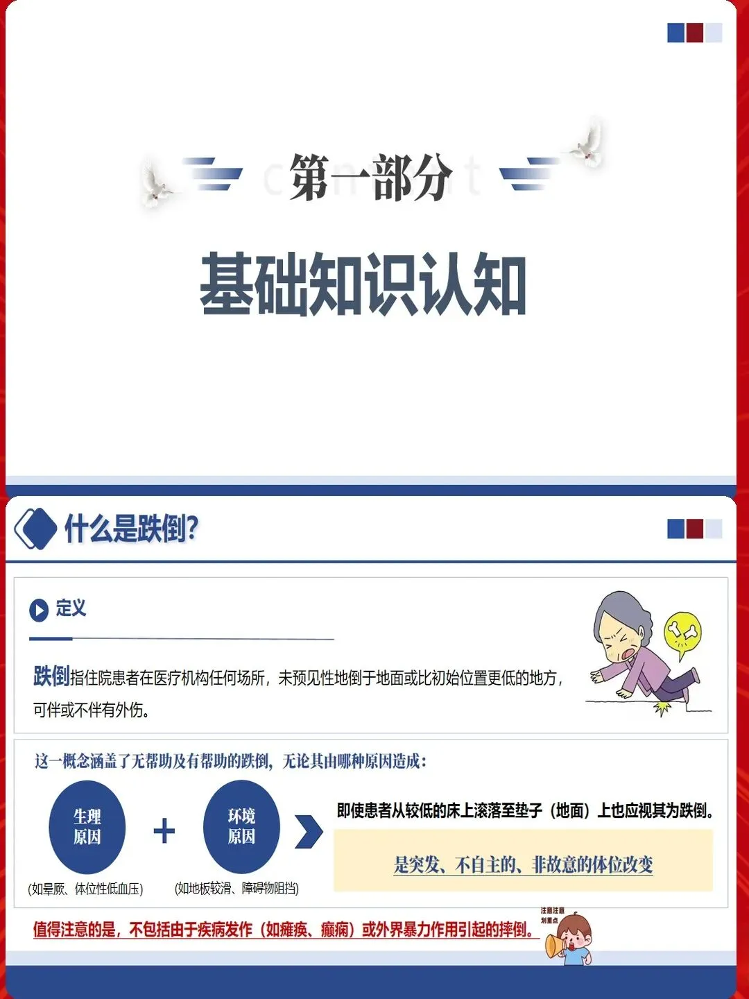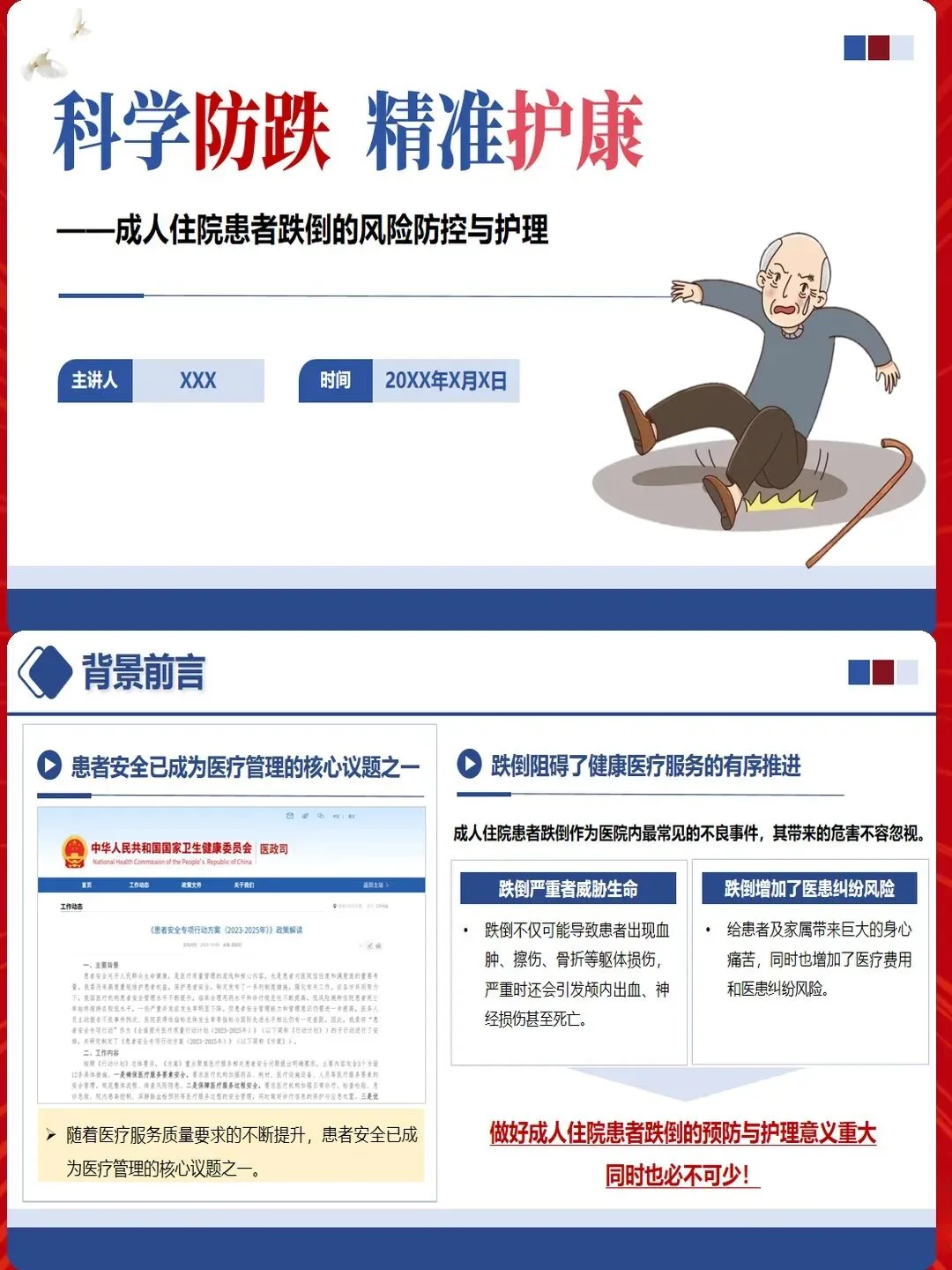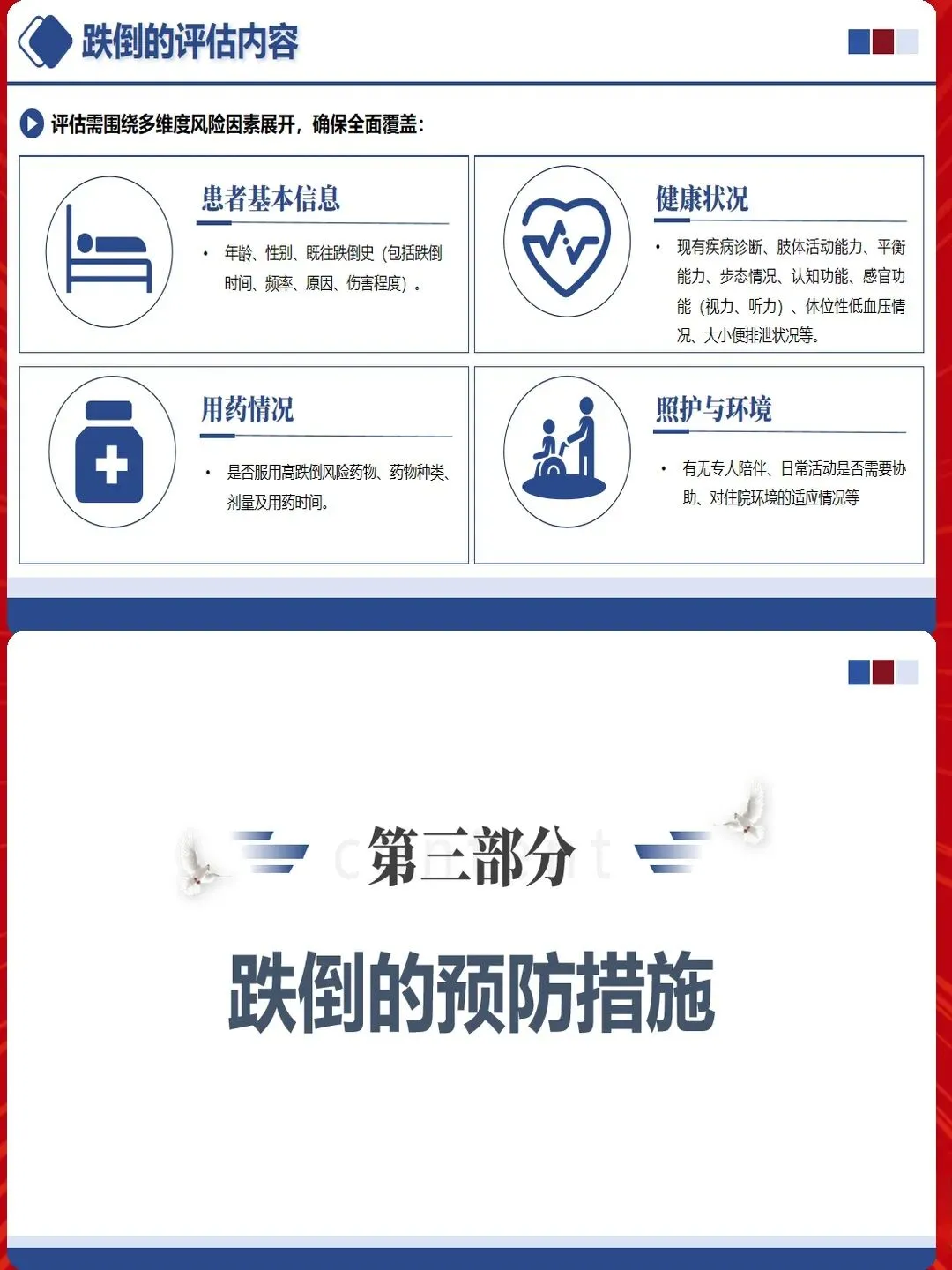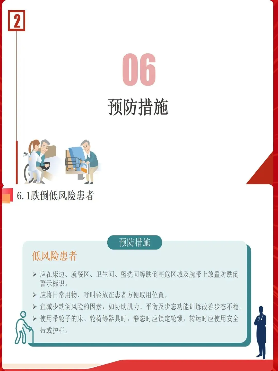 跌倒预防不仅要关注安全,更要体现人文关怀。尊重患者自主权,避免过度限制导致生活质量下降。与患者共同制定跌倒预防计划,增强其参与感和依从性。对于认知功能受损的患者,耐心解释安全措施,争取配合。对于因预防措施受限而情绪不佳的患者,加强心理疏导。