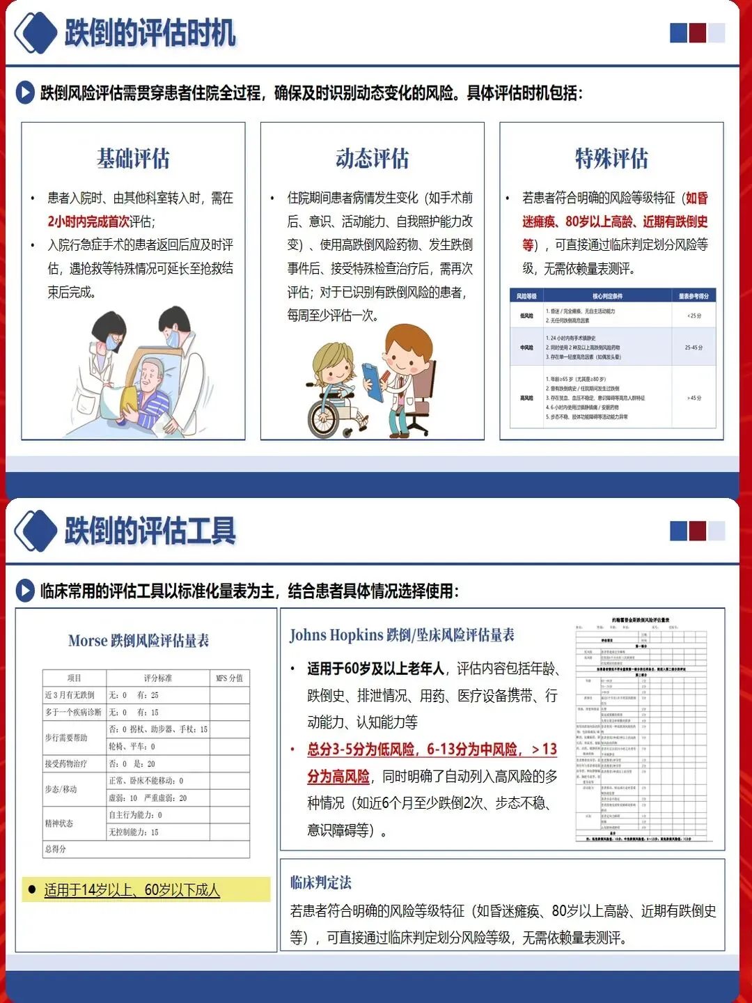 评估时机至关重要。入院后4小时内完成首次评估,手术前后、病情变化、用药调整时及时重新评估。对于高危患者,每班评估跌倒风险,动态调整护理措施。评估不是终点,而是制定个性化护理计划的起点。