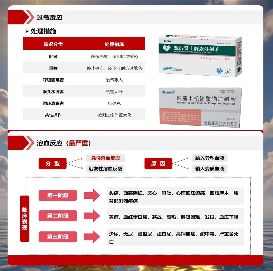 首先需要了解的是,静脉输血不良反应可以分为即刻反应和迟发反应。即刻反应通常在输血过程中或输血后数小时内发生,主要包括发热反应、过敏反应、溶血反应、输血相关急性肺损伤等。迟发反应则可能在输血后数天至数周内出现,如输血相关性移植物抗宿主病、输血后紫癜等。