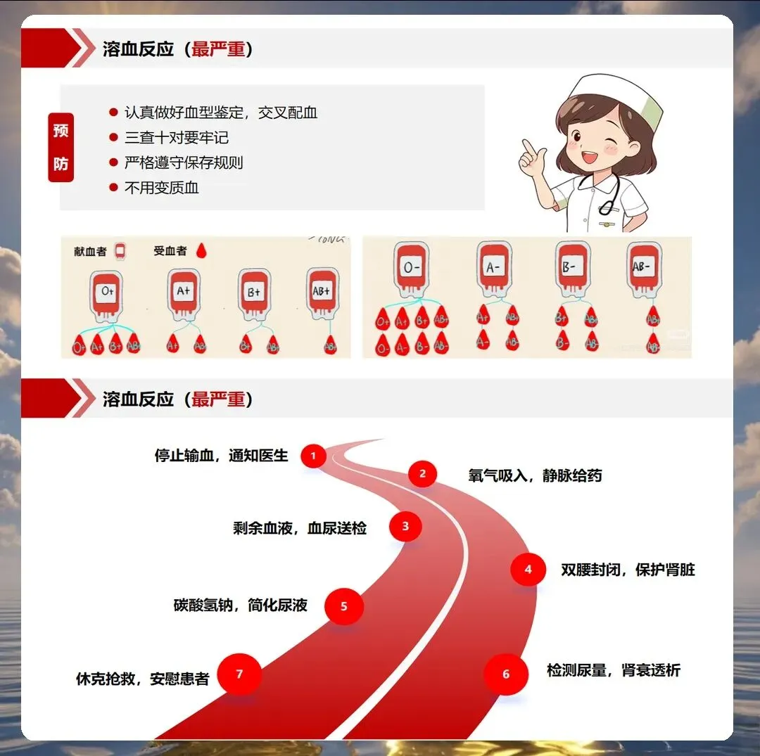 溶血反应是最严重的输血不良反应,虽然发生率低,但后果严重。典型表现为输血后立即出现腰背剧痛、寒战高热、血红蛋白尿,甚至休克。这种反应主要是因为输入的红细胞与受血者的血型不合,发生免疫性溶血。一旦怀疑溶血反应,必须立即停止输血,保留静脉通路,给予大量补液利尿,同时报告医生进行紧急处理。密切观察患者的尿量、尿色变化,做好抢救准备。