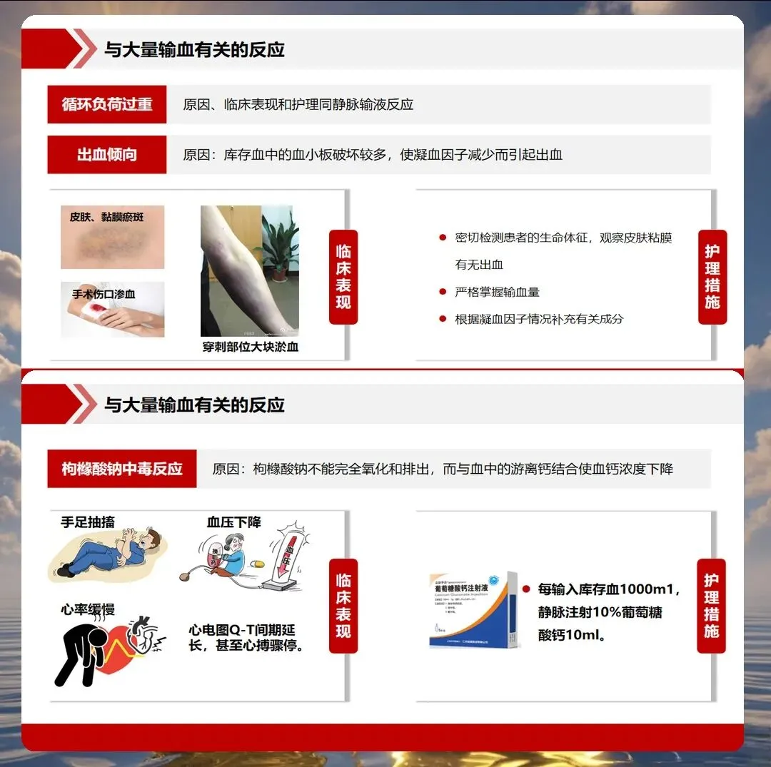 除了这些常见不良反应,还有一些特殊的输血相关并发症。比如循环负荷过重,常见于老年患者或心功能不全者,表现为呼吸困难、端坐呼吸、咳粉红色泡沫痰。遇到这种情况,我们需要立即停止输血,给予吸氧、利尿、扩血管等处理。还有细菌污染反应,虽然罕见但病死率高,表现为发热、寒战、休克等中毒症状。发生后需要立即停止输血,进行血培养,给予大剂量抗生素治疗。