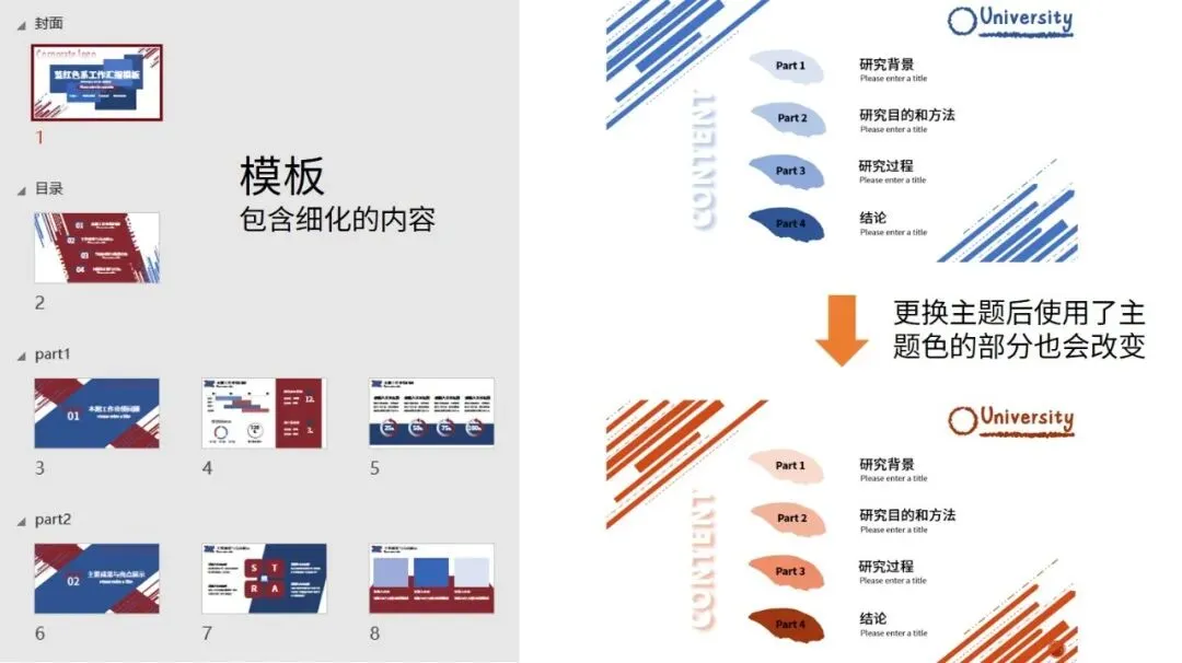 在创作PPT的过程中,为了快速完成一些批量操作,会用到主题、母版、模板等一系列功能,那么这些功能具体对应的内容是什么?有什么区别?今天就让我们来了解主题、母版和模板。01.幻灯片主题