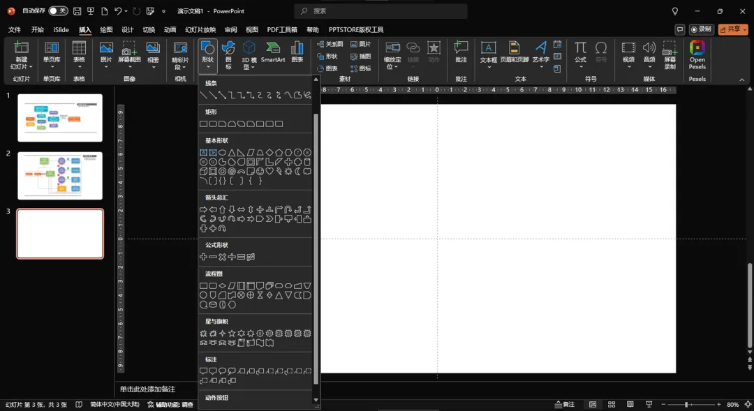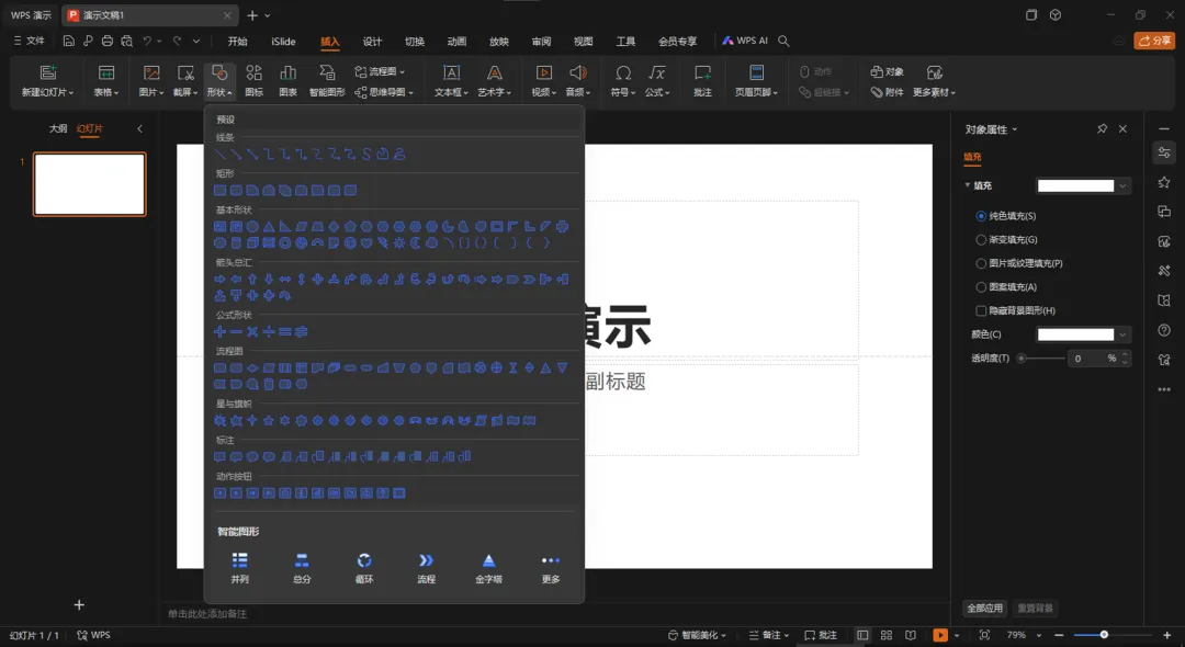 在PPT上制作复杂图表,使用SmartArt是远远不够的,模板平台上那些付费的图表模板也不能解决问题。真正要用到的,其实是在幻灯片上插入的形状。PPT提供插入的形状分类和数量,可以直观地在PowerPoint和WPS演示的主界面上看到。制作图表时,直接在其中选用所需要的图形即可。