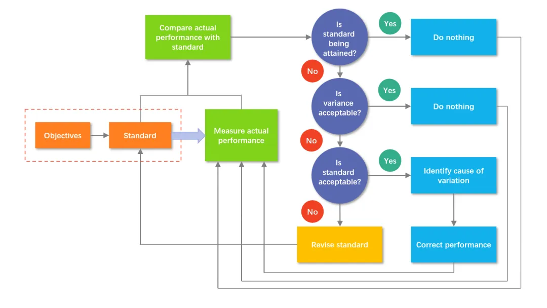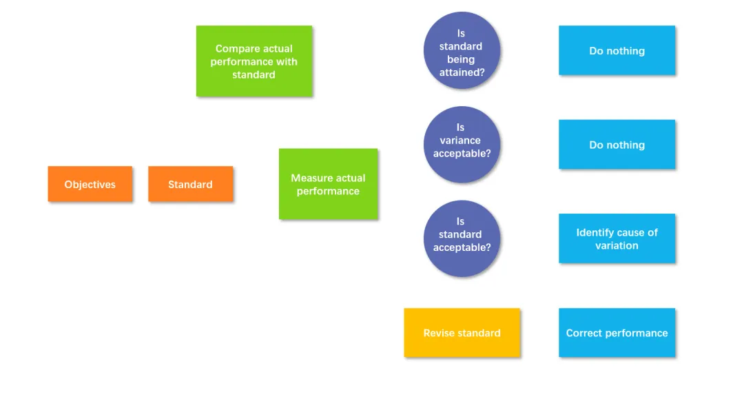 客户想不到的是,专业的PPT设计师制作这样的图表,比制作一些版式构成简单但客户能萌发出几百个Ideas的幻灯片要容易得多。这是因为,用PPT制作复杂图表是有不少技巧的。为了便于讲解讲解这些技巧,这里引用罗宾斯《管理学》(第11版)中的一张图表(Exhibit 18-6,Managerial Decisions in the Control Process)作为案例。下面将按一般的步骤,讲解如何在PPT上制作复杂图表。