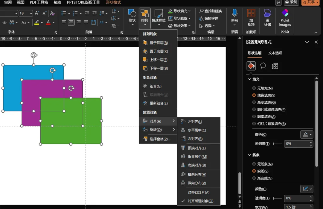 PowerPoint和WPS演示的「排列」选项卡,在选中多个形状后便会在「形状格式」中出现,包含排列、组合、对齐、旋转等多种功能