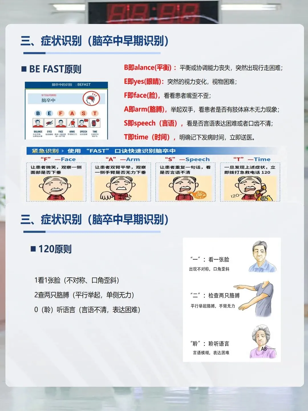 识别脑卒中症状是抢救的关键,记住两个简单口诀就能快速判断。一个是“BE FAST”原则:看平衡(Balance),是否突然行走困难;看眼睛(Eyes),是否视物模糊;看面部(Face),微笑时是否口角歪斜;看手臂(Arm),举起双手是否单侧无力;听言语(Speech),是否说话不清;最后是时间(Time),发现症状立即就医。另一个是“120”原则:看1张脸是否不对称,查2只胳膊是否单侧无力,听(0)语言是否表达困难,有这些情况就赶紧打120。