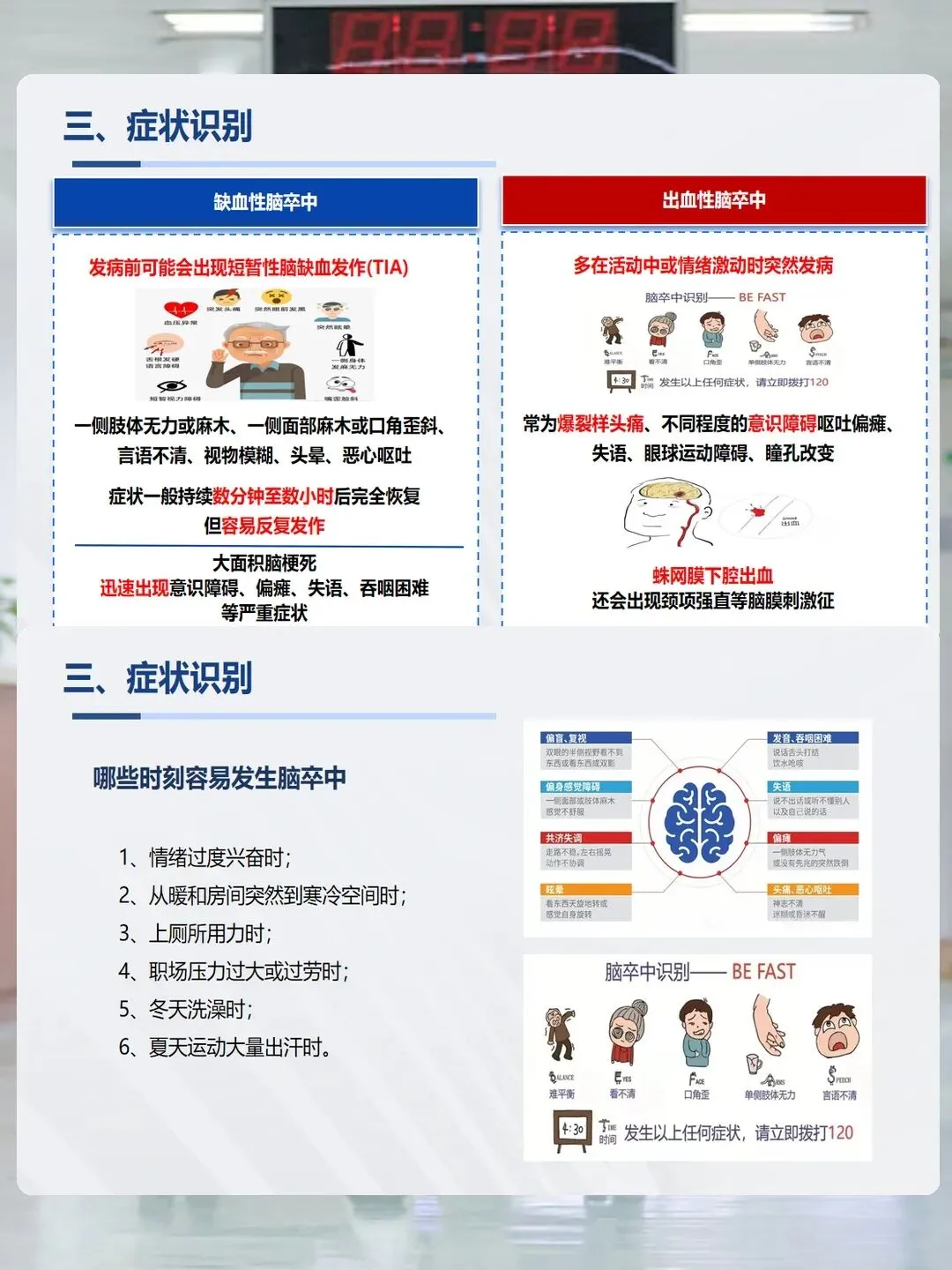 需要注意的是,出血性脑卒中多在活动或情绪激动时发病,常伴有爆裂样头痛、呕吐;缺血性脑卒中发病前可能有短暂头晕、肢体麻木等前兆,症状可能持续数分钟后恢复,但极易复发,不能忽视。另外,情绪激动、突然受凉、用力排便、过度劳累等时刻,都是脑卒中的高发时段,要格外警惕。
