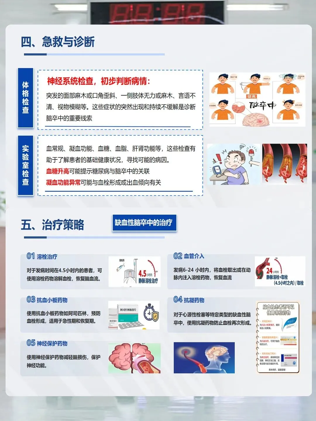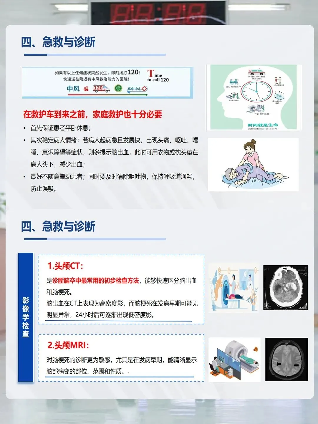 一旦发现疑似症状,急救要抓住“黄金时间”。首先让患者平卧休息,不要随意搬动,清除呕吐物保持呼吸道通畅;如果患者有头痛、嗜睡等症状,可能是脑出血,可用衣物垫高头部。同时立即拨打120,送往有卒中救治能力的医院。缺血性脑卒中在发病4.5小时内可进行溶栓治疗,6-24小时内可进行血管介入取栓,时间越短,康复希望越大。