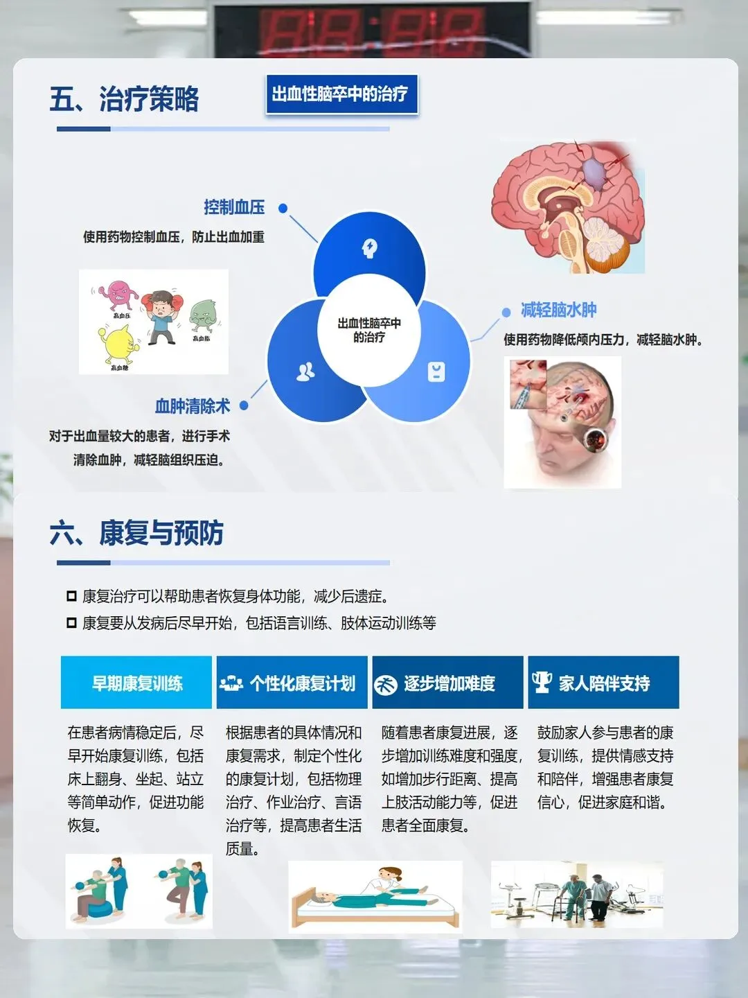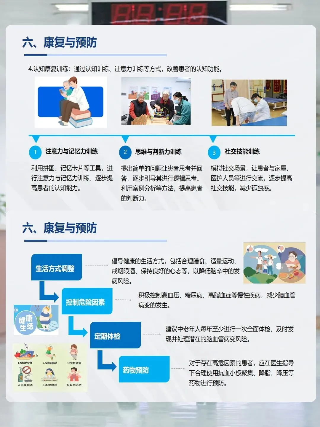 治疗后,康复训练也很重要。病情稳定后要尽早开始,包括肢体功能训练、日常生活能力训练、语言康复和认知训练,家人的陪伴和支持能让患者更有信心。预防脑卒中,关键在于调整生活方式:合理饮食、适量运动、戒烟限酒、保持良好心态;积极控制高血压、糖尿病等基础病;中老年人定期体检,高危人群可在医生指导下用药预防。