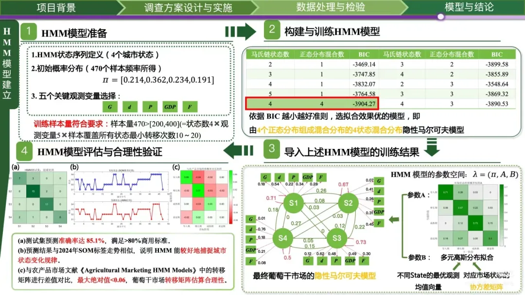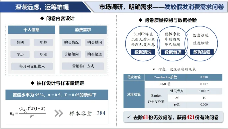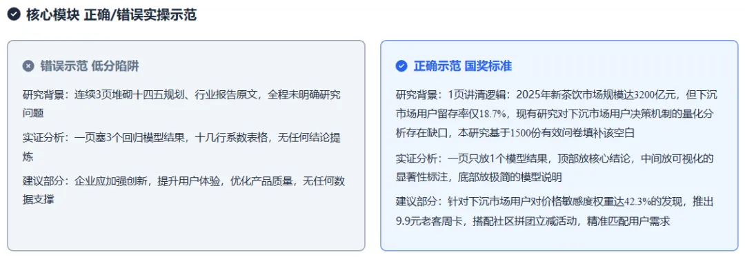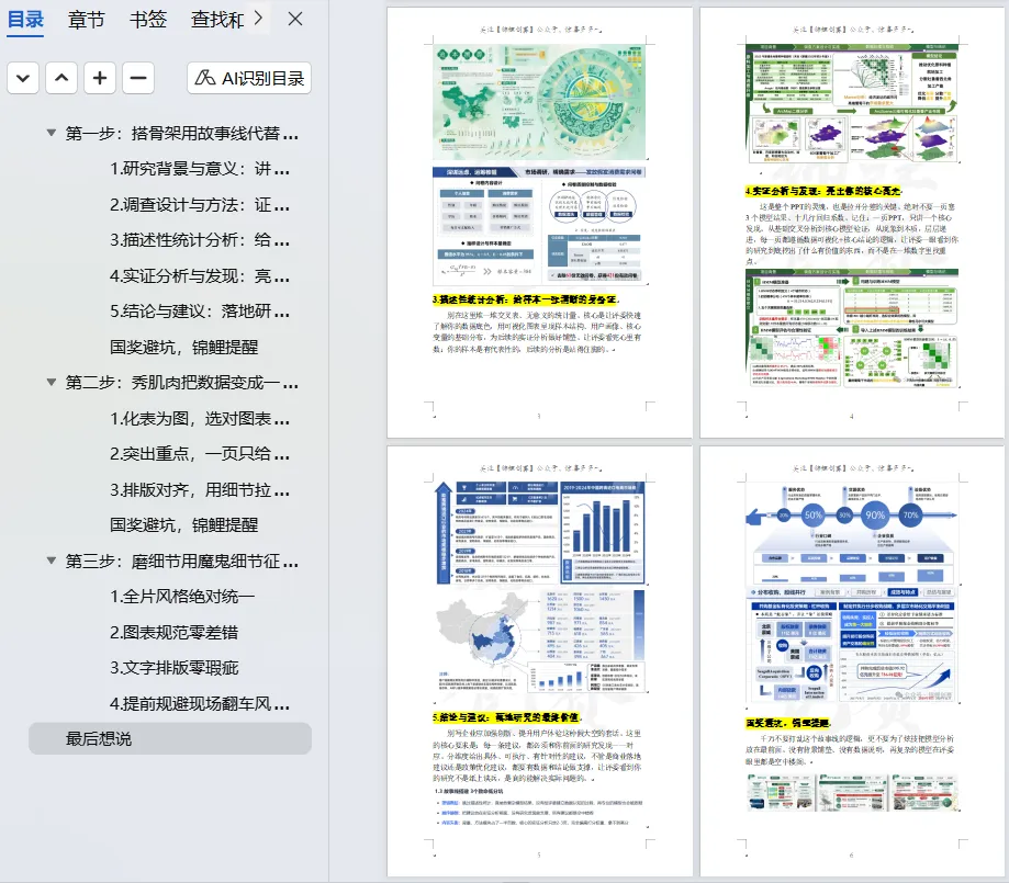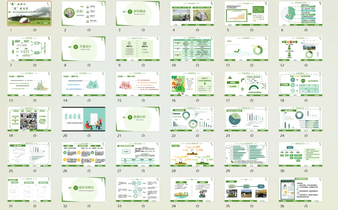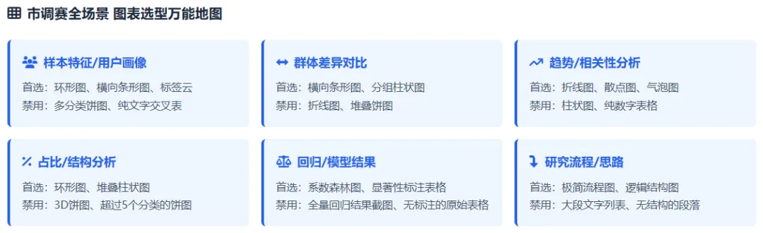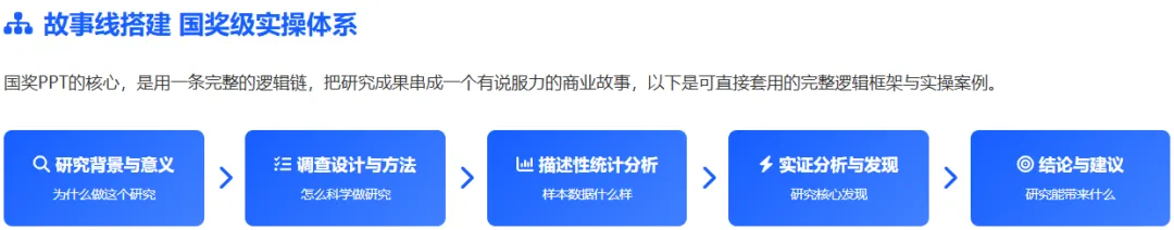 我的调研设计、数据模型都做得很扎实,为什么PPT一提交就被刷,连省赛都冲不出去?几万字的调研报告直接复制粘贴,一页PPT塞几百个字,密密麻麻的表格堆在一起,连核心结论都藏在字里行间。评委一天要看上百份作品,根本没功夫在你的PPT里找亮点。市调赛的PPT,从来不是报告的搬家工具,而是你征服评委的核心武器。现在就把带过数十支国奖队伍的PPT制作心法全部分享给你,从骨架搭建、数据可视化到细节打磨,全是评委视角的高分逻辑,没有半句废话,看完就能直接落地。90%的同学踩的第一个坑,就是把PPT做成了报告缩减版。大段复制正文、堆砌研究内容,看似内容饱满,实则毫无逻辑,评委扫一眼就会划走。市调赛的评委,不是来阅卷的,是来听你讲一个完整、严谨、有说服力的商业调研故事的。你的PPT必须有一条清晰的故事线,带着评委跟着你的思路走,让他从为什么做这个研究,到研究发现了什么,再到这个研究有什么价值,全程跟着你的逻辑走,没有任何理解门槛。这里给你一套国奖队伍通用的五段式故事线框架,适配99%的市调赛选题,直接套用就能避开逻辑混乱的坑:别在这里堆砌政策文件、行业报告的套话。只用1-2页,从宏观的社会/行业痛点切入,精准落到当前市场的研究空白,最终点明你的研究到底要解决什么核心问题。目标只有一个:让评委看完立刻明白,这个研究有价值、有必要,不是为了参赛而凑数。别大段摘抄问卷设计、抽样方法的教科书定义。这里的核心是向评委证明,你的研究没有硬伤。用极简的流程图、逻辑图,讲清你的调查对象、抽样逻辑、数据清洗标准和模型选择依据,让评委一眼看懂你是怎么科学地完成这次调研的,打消对数据有效性的顾虑。别在这里堆一堆交叉表、无意义的统计量。核心是让评委快速了解你的数据底色,用可视化图表呈现样本结构、用户画像、核心变量的基础分布,为后续的实证分析做好铺垫。让评委看完心里有数:你的样本是有代表性的,后续的分析是站得住脚的。这是整个PPT的灵魂,也是拉开分差的关键。绝对不要一页塞3个模型结果、十几行回归系数。记住:一页PPT,只讲一个核心发现。从基础交叉分析到核心模型验证,从现象到本质,层层递进,每一页都遵循数据可视化+核心结论的逻辑,让评委一眼看到你的研究到底挖出了什么有价值的东西,而不是在一堆数字里找重点。别写企业应加强创新、提升用户体验这种假大空的套话。这里的核心要求是:每一条建议,都必须和你前面的研究发现一一对应。分维度给出具体、可执行、有针对性的建议,不管是商业落地建议还是政策优化建议,都要有数据和结论做支撑,让评委看到你的研究不是纸上谈兵,是真的能解决实际问题的。千万不要打乱这个故事线的逻辑,更不要为了炫技把模型分析放在最前面。没有背景铺垫、没有数据说明,再复杂的模型在评委眼里都是空中楼阁。如果说故事线是PPT的骨架,那数据可视化就是PPT的肌肉。很多同学的PPT,把Excel表格直接截图粘贴,密密麻麻的数字堆在一起,评委连核心数据都找不到,再亮眼的发现也白搭。记住数据可视化的黄金原则:能用图,不用表;能用表,不用字。你的目标不是把所有数据都放上去,而是让评委在3秒内,捕捉到你想传递的核心信息。分享3个国奖级可视化的核心技巧,零基础也能直接用:把密密麻麻的表格,转化为更直观的可视化图表,同时绝对不要乱选图表。这里给你一套万能适配逻辑:对比类数据用柱状图/条形图,趋势类数据用折线图,占比类数据用环形图/饼图(分类不超过5个),分布类数据用散点图/直方图。杜绝花里胡哨的3D图表、复合图表,极简的商务风永远不会出错。很多同学喜欢把整页数据都加粗、变色,最后等于全没重点。正确的做法是:一页只突出一个核心数据、一个关键结论。对核心数值用放大、变色、加标注的方式强化,其他辅助信息弱化处理,让评委的视线第一时间落在你最想让他看到的地方。一页PPT里的多个图表,必须保证尺寸统一、边界对齐、间距一致,杜绝东一个西一个的杂乱排版。用好PPT的参考线和对齐功能,让页面元素有秩序、不拥挤,哪怕只是基础的柱状图,整齐规范的排版也能瞬间让你的PPT比别人更专业。不要为了可视化而可视化。所有的图表都要为你的结论服务,和核心发现无关的图表,哪怕做得再好看,也要果断删掉。冲到省赛、国赛的队伍,调研和模型水平都不会差,最终拉开分差的,往往是那些看似不起眼的细节。这些细节,恰恰是评委判断你专业度、严谨度的核心标准。这4个细节,只要你做到位,就能瞬间甩开80%的参赛队伍:这是最基础、也最容易被忽略的点。全篇PPT的字体、字号、配色、标题层级必须严格统一。字体建议中文用思源黑体/微软雅黑,英文和数字用新罗马字体,全篇标题、正文字号固定,不要忽大忽小;配色主色不超过3种,优先用学校VI色或行业适配的低饱和度配色,杜绝彩虹色;标题的位置、格式、层级全程一致,不要一会居中一会左对齐。所有图表必须配有清晰的编号、标题和数据来源,比如图1XX群体消费频次分布数据来源:本次实地调研,绝对不能只放一张光秃秃的图;去掉图表里多余的网格线、边框、冗余图例,只保留核心信息;坐标轴、计量单位必须标注清晰,杜绝出现无单位、无维度的无效图表。正文内容必须用两端对齐,杜绝参差不齐的换行;严格控制