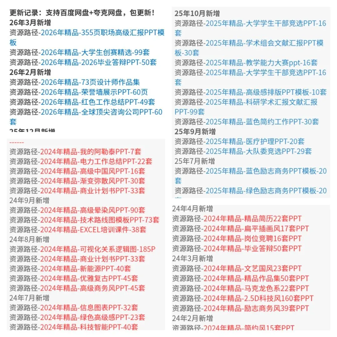 如果你从未在学习上为自己投资过,那么是否应该开始这最值得的一次呢?模板资料深受粉丝的广泛好评已更新3000+份精品PPT这些模板中,许多是全网首发,为您的展示增添了别样的风格!不管是工作总结、论坛会议、内容展示,还是其他场合,这份合集都能帮助您事半功倍!每套模板都是经过小编精挑细选来的,杜绝垃圾模板,每套都包含预览图,由于篇幅限制,仅仅截取了部分PPT展示效果图,发送您的链接包含以上全部内容。下面我们来看看部分PPT模板的具体内容,希望你能喜欢。这些模板不仅设计精美、风格清新,而且非常适合各种场合的演示需求,无论是工作汇报、学术演讲还是个人分享,都能帮你轻松打造出专业而吸引人的演示文稿。