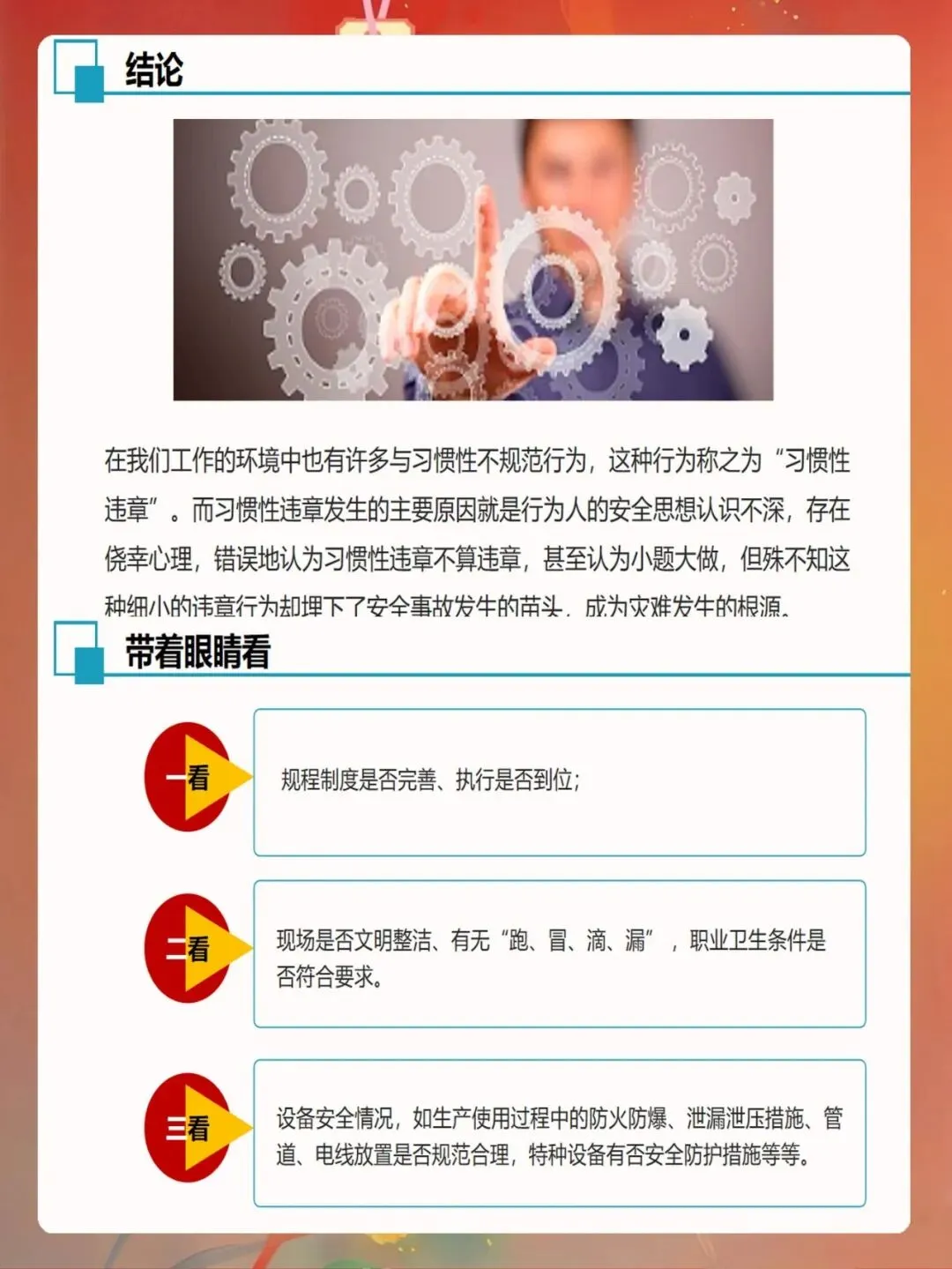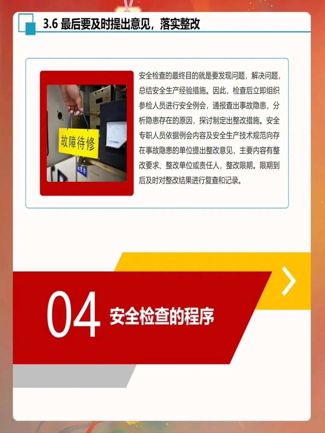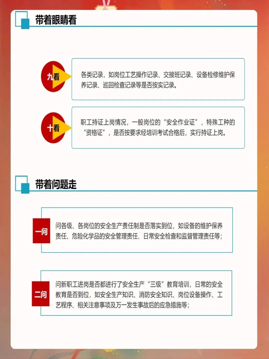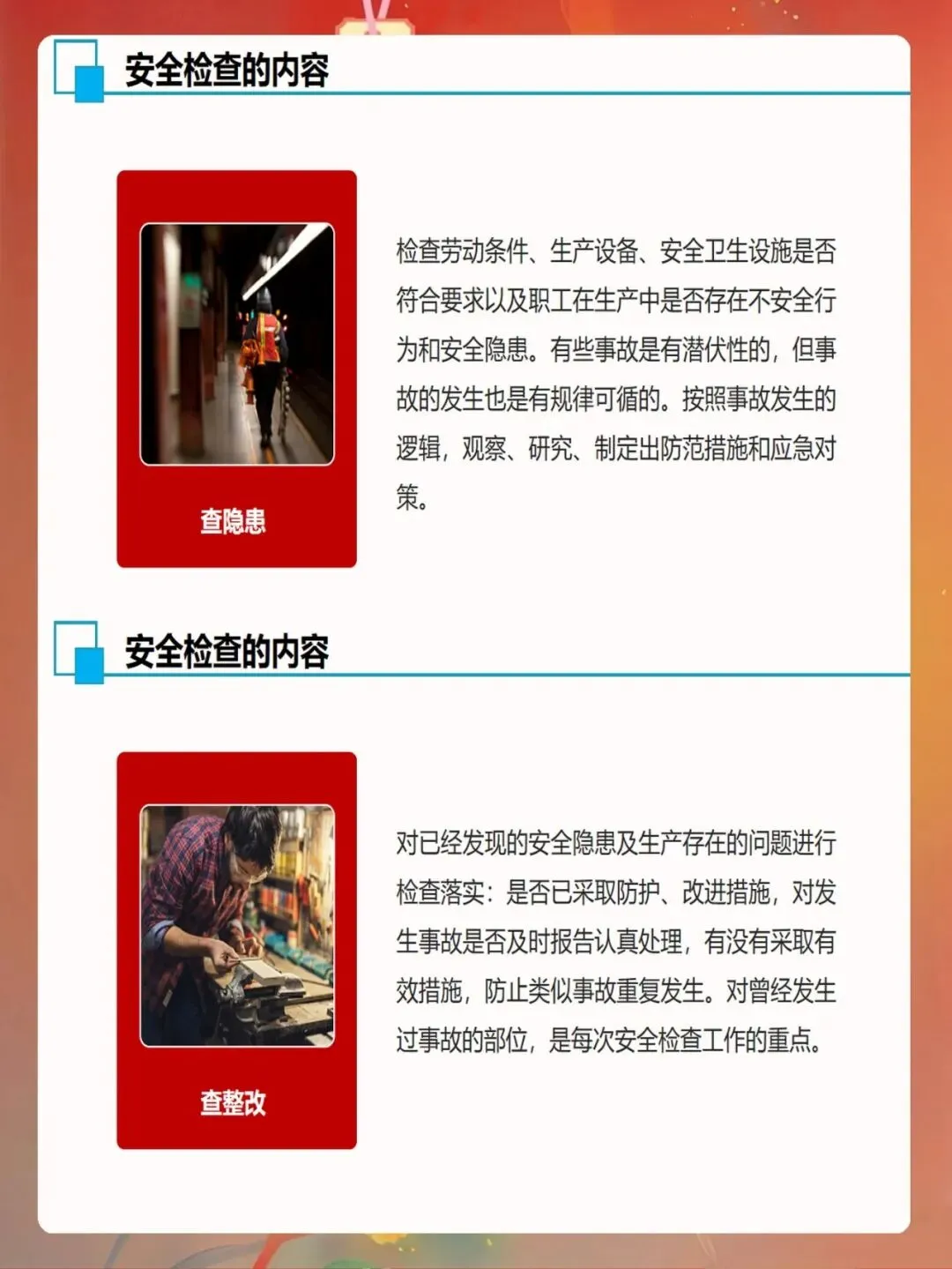 安全检查要注重实效,不能流于形式。检查人员要深入现场,仔细观察,不能只听汇报、只看记录。检查要覆盖所有区域和环节,不能有死角。检查发现的问题要如实记录,不能隐瞒不报。整改要求要明确具体,不能含糊不清。复查要认真到位,不能走过场。只有做到这些,安全检查才能真正发挥作用。