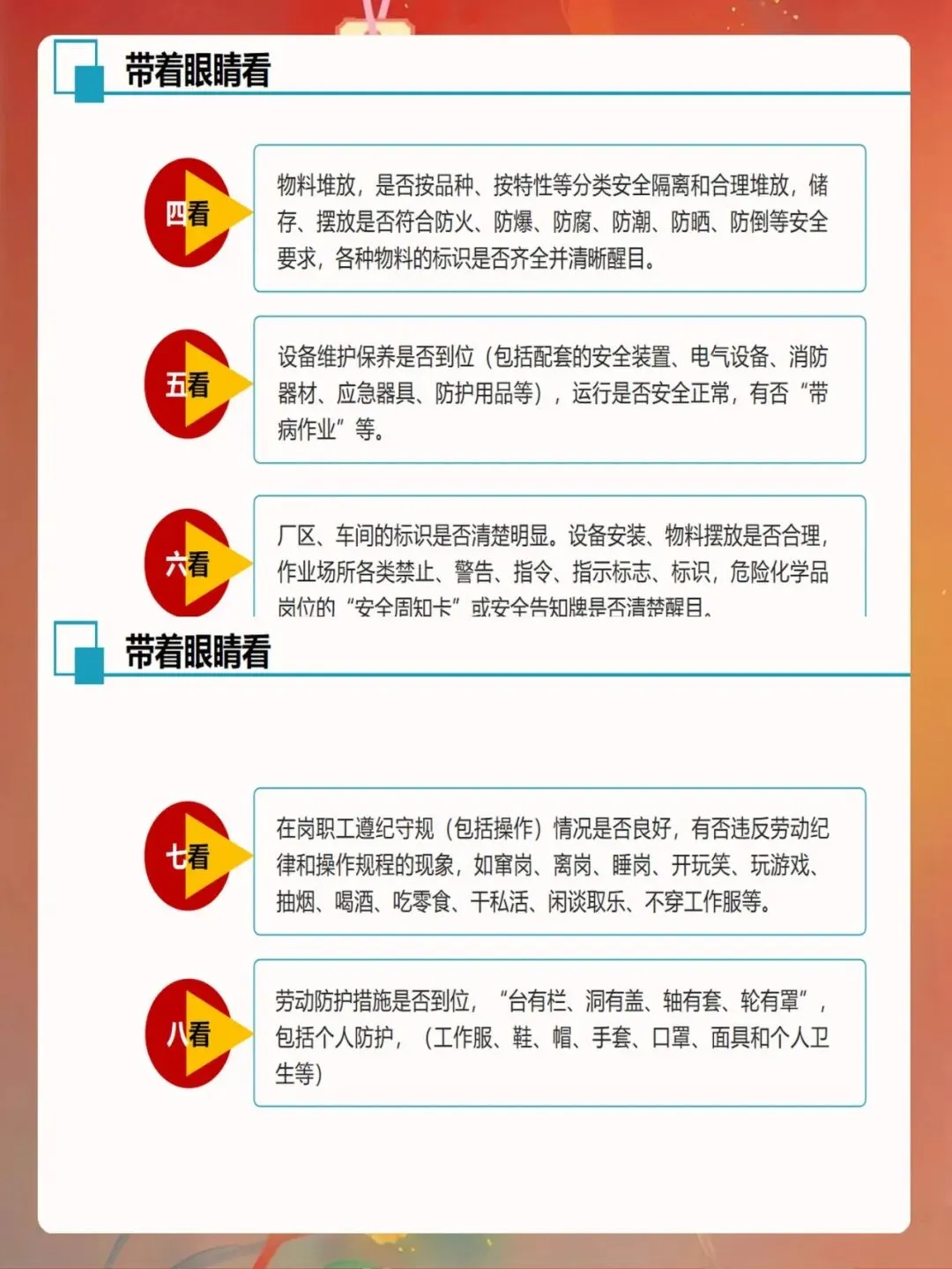 现场检查要采用科学的方法。可以采用看、听、闻、问、测等多种方法结合。看就是观察现场的环境状况、设备状态、作业行为。听是听设备运行的声音是否正常。闻是闻是否有异常气味,比如电气焦味、气体泄漏等。问是询问作业人员关于设备使用、异常情况、操作规程执行情况等。测是使用检测仪器测量相关参数,比如噪声、粉尘浓度、气体浓度等。多种方法综合运用,才能全面掌握现场情况。
