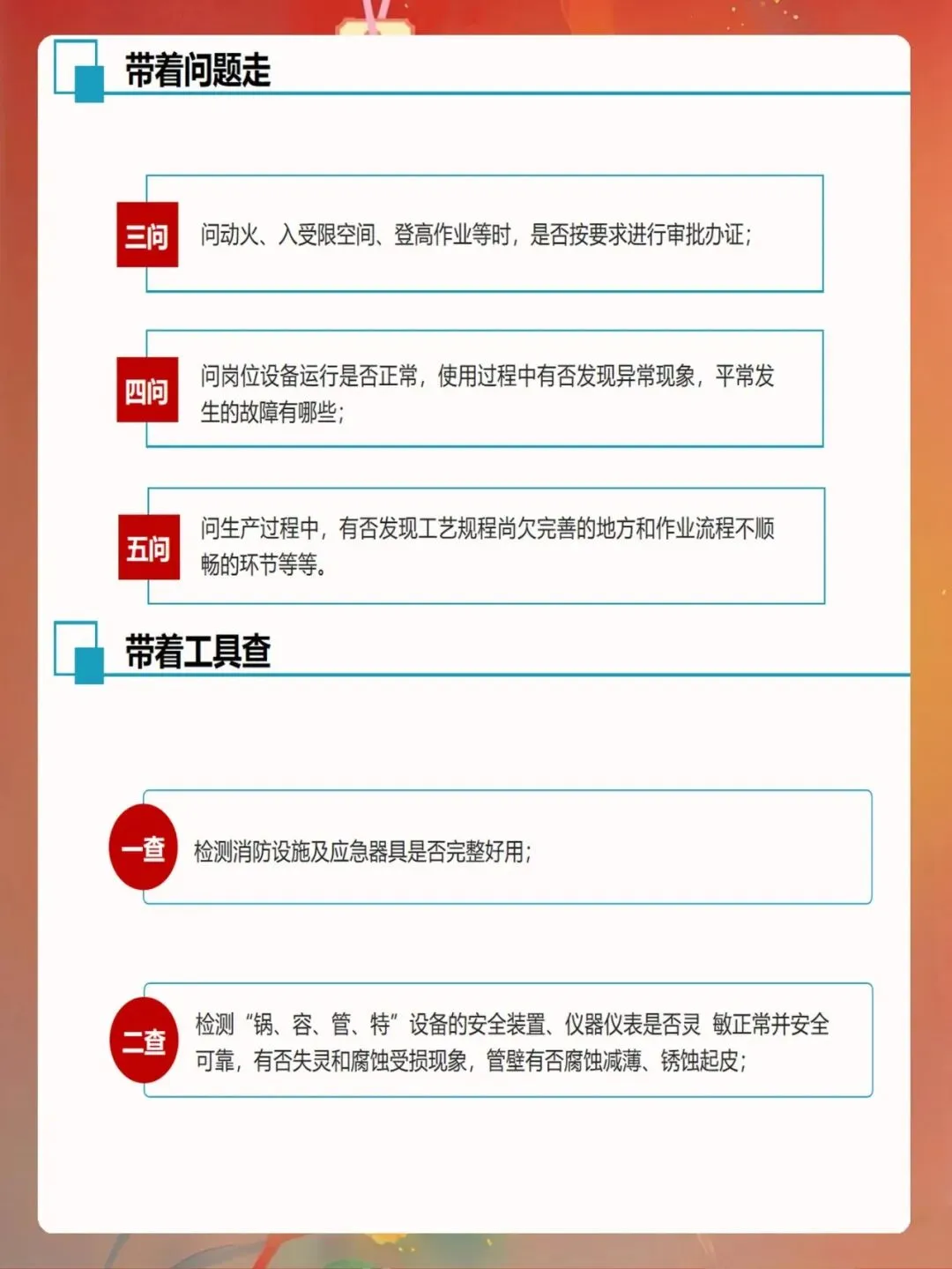 安全检查不是简单地走走看看,而是一项专业性很强的工作。首先要明确检查的目的和范围。每次检查都要有明确的主题,是针对特定设备、特定作业还是特定场所。检查范围要清晰界定,避免遗漏关键环节。检查前要制定详细的检查表,列出检查内容、检查方法、判定标准等。检查表的制定要结合企业实际,充分考虑行业标准、法规要求和企业特点,不能照搬照抄。