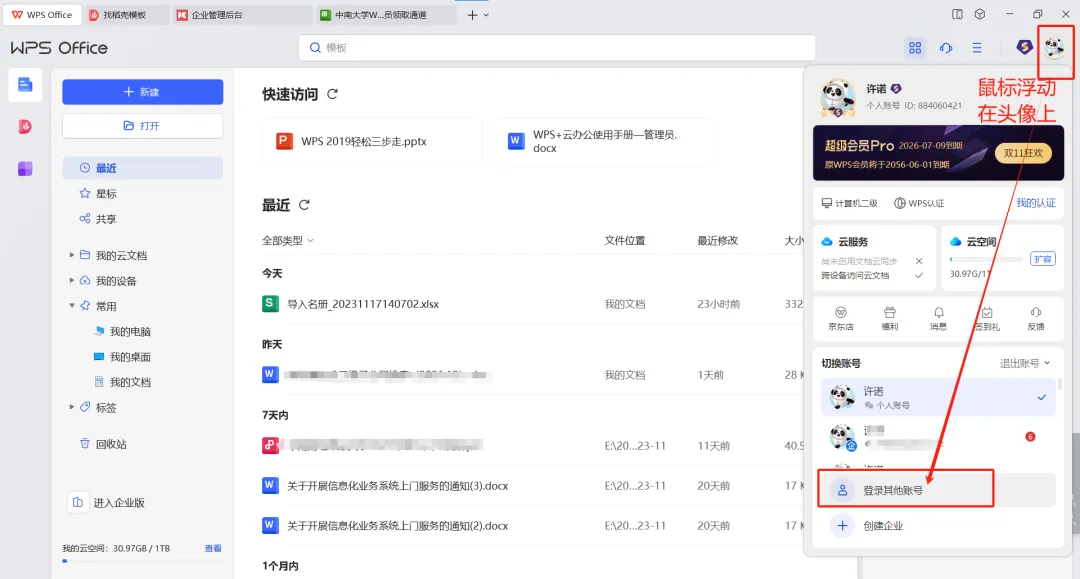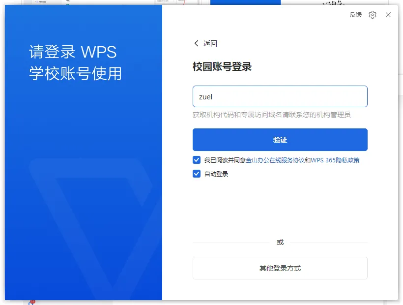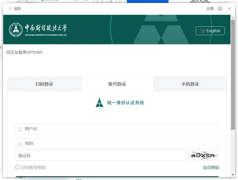 打开WPS,点击登录其他账号,选择专属账号(sso)输入zuel,输入学工号密码,左上角出现“中南财经政法大学”登录成功。