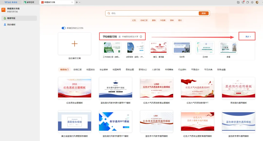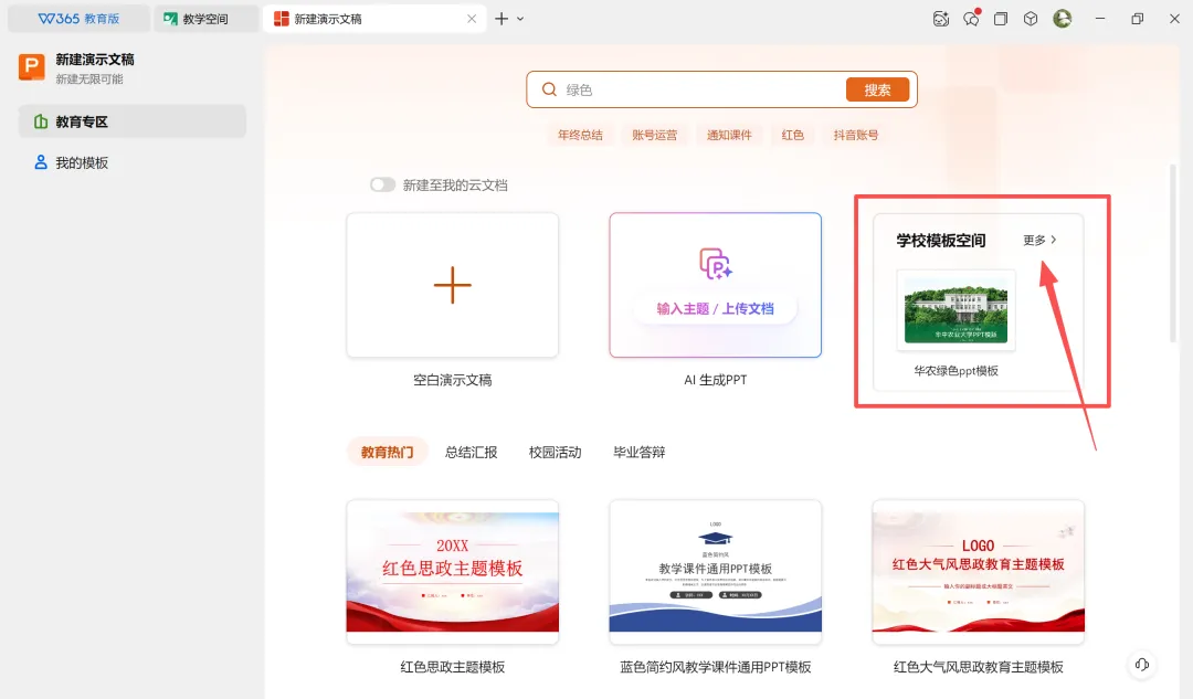 方法一:点击【新建】-【PPT】,选择【学校模板空间】,点击喜欢的模板即可编辑使用。