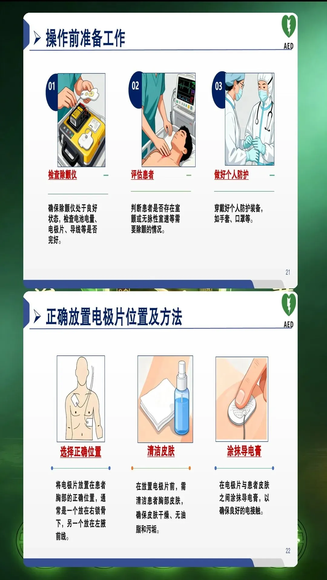 常见误区: 有些护士习惯将电极片放在胸骨上或距离过近,导致电流无法有效穿过心脏;有些则将电极片放置在乳房组织上(女性患者),影响电流传导。