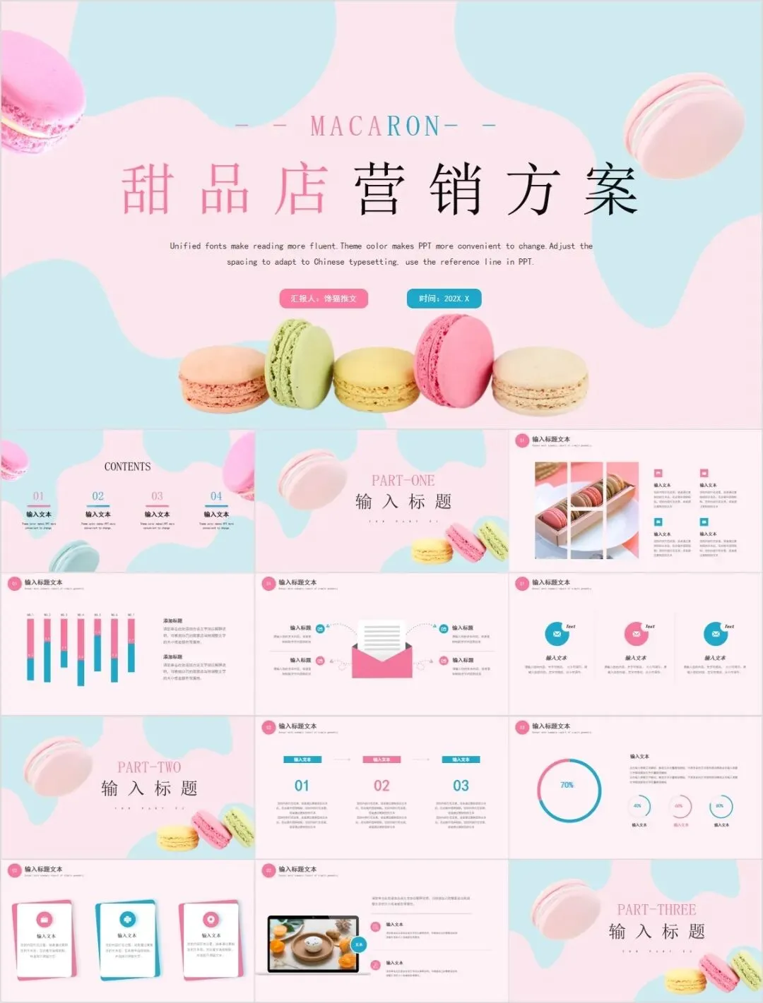 马卡龙配色是一种非常流行的配色方案,它采用了多种鲜艳的颜色,如粉红色、紫色、蓝色、黄色等,通常被用于时尚、艺术、美食等领域。这份马卡龙配色ppt模板合集采用了这种配色方案,为演示文稿增添了生动、活泼的气息。