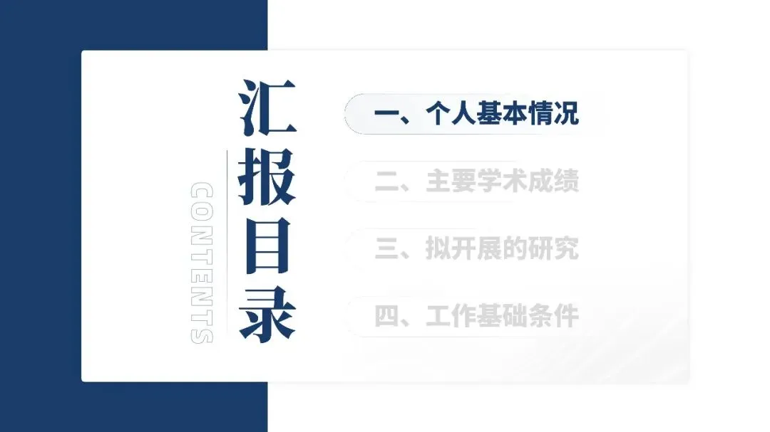一、开篇框架:锚定核心导航全程封面简洁凝练呈现项目名称、答辩类型、申报主体与负责人等核心信息,无多余赘述;紧随其后展示个人基本情况、主要学术成绩、拟开展的研究、工作基础条件四大核心提纲,且各章节开头重复呈现该提纲,形成固定导航体系,让评审快速建立 PPT 整体脉络认知,精准明确各部分内容定位与研究逻辑。