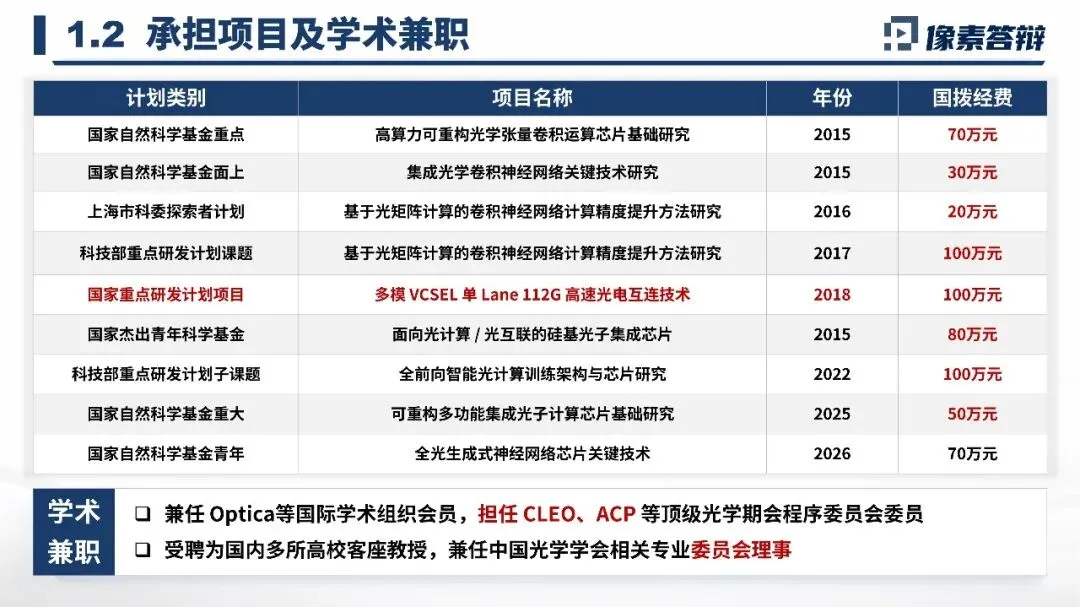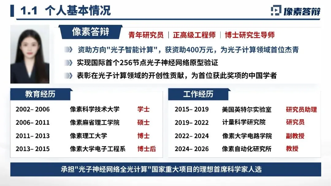 实力背书按基本信息、教育经历、工作经历、承担项目及学术兼职的顺序依次展开,时间线清晰连贯,仅展示与光子智能计算、光子矩阵运算芯片研究相关的光电、电子工程专业背景和科研工作经历,精准匹配本项目研究方向,直接证明申报人专业能力与项目高度契合,为研究开展提供坚实的人才能力支撑。