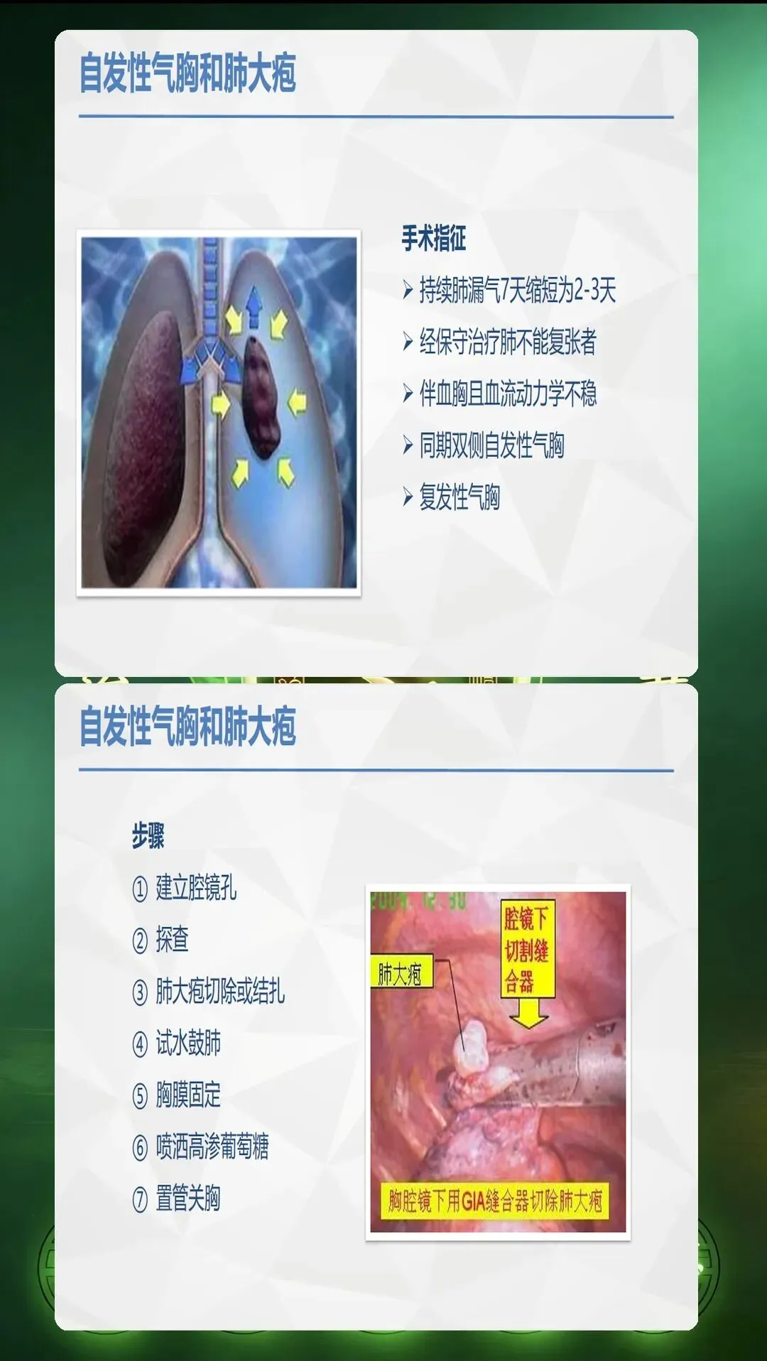 肺大疱切除术是胸腔镜最早应用的手术之一,操作相对简单,疗效确切。对于自发性气胸患者,胸腔镜下肺大疱切除联合胸膜固定术,已成为标准治疗方案,复发率低于开胸手术。