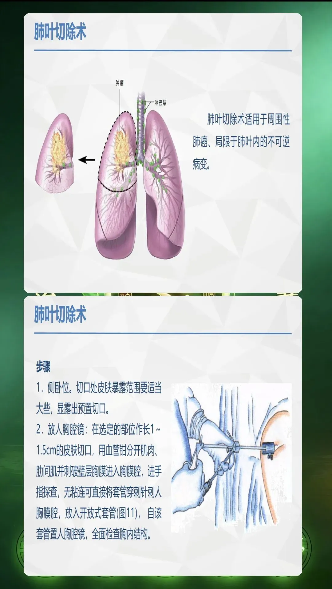 肺结节切除是当前的热点。随着低剂量CT筛查的普及,肺结节检出率大幅提高。胸腔镜下肺楔形切除、肺段切除、肺叶切除,根据结节位置和病理类型选择不同术式。术中定位技术的改进,如Hookwire定位、荧光染色,提高了微小结节的切除准确率。