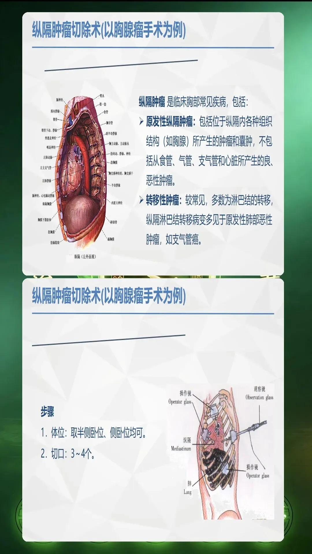 纵隔肿瘤的微创治疗是胸腔镜的另一重要领域。前纵隔肿瘤,特别是胸腺瘤,胸腔镜下完整切除可以达到与开胸手术相同的根治效果。对于重症肌无力患者,微创手术减少了对呼吸功能的影响,术后恢复更为顺利。
