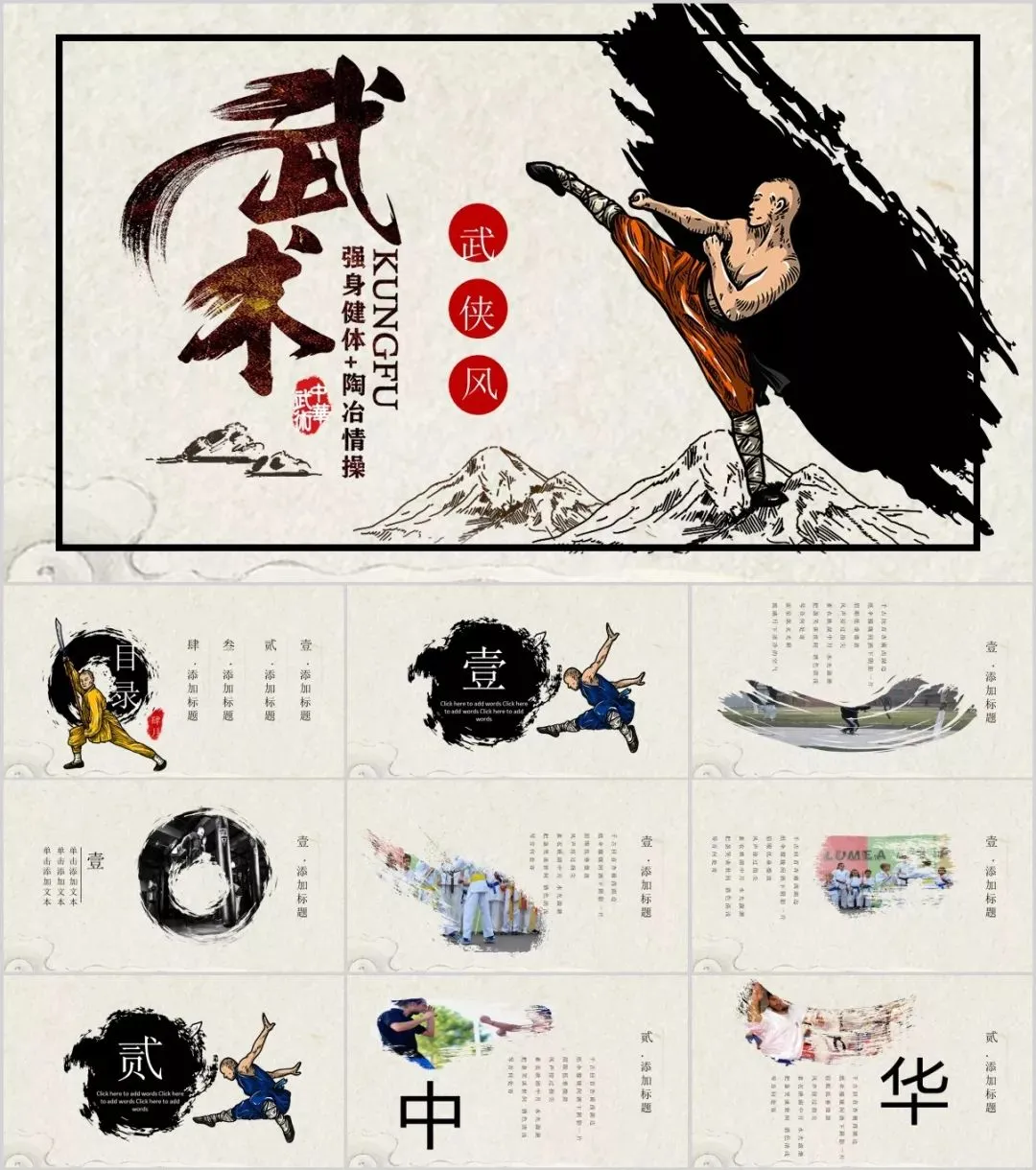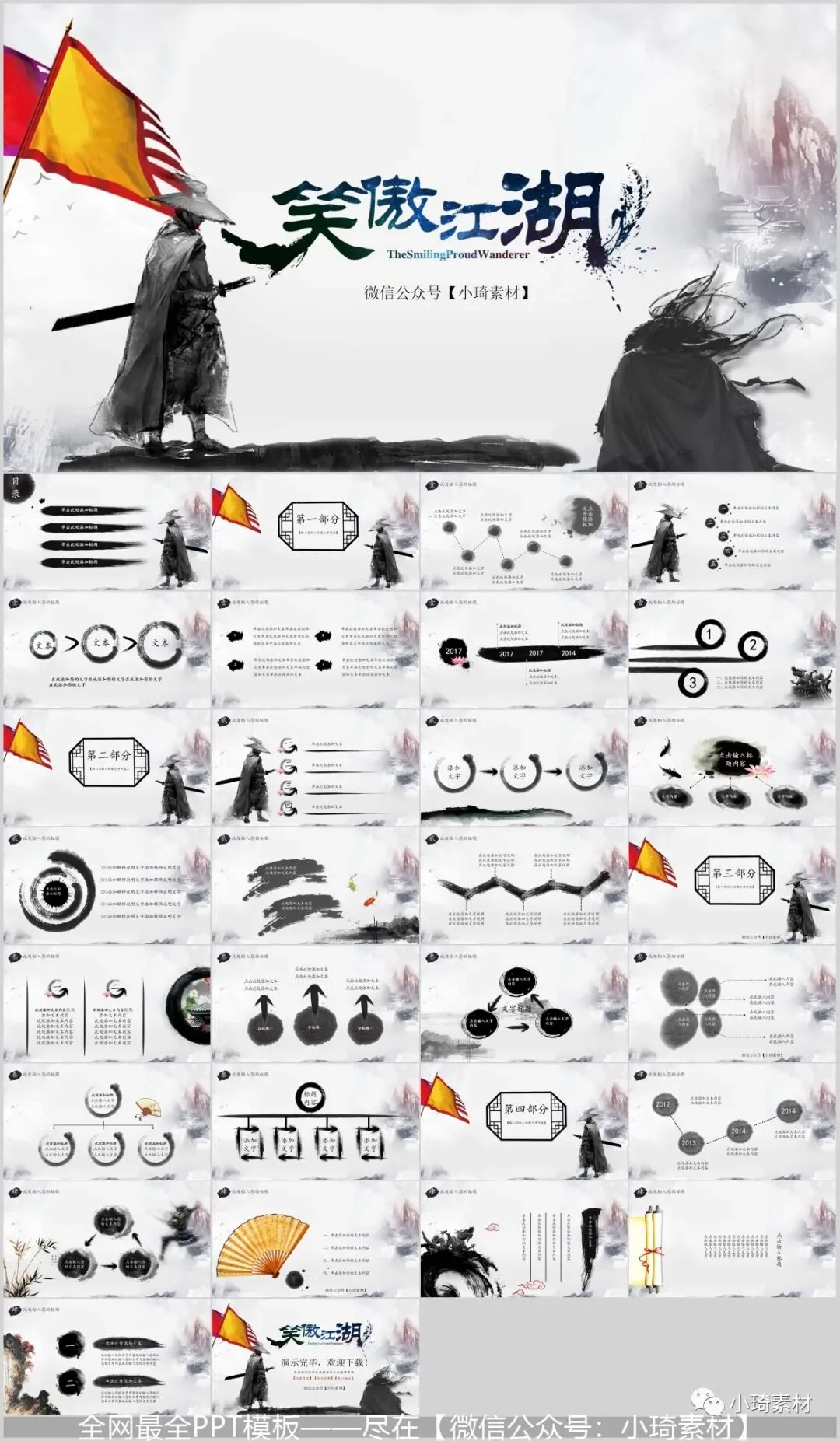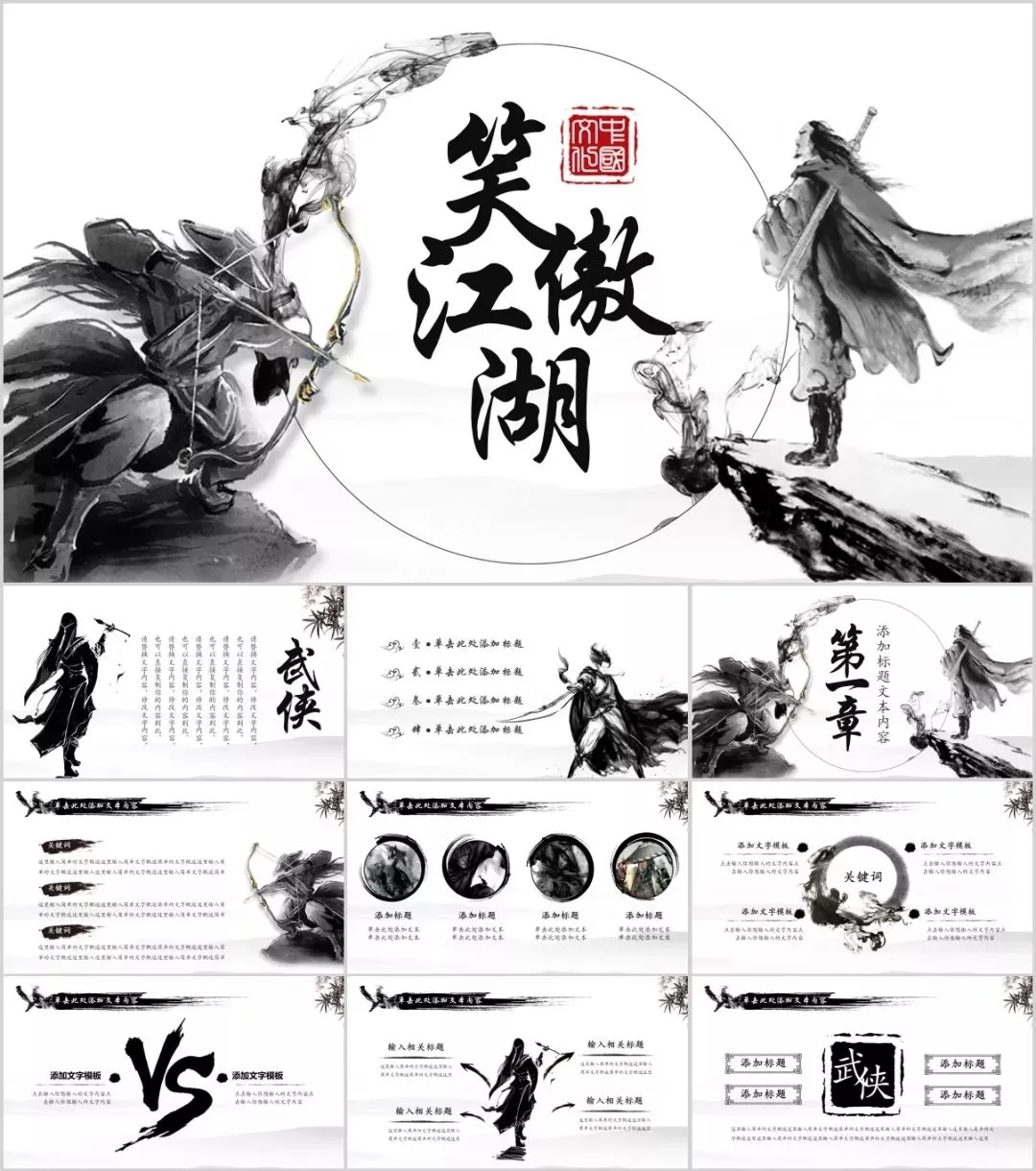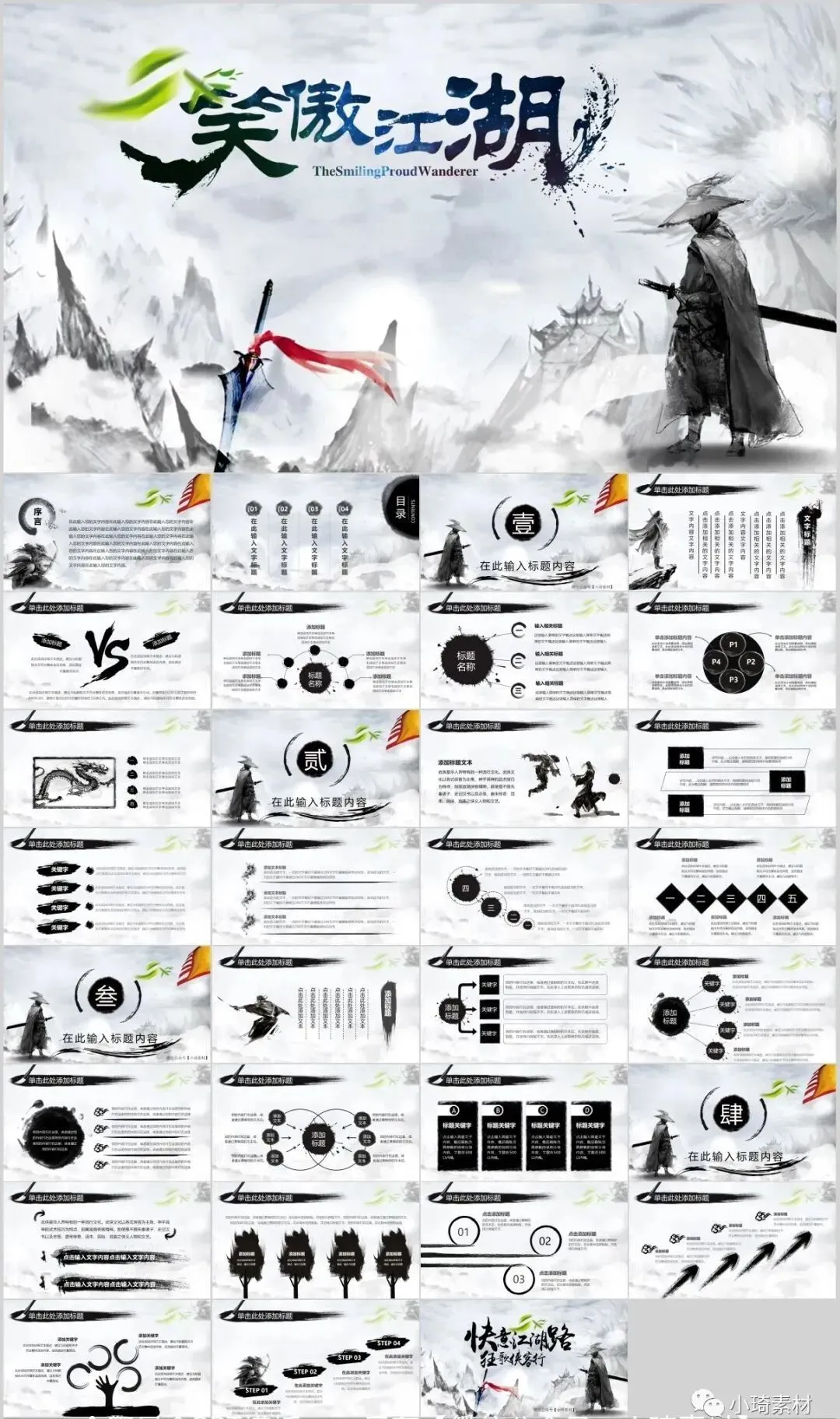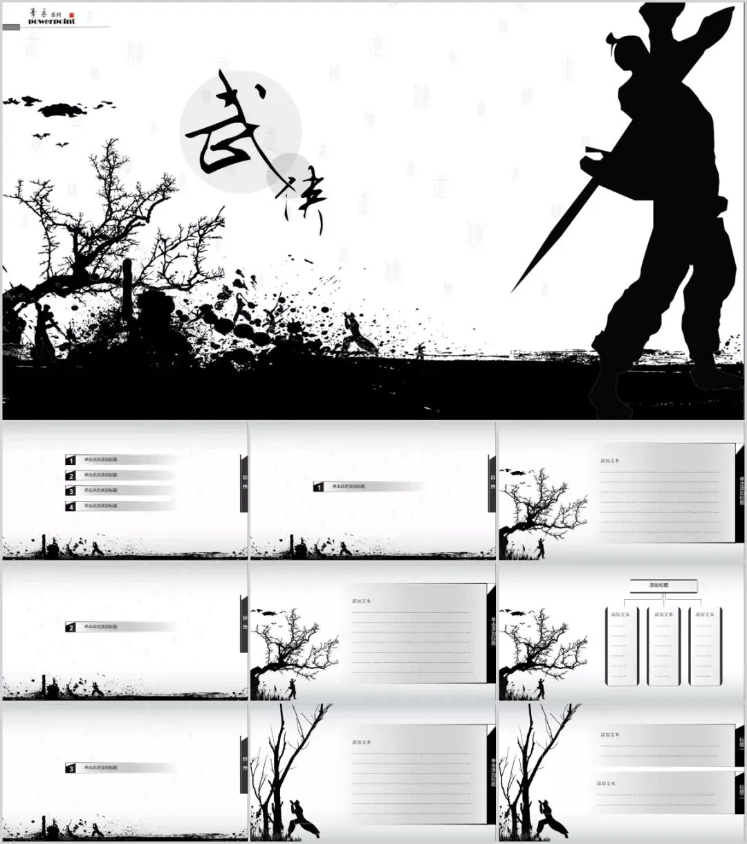 今天有小琦主编给大家分享的是是32套水墨武侠风PPT模板,适用于多种范围:个人简历、活动策划、课件演示、毕业答辩、作业制作、工作汇报、计划总结、项目介绍、商业计划、企业招聘、产品发布等等。