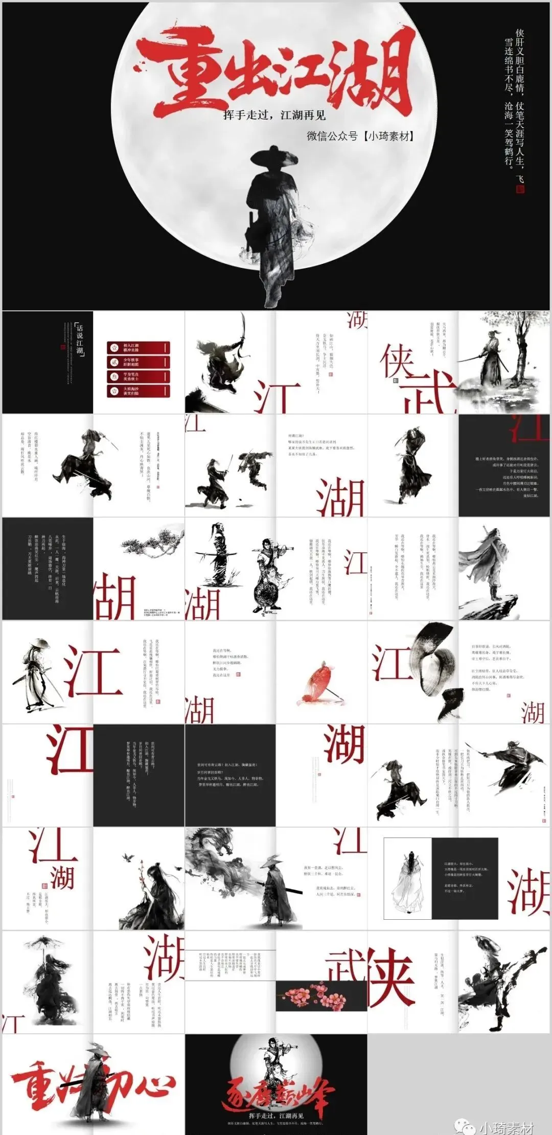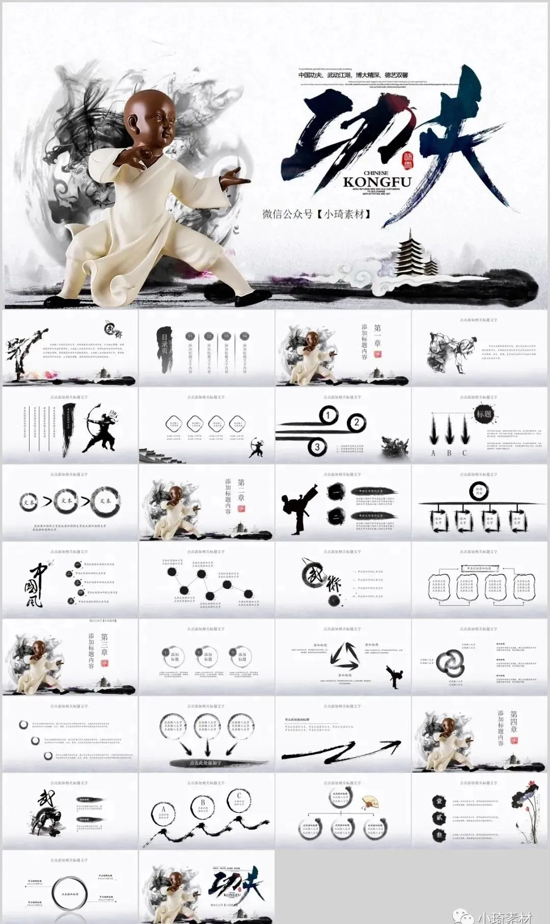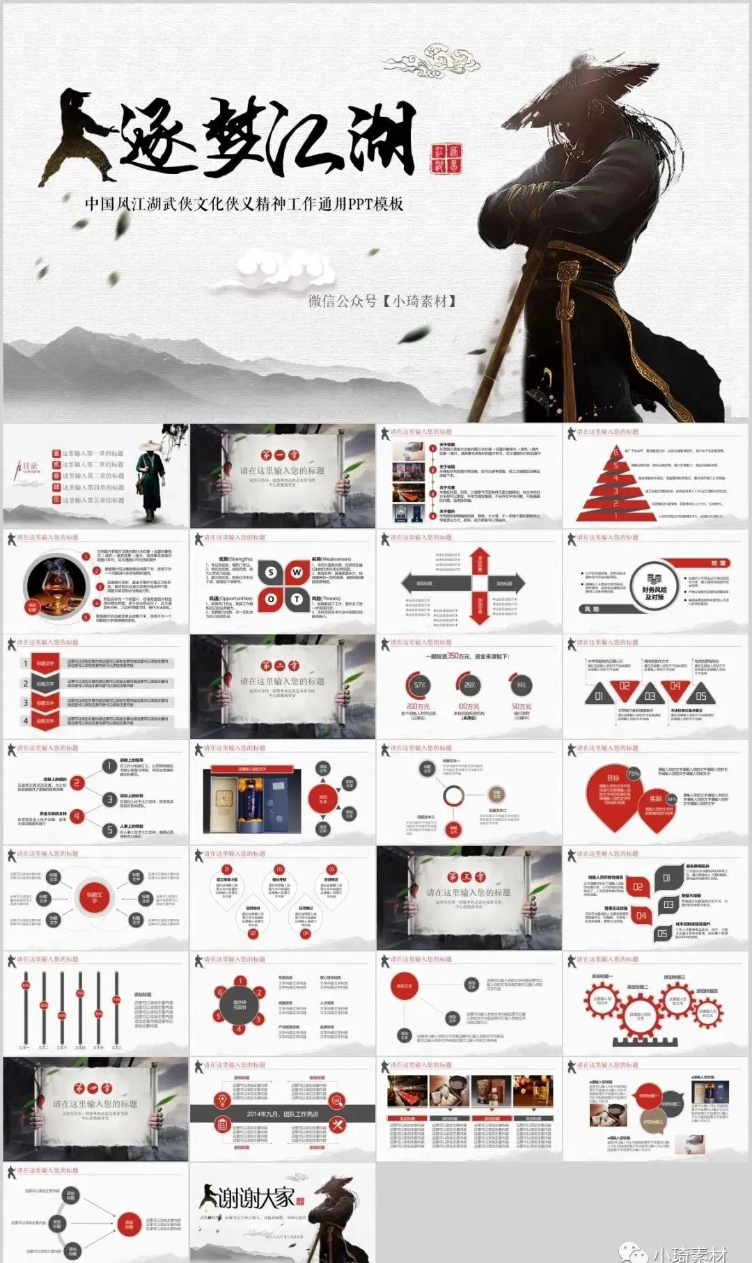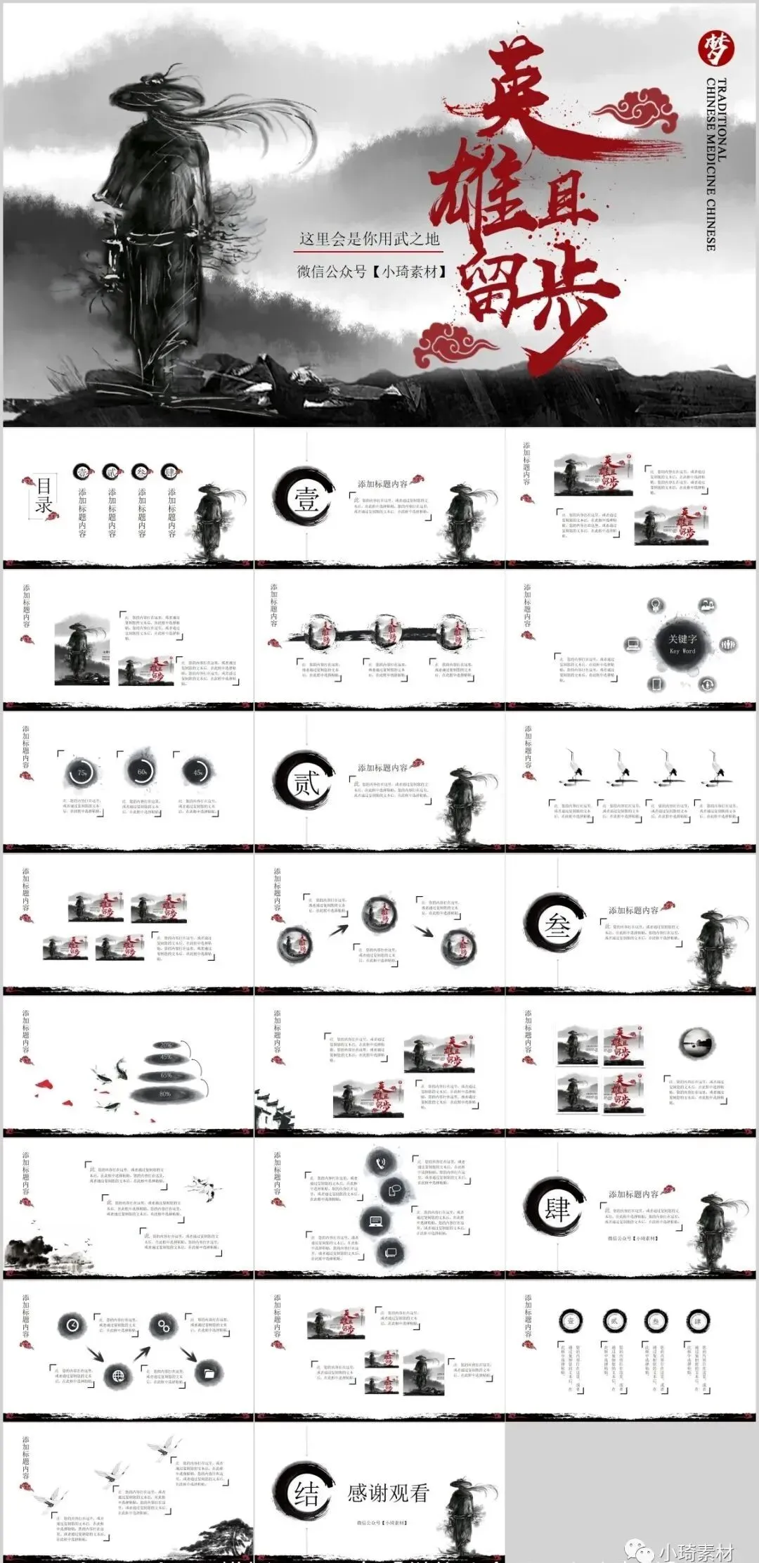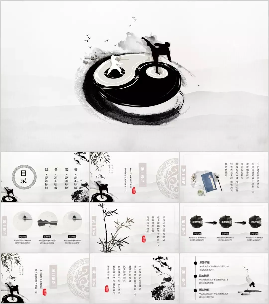 今天有小琦主编给大家分享的是是32套水墨武侠风PPT模板,适用于多种范围:个人简历、活动策划、课件演示、毕业答辩、作业制作、工作汇报、计划总结、项目介绍、商业计划、企业招聘、产品发布等等。