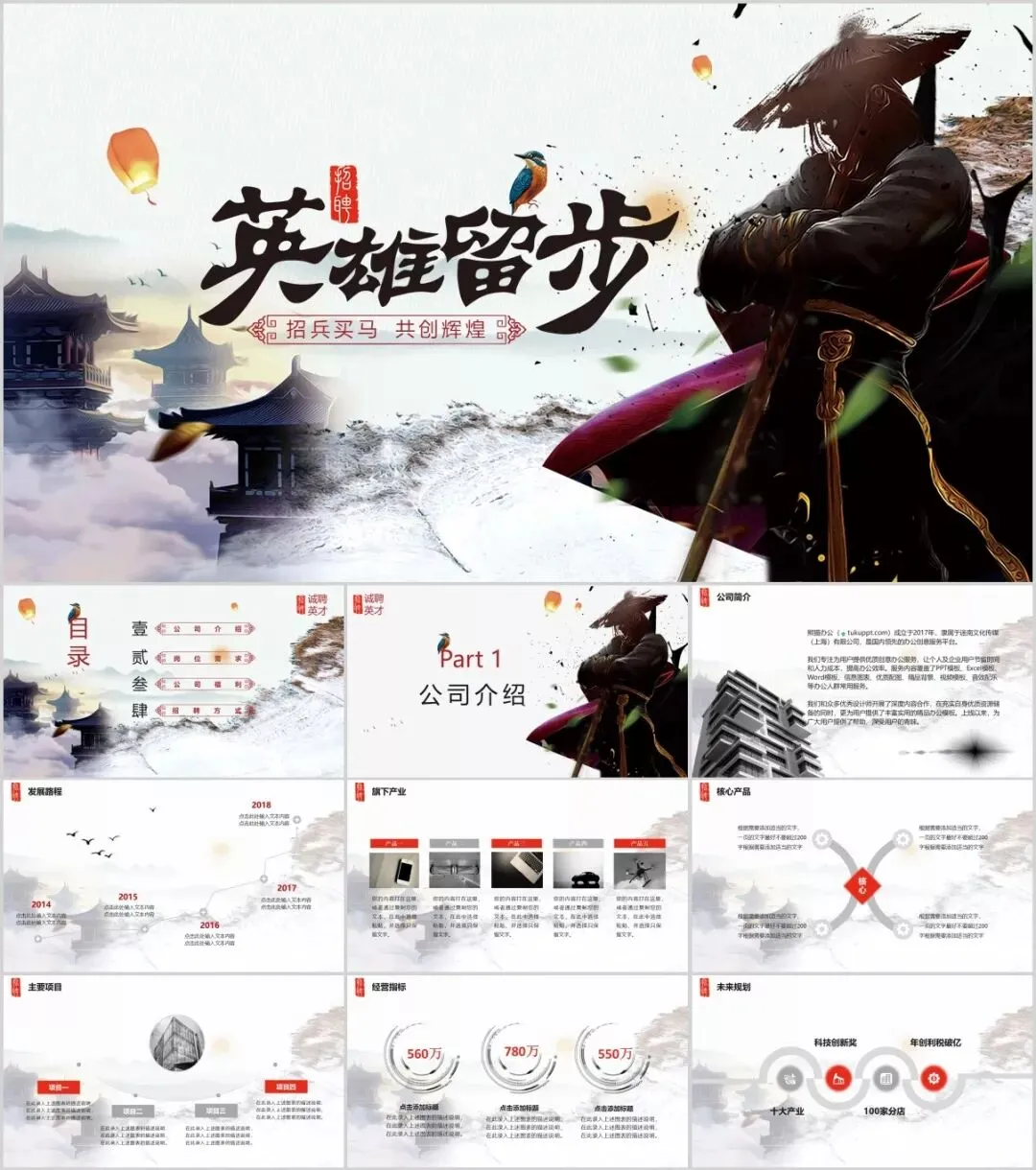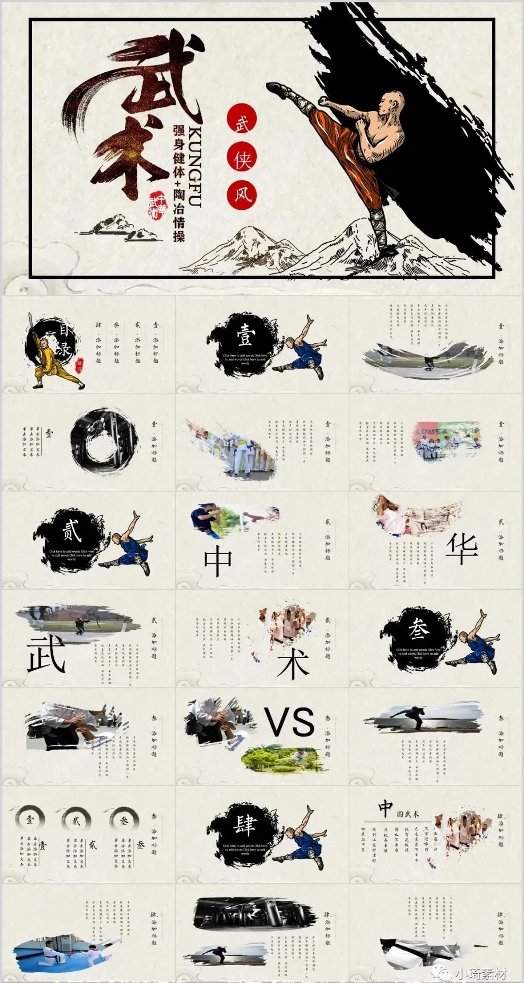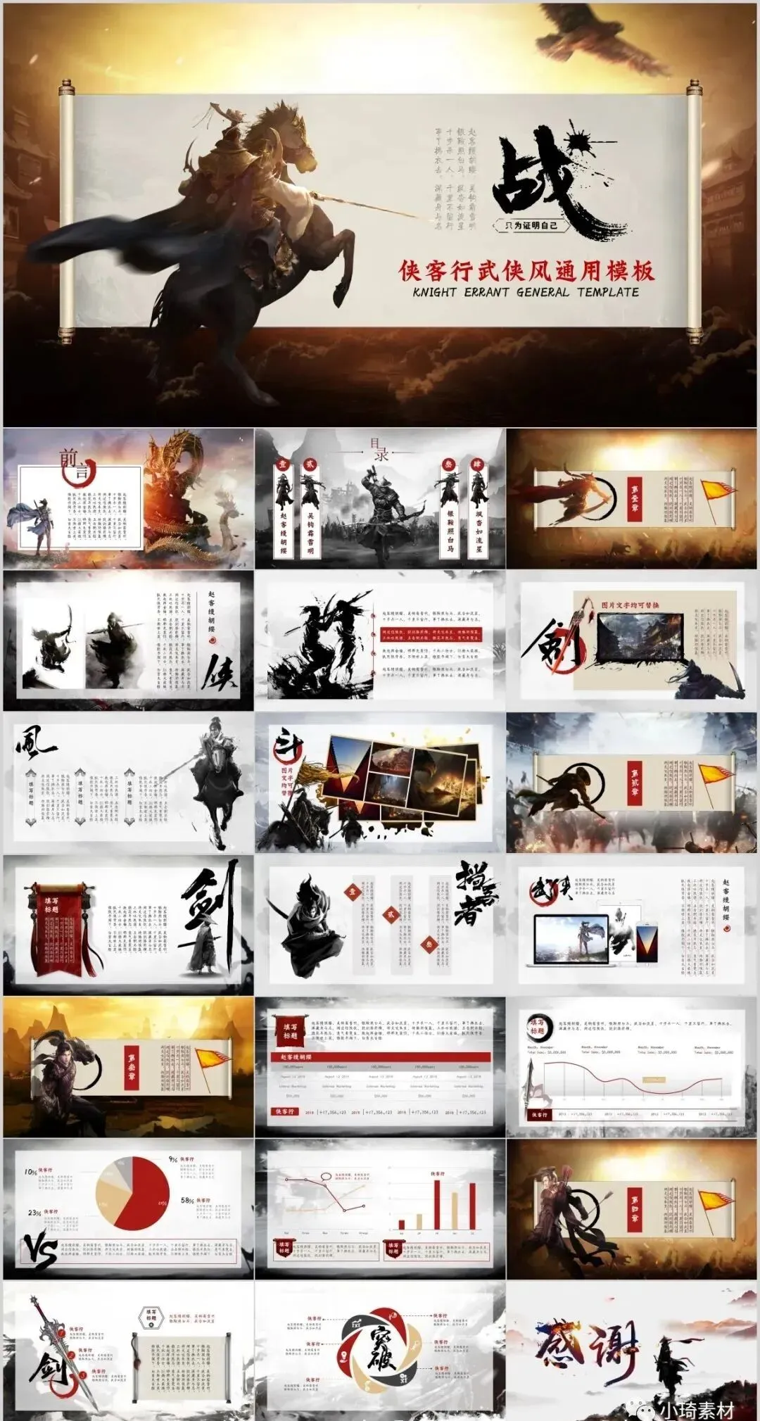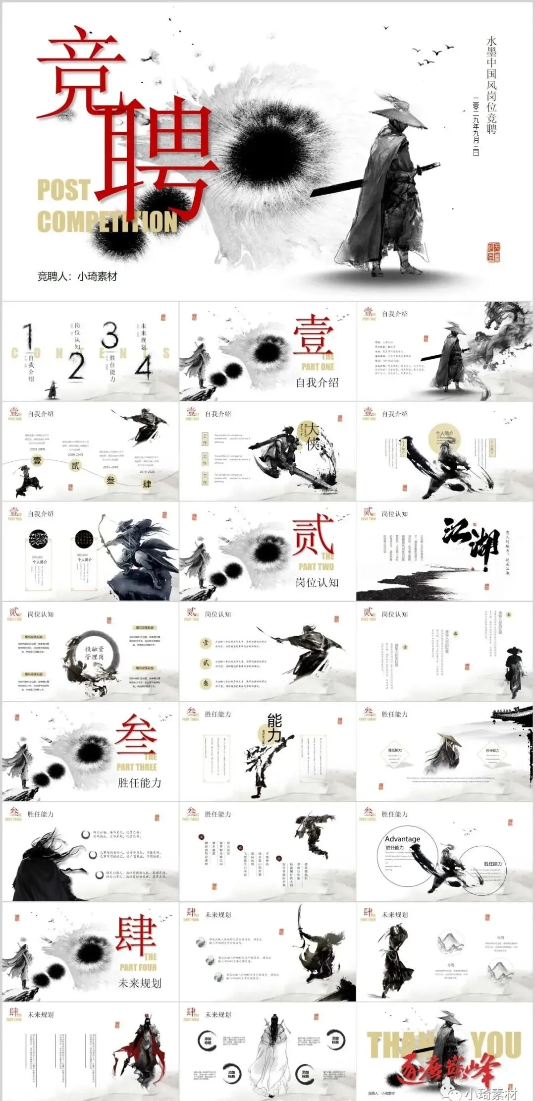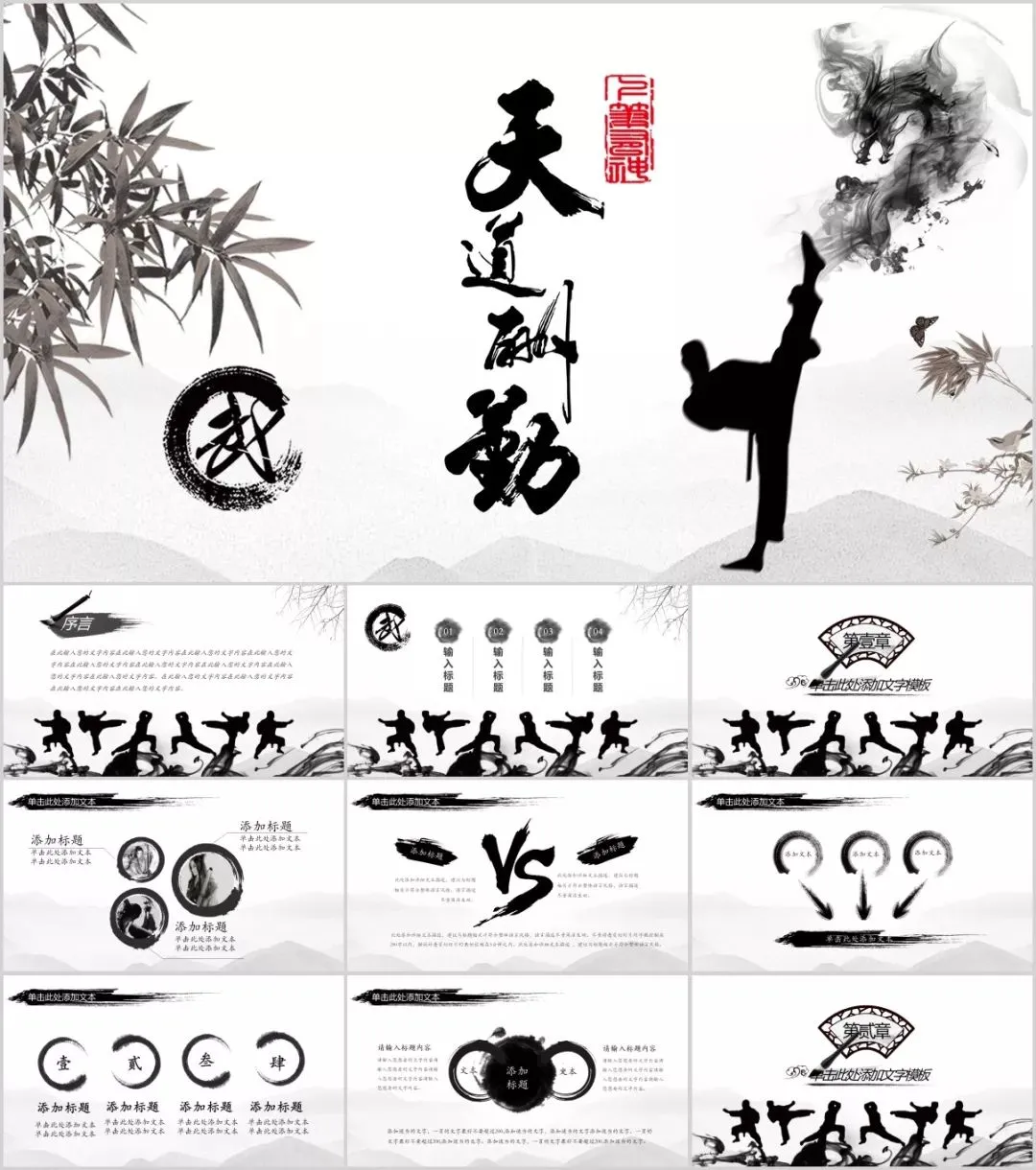 今天有小琦主编给大家分享的是是32套水墨武侠风PPT模板,适用于多种范围:个人简历、活动策划、课件演示、毕业答辩、作业制作、工作汇报、计划总结、项目介绍、商业计划、企业招聘、产品发布等等。