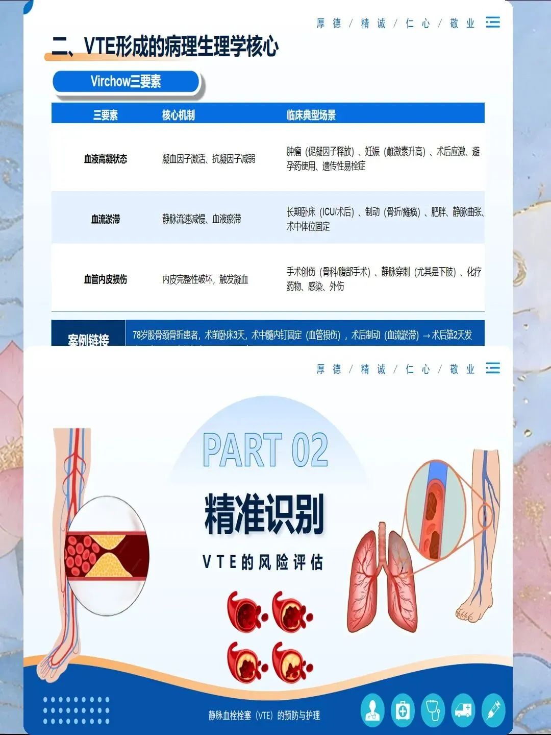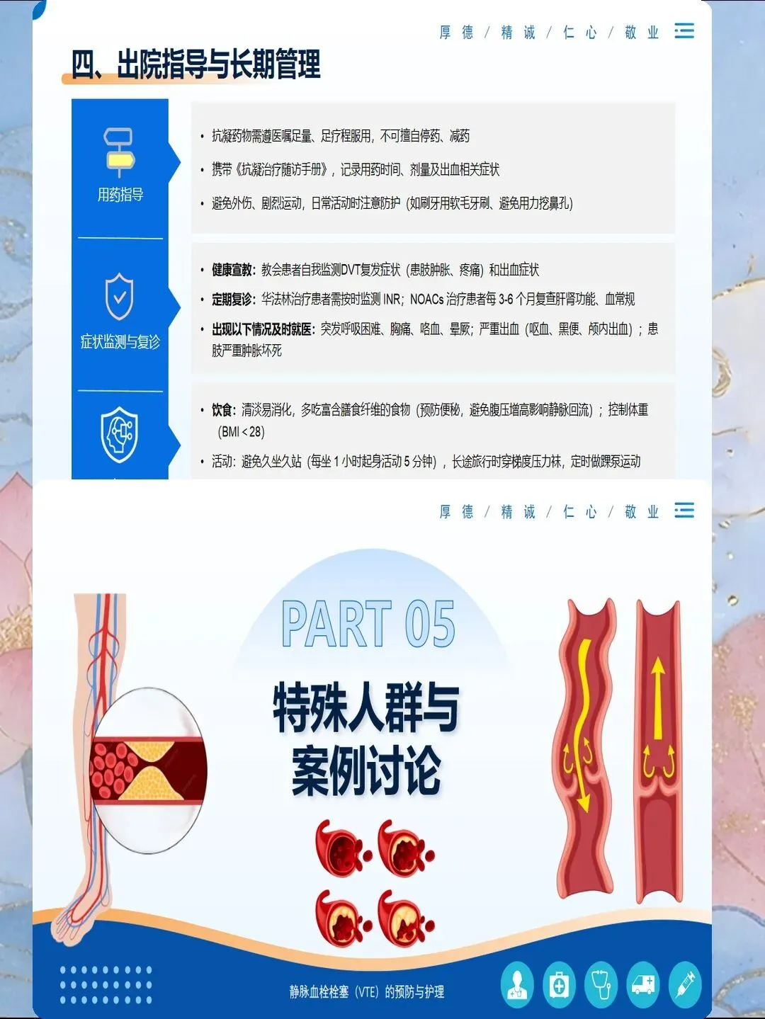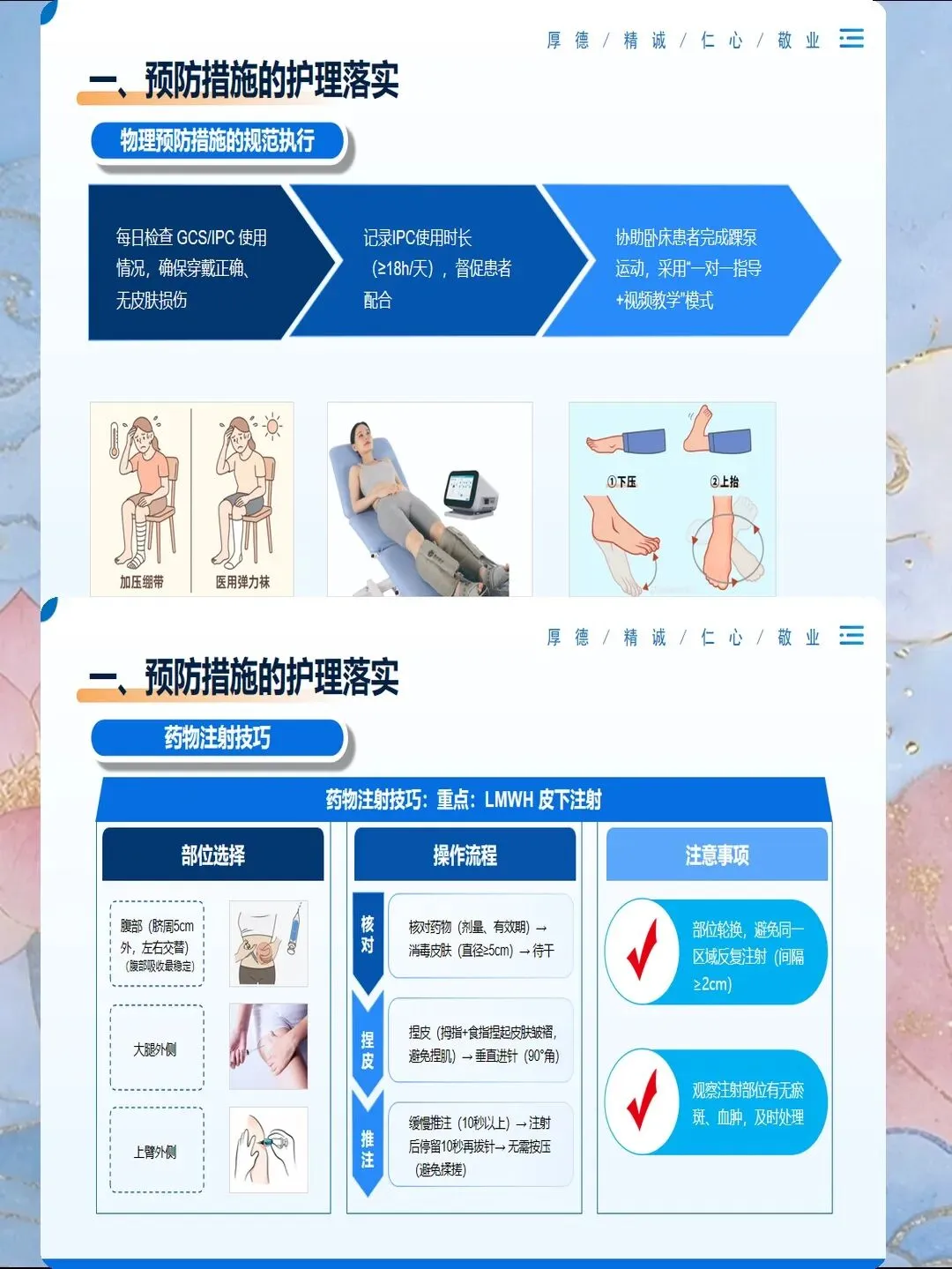 血管因素评估:选择粗直、血流丰富、弹性好的血管,避免关节附近、有静脉炎史、皮肤破损的部位。上肢静脉优于下肢静脉,因为下肢静脉瓣膜多、血流慢、回流差,静脉炎发生率是上肢的2-3倍。