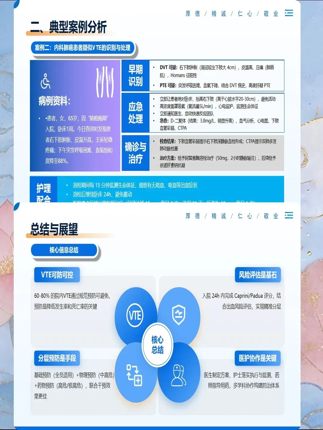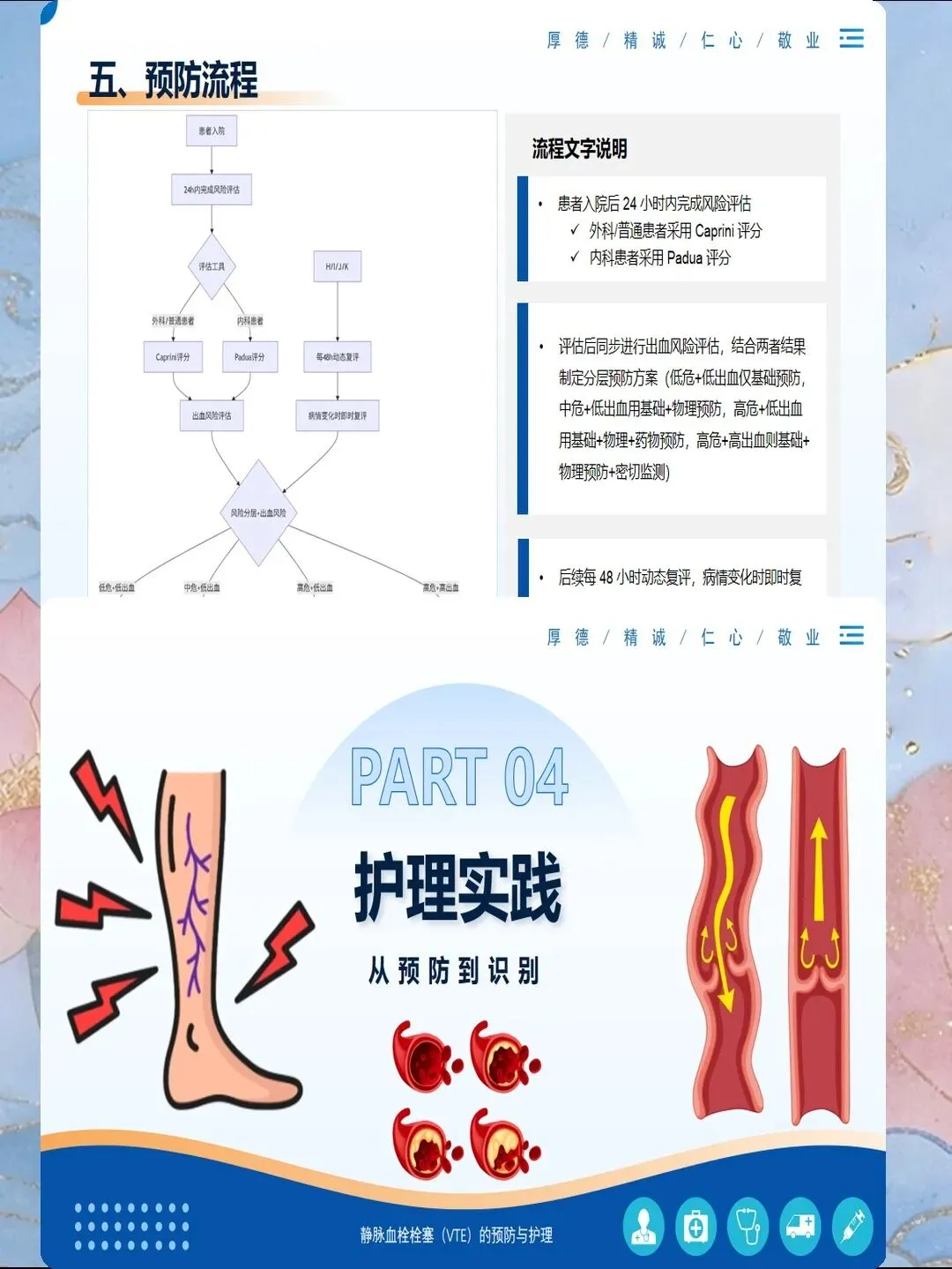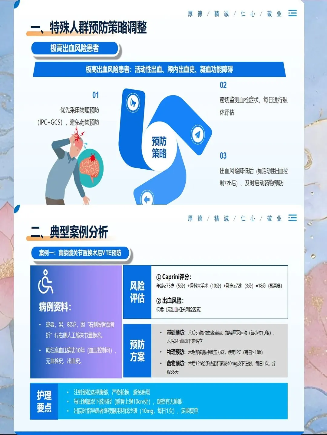 评估完成后,要制定个体化的预防方案:高风险患者使用细管径导管,选择粗血管,每班观察穿刺部位;低风险患者可以使用常规导管,但也要每班观察,不要掉以轻心。