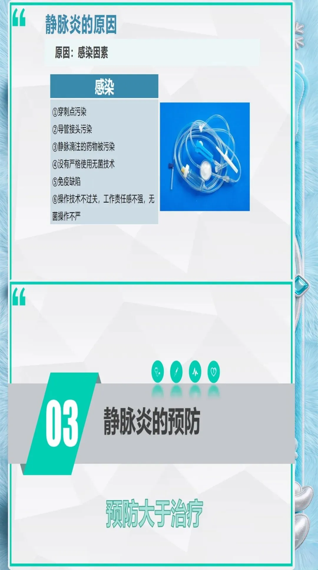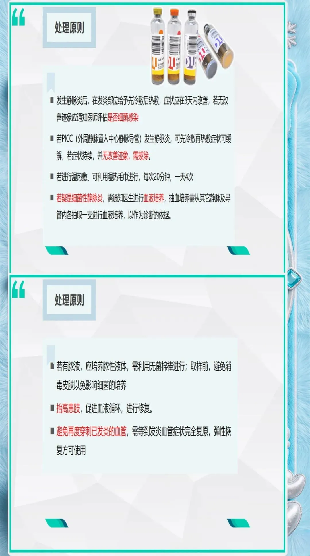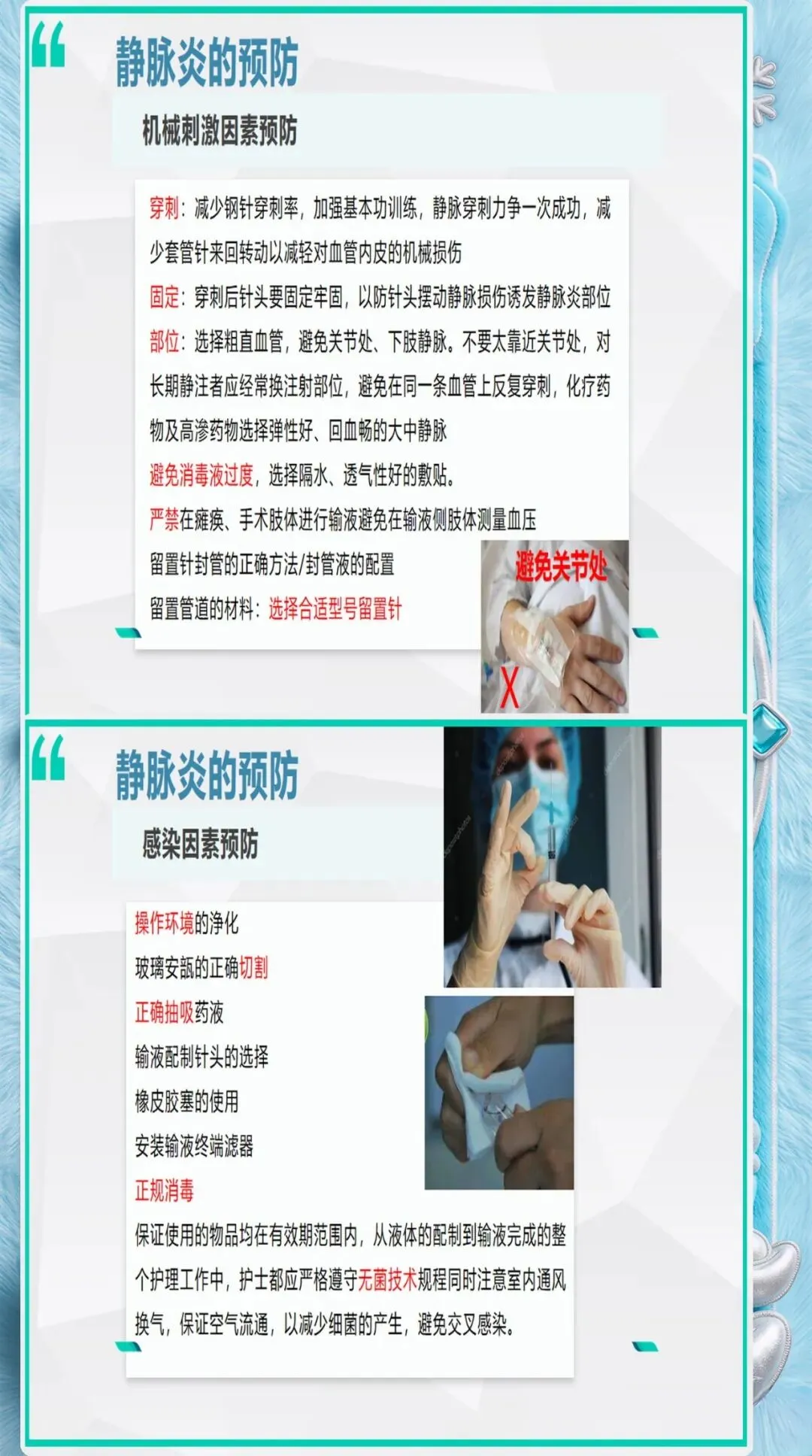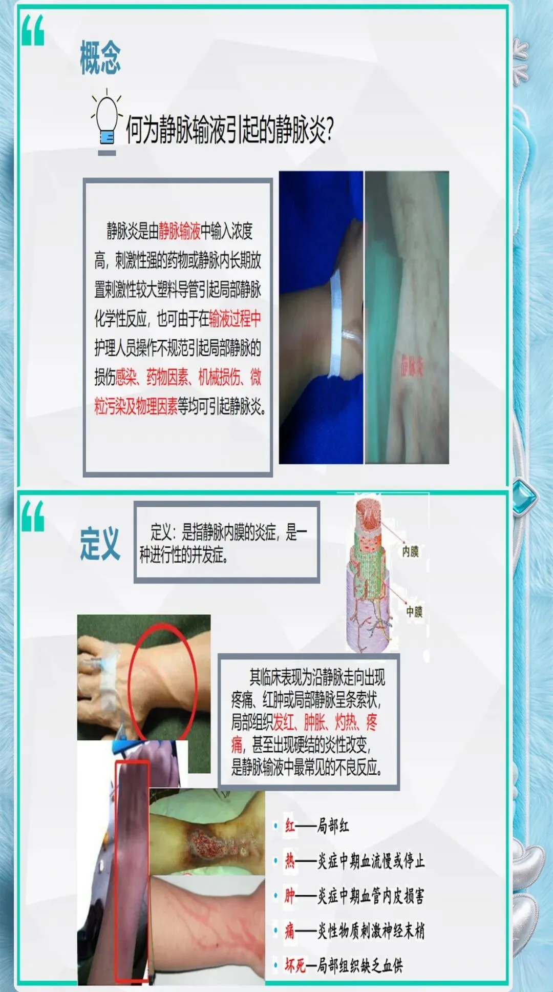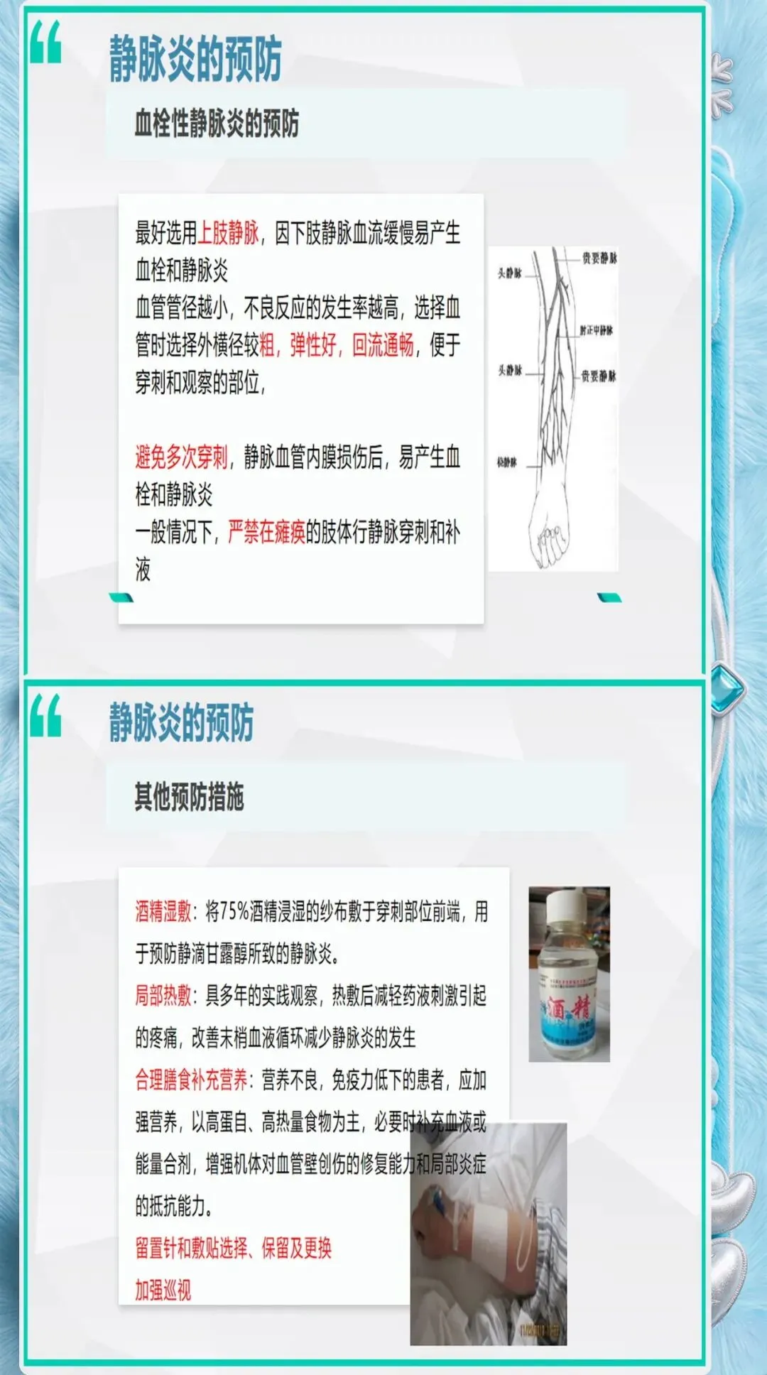 患者因素评估:高龄(≥65岁)、糖尿病、营养不良、免疫抑制、血液高凝状态、既往有静脉炎史的患者,发生静脉炎的风险显著增加。这些患者需要选择更细的导管、更粗的血管、更频繁的观察。