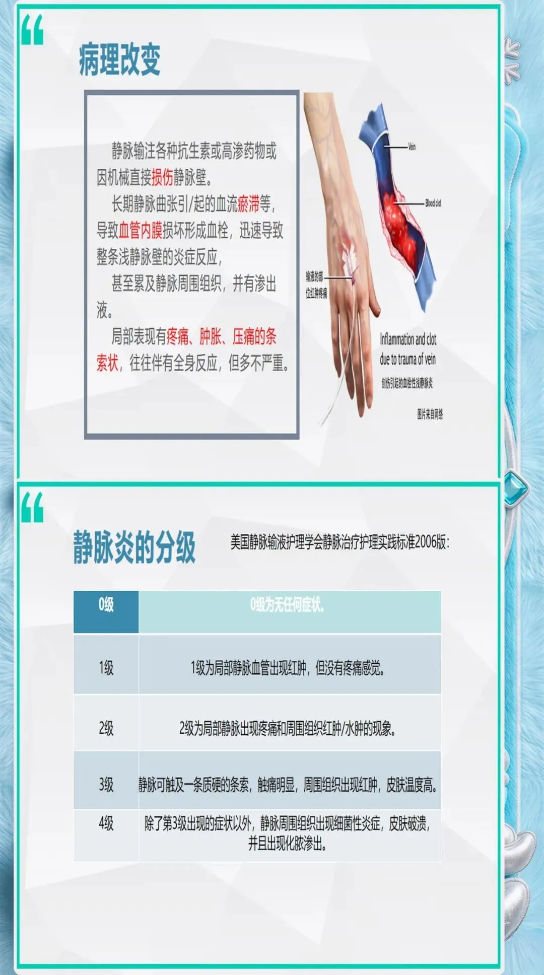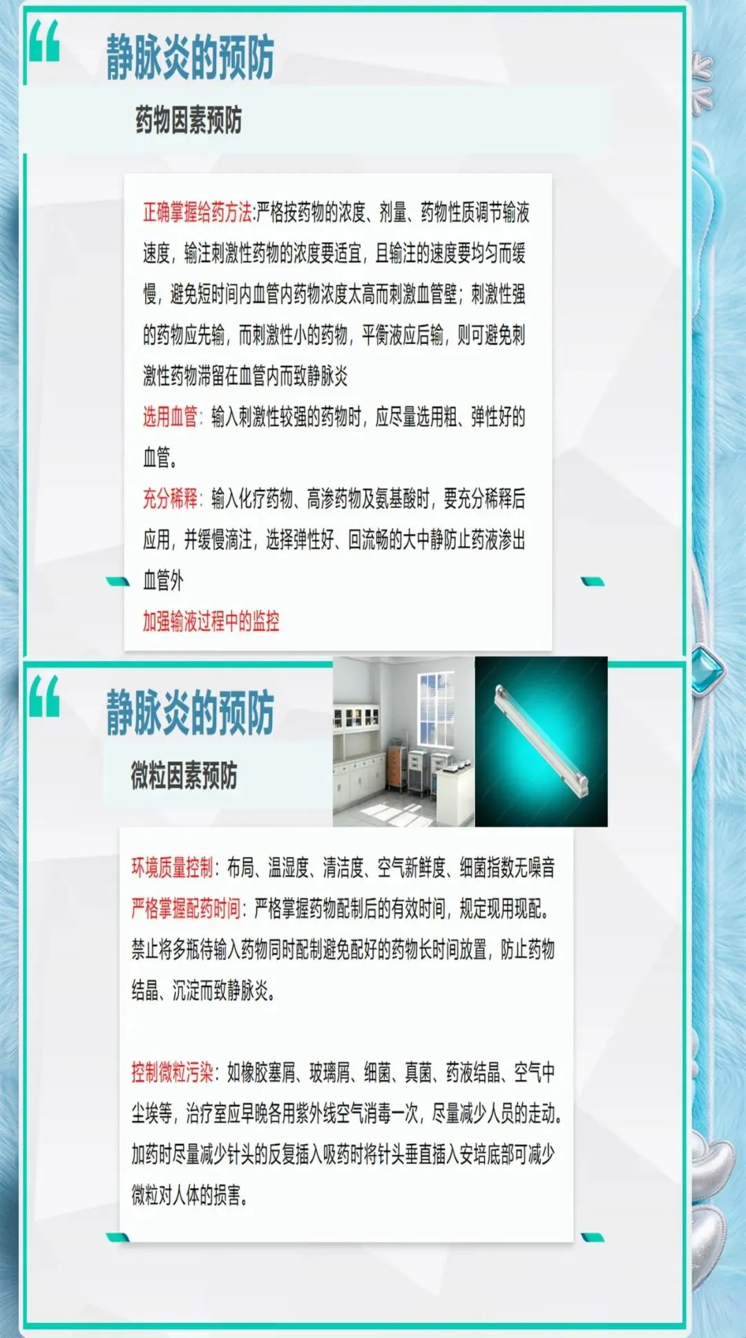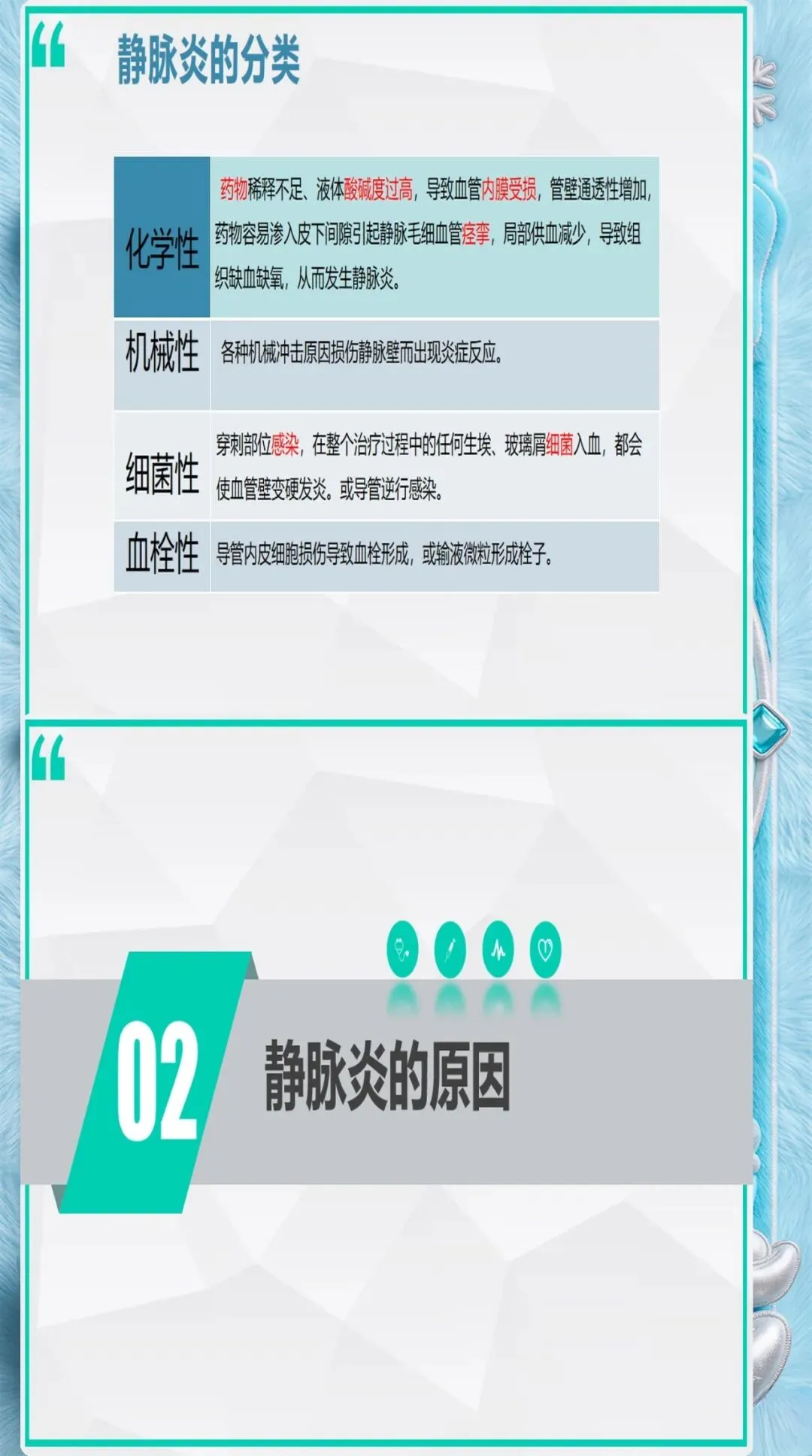 药物引起的化学性静脉炎占静脉炎的40%-50%,是最常见的类型。规范的药物管理可以大大降低化学性静脉炎的发生率。