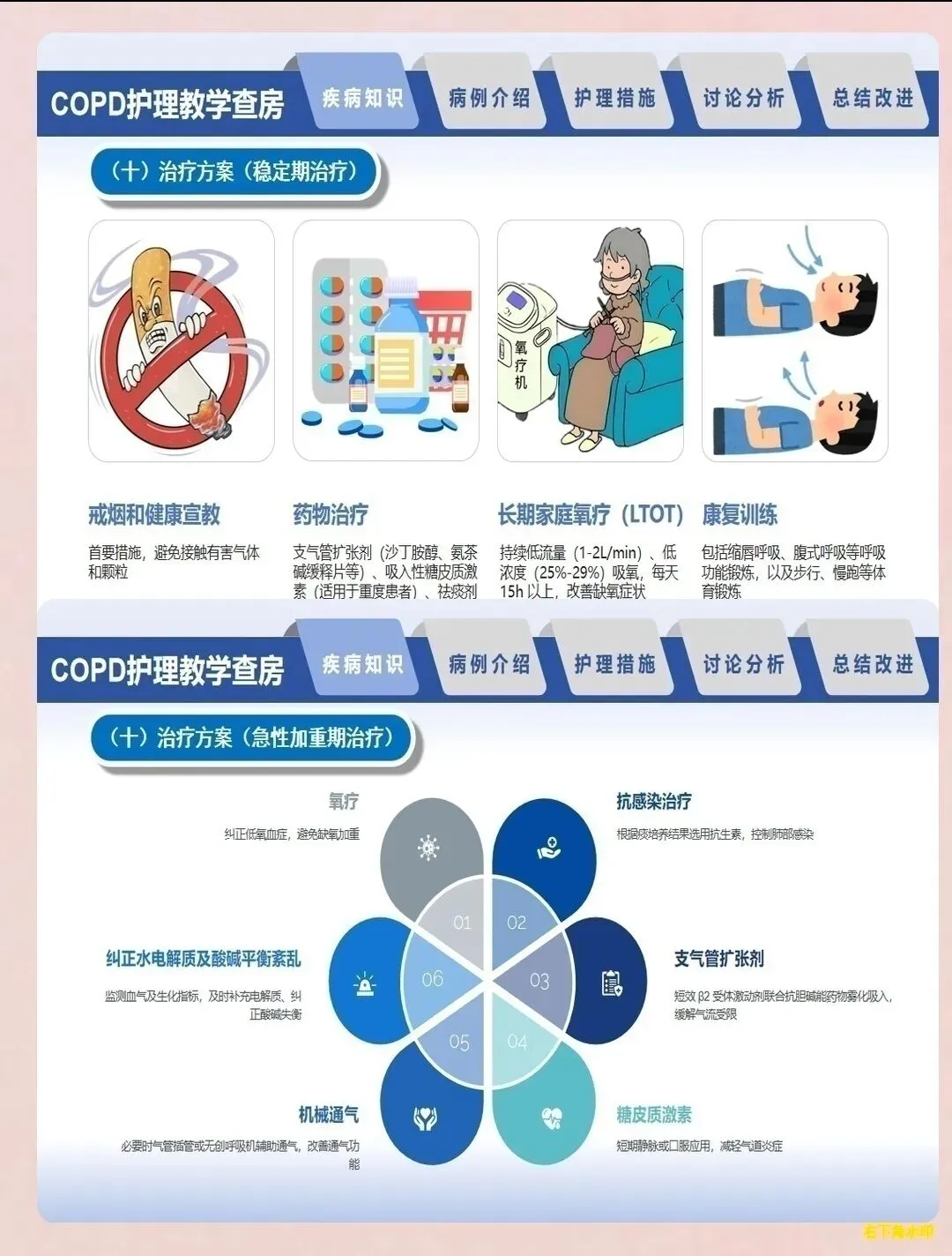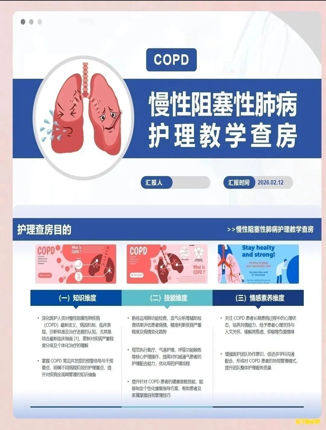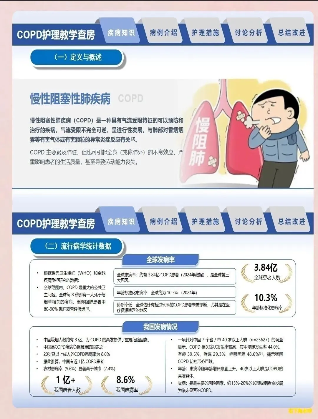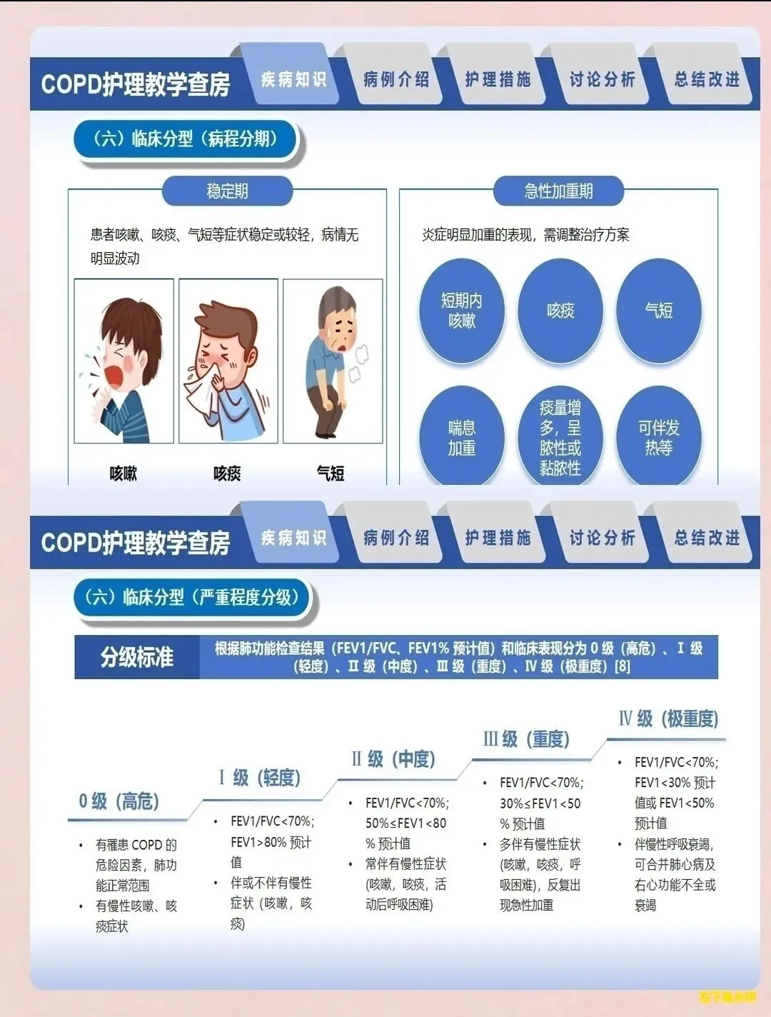 慢阻肺患者的护理查房,在呼吸科是常规工作,但真正的专业查房不应该只停留在"症状有无缓解、生命体征是否平稳"的表面层次。慢阻肺作为一种慢性进展性疾病,其护理重点不仅在于急性期的管理,更在于稳定期的预防复发和长期的生活质量维持。很多护士在查房时关注的是当下的治疗反应,但对于急性加重的早期识别、长期氧疗的规范管理、肺康复的个性化实施、心理社会支持的系统性干预等关键问题,讨论深度往往不够。一、急性加重风险的动态评估:预防重于治疗