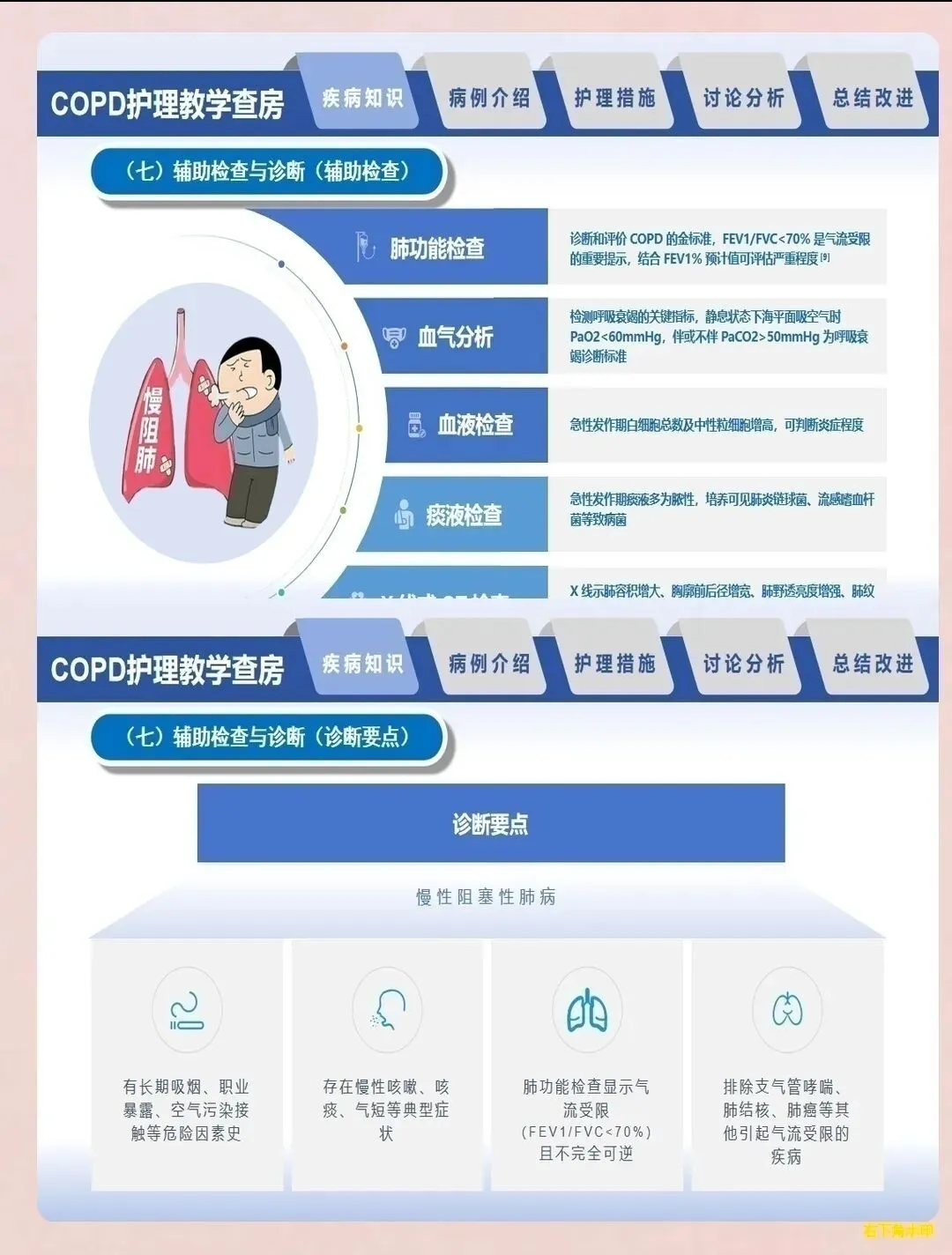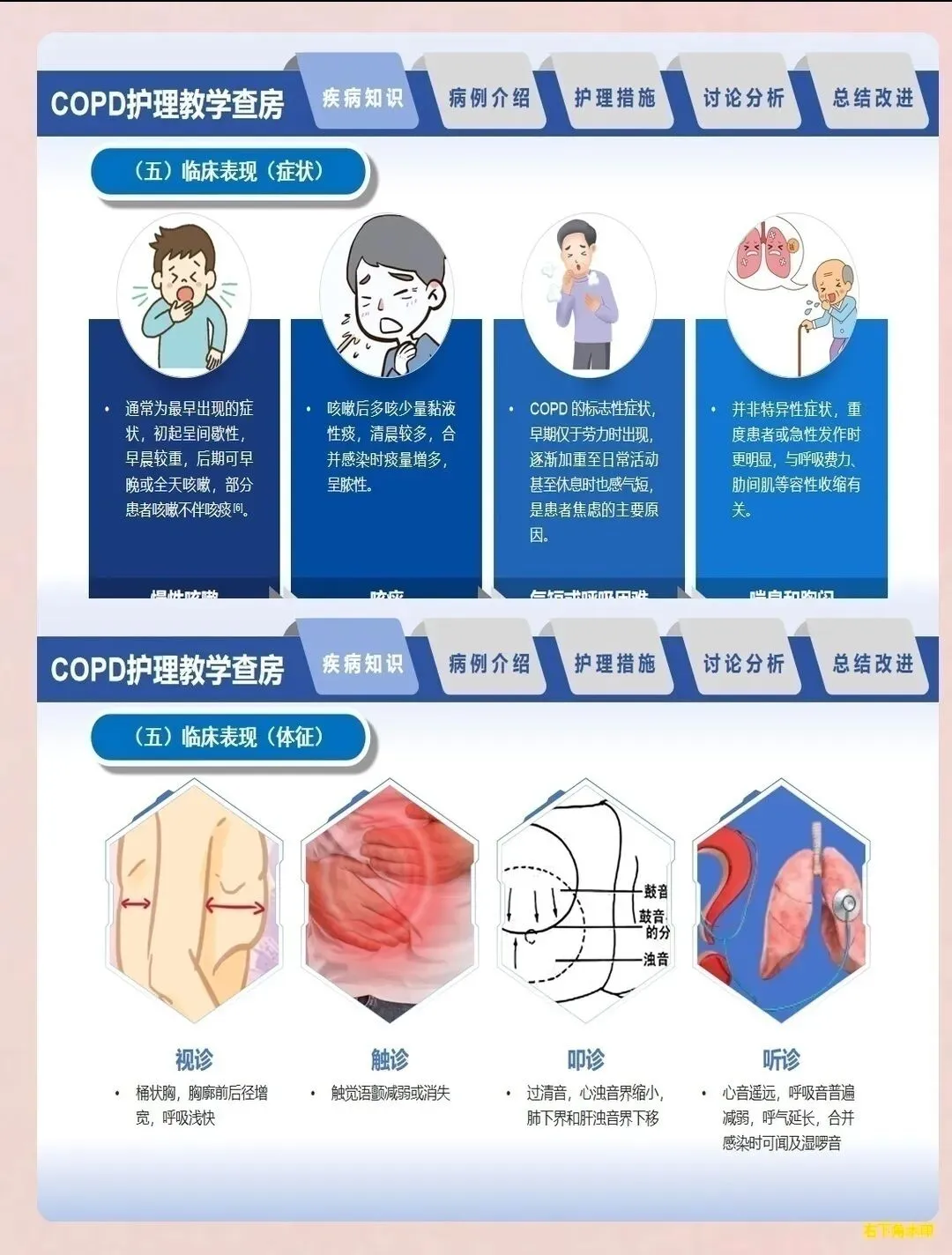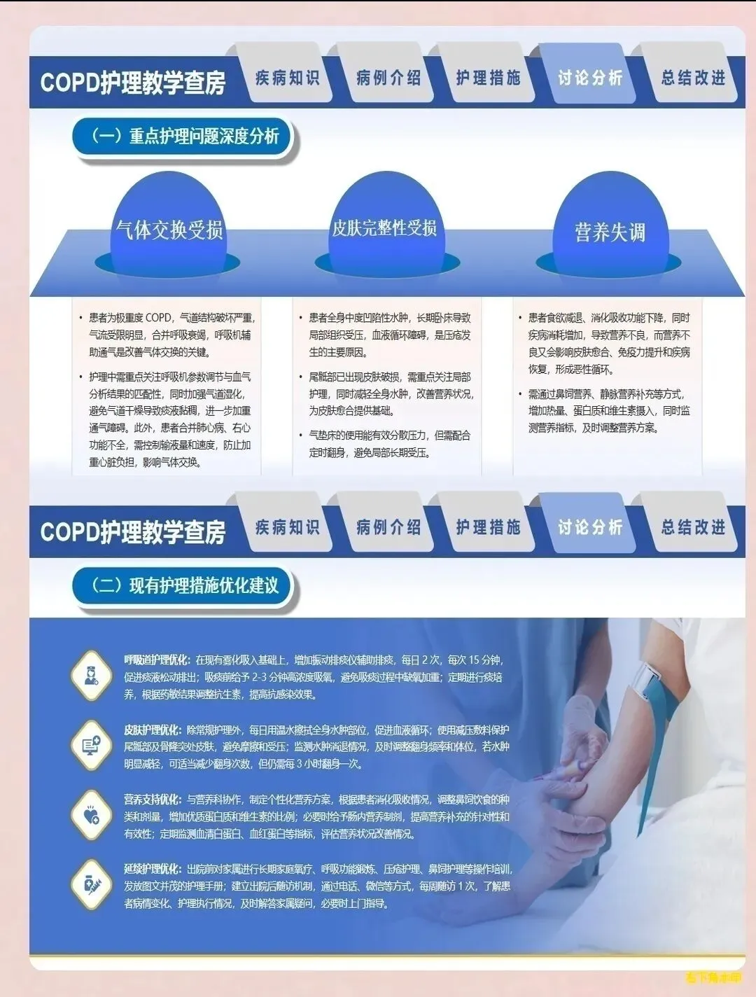 慢阻肺患者的护理查房,在呼吸科是常规工作,但真正的专业查房不应该只停留在"症状有无缓解、生命体征是否平稳"的表面层次。慢阻肺作为一种慢性进展性疾病,其护理重点不仅在于急性期的管理,更在于稳定期的预防复发和长期的生活质量维持。很多护士在查房时关注的是当下的治疗反应,但对于急性加重的早期识别、长期氧疗的规范管理、肺康复的个性化实施、心理社会支持的系统性干预等关键问题,讨论深度往往不够。一、急性加重风险的动态评估:预防重于治疗