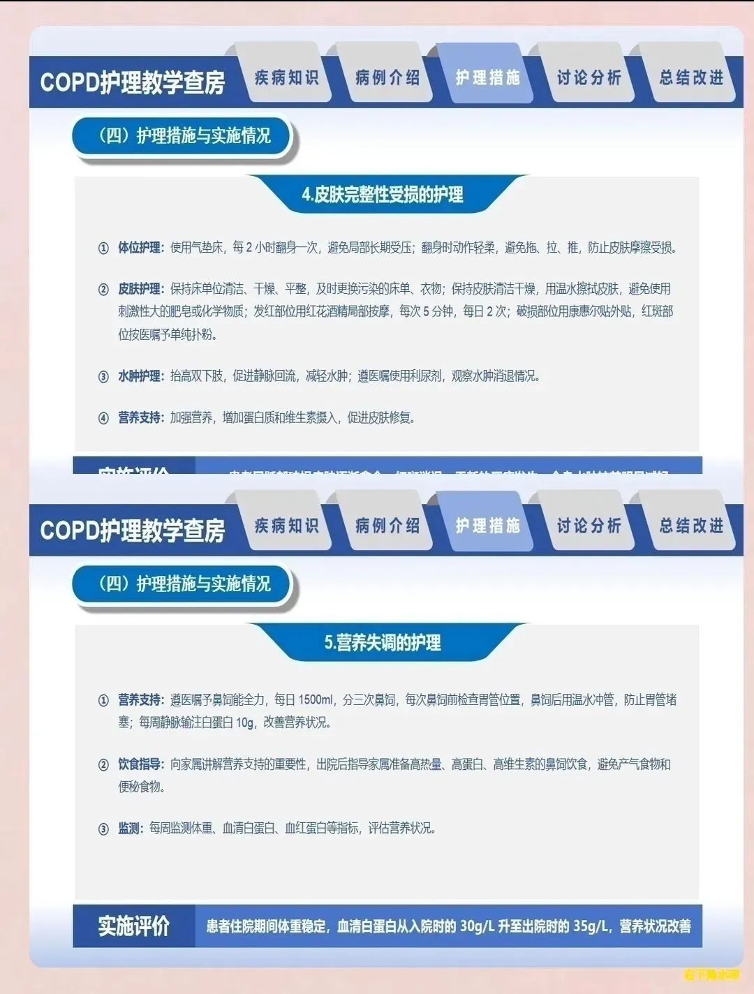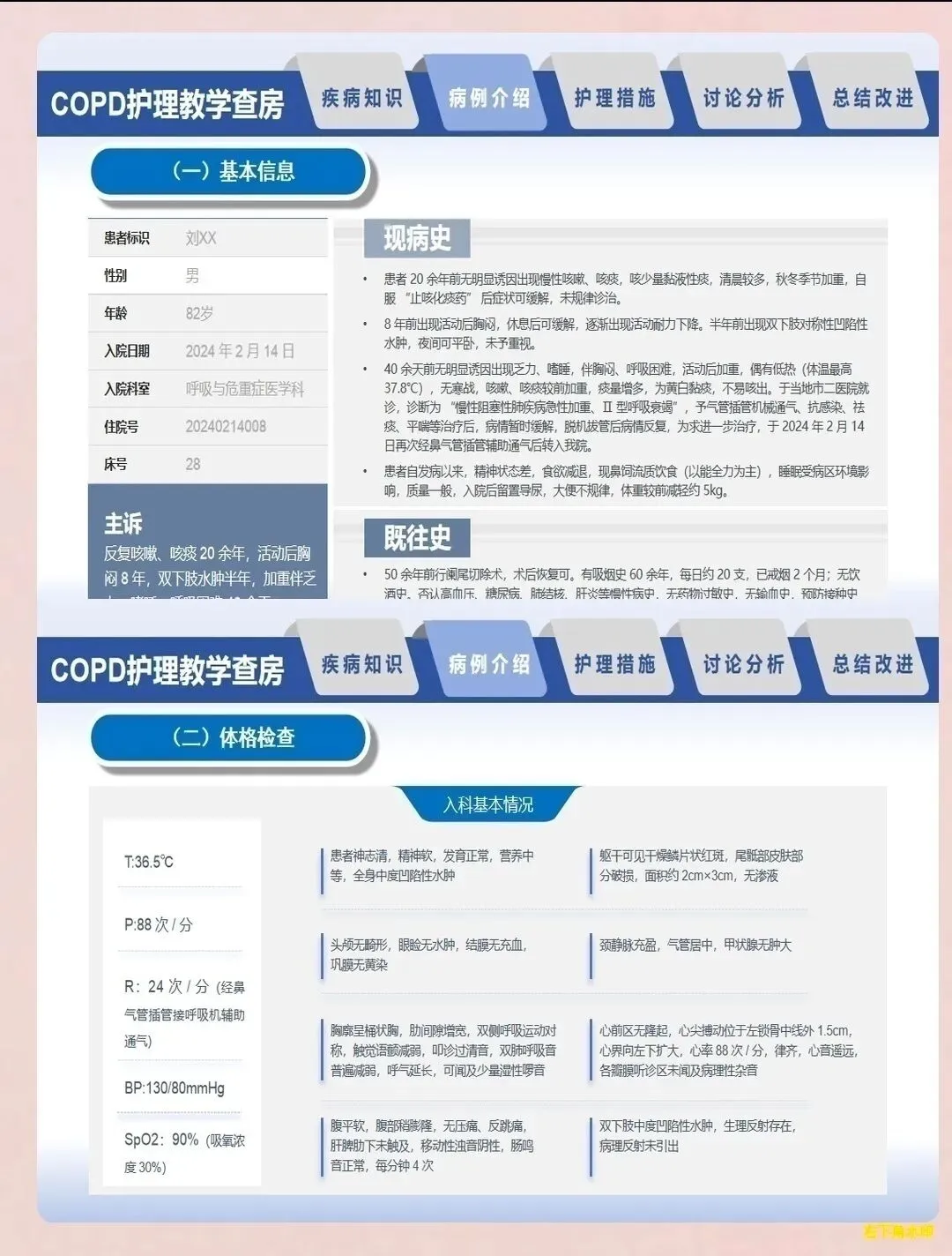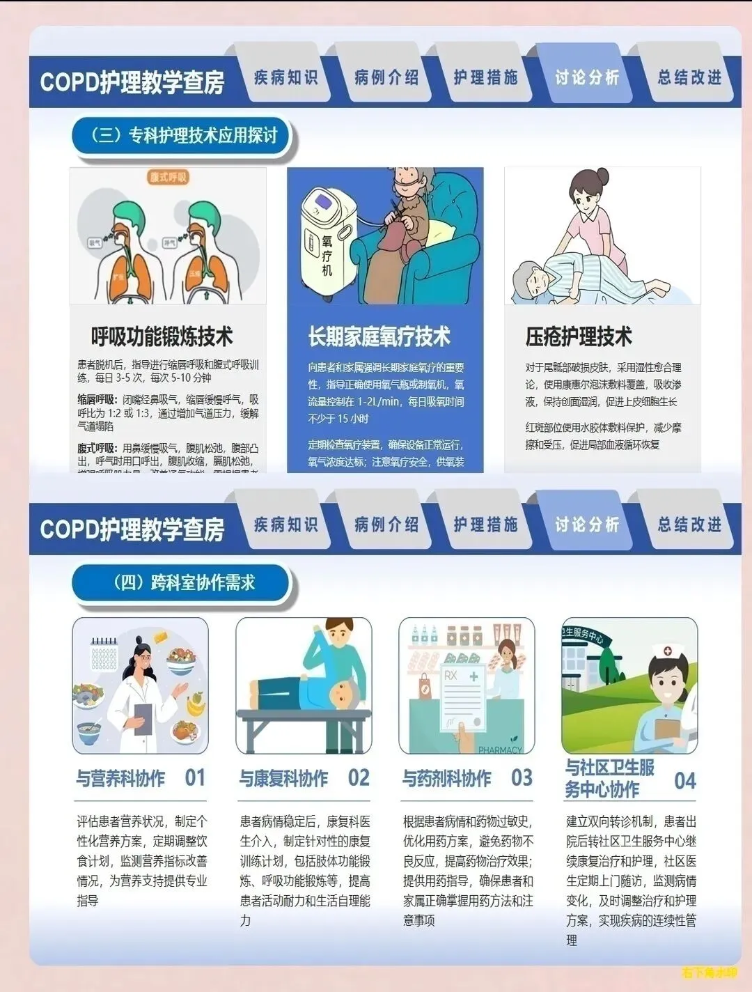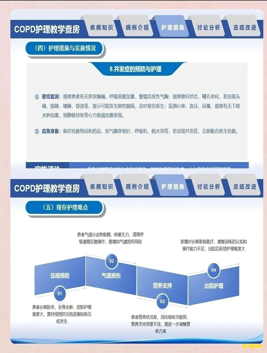 慢阻肺患者的护理查房,在呼吸科是常规工作,但真正的专业查房不应该只停留在"症状有无缓解、生命体征是否平稳"的表面层次。慢阻肺作为一种慢性进展性疾病,其护理重点不仅在于急性期的管理,更在于稳定期的预防复发和长期的生活质量维持。很多护士在查房时关注的是当下的治疗反应,但对于急性加重的早期识别、长期氧疗的规范管理、肺康复的个性化实施、心理社会支持的系统性干预等关键问题,讨论深度往往不够。一、急性加重风险的动态评估:预防重于治疗