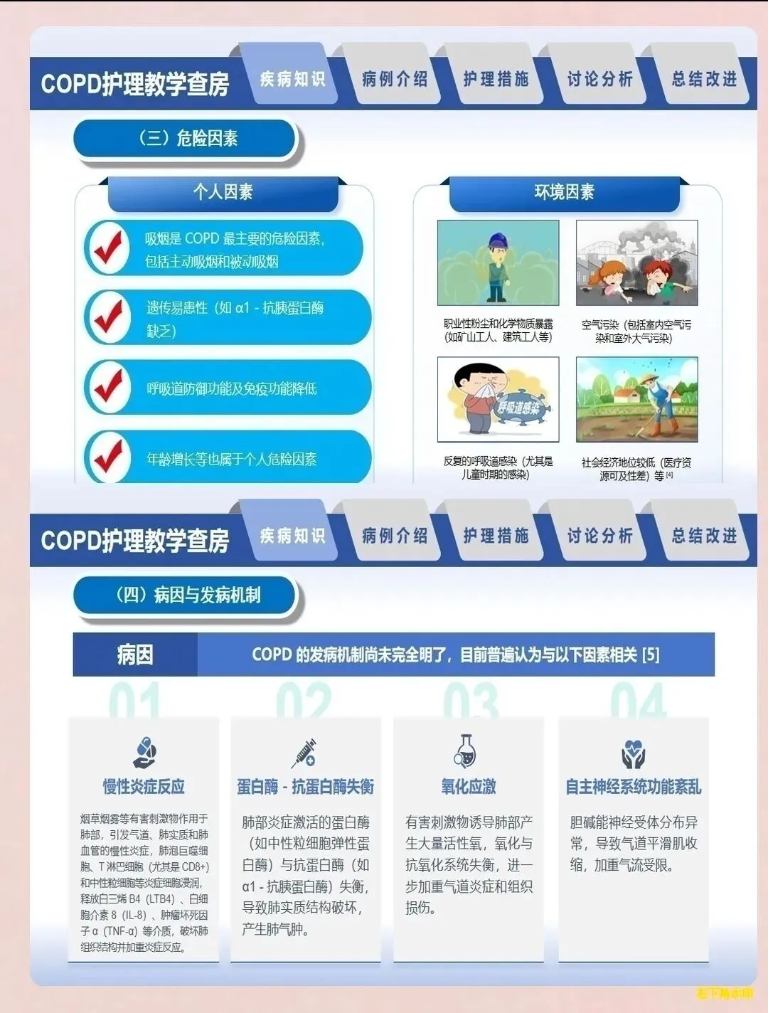 慢阻肺急性加重是导致患者肺功能加速下降、住院率增加、死亡率升高的重要因素,但很多护士在查房时很少主动评估患者的急性加重风险,等到患者出现明显的症状加重时才开始干预。