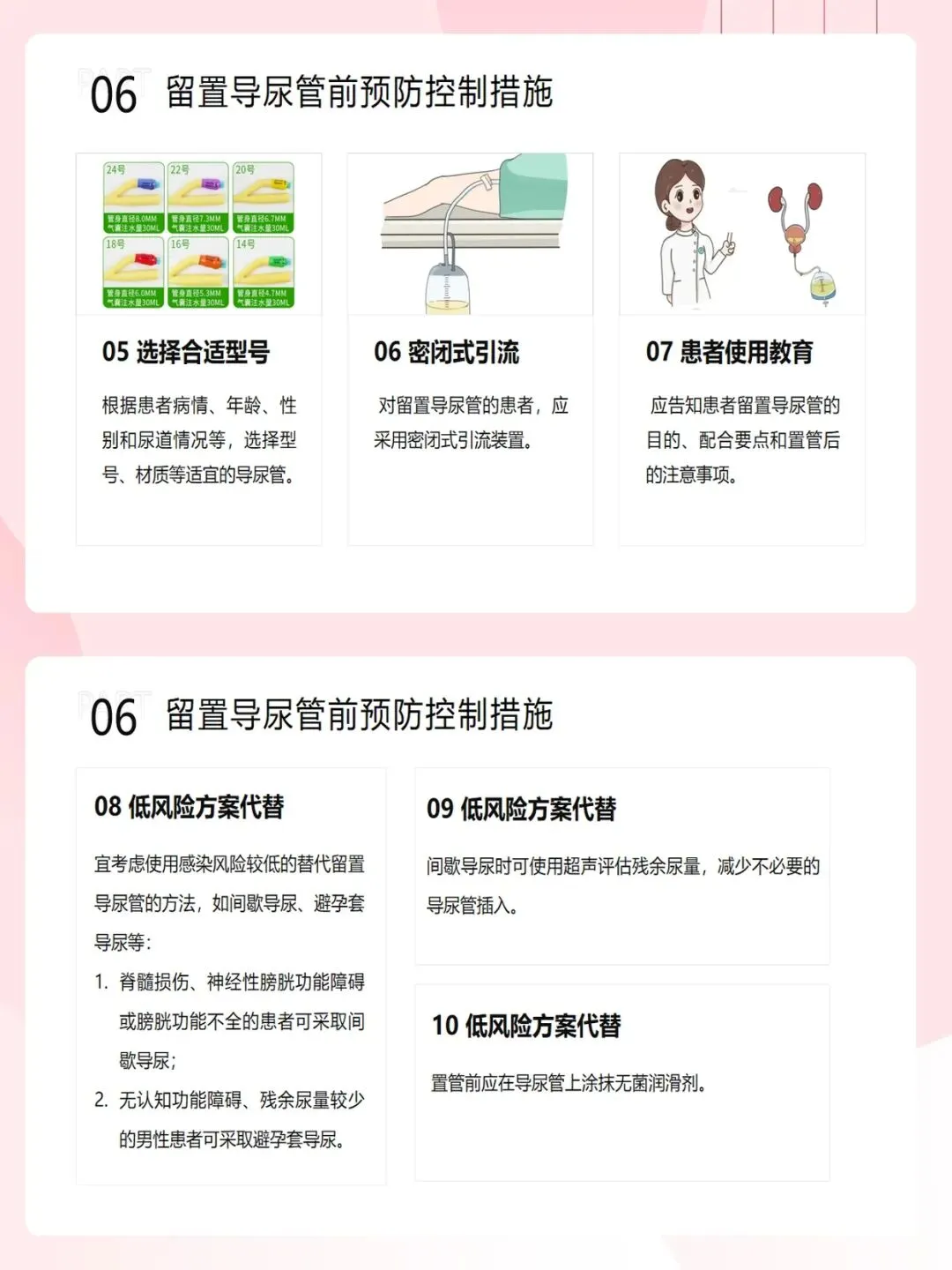 其次,操作要规范。置管前,严格掌握适应征,避免不必要的导尿。优先考虑间歇导尿、避孕套导尿等低风险替代方案。置管时,严格执行手卫生,使用无菌技术,选择合适型号的导尿管,并采用密闭式引流装置。