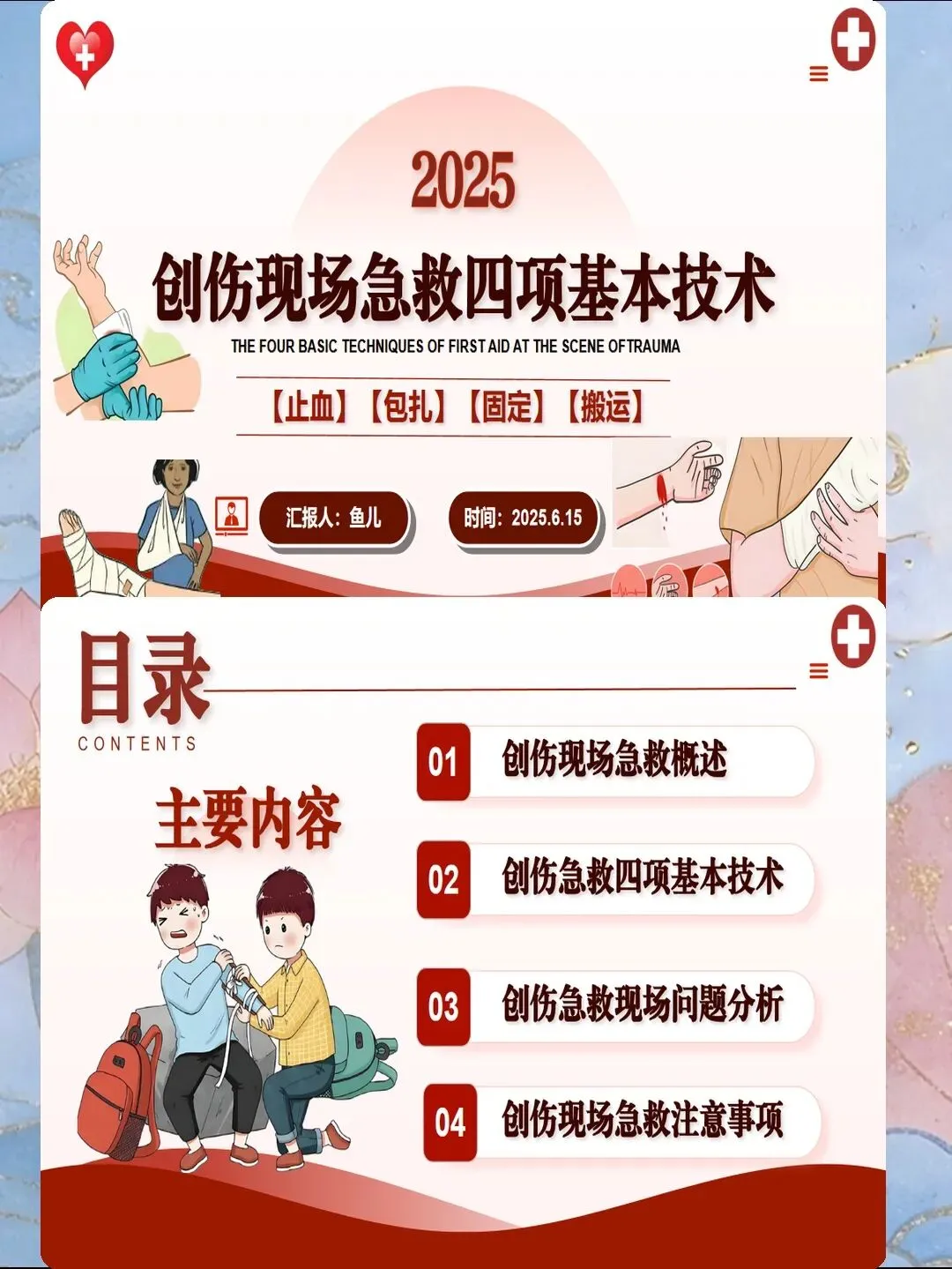 包扎的目的不仅是止血,更在于保护伤口、预防感染、固定敷料、减轻疼痛。现场包扎需遵循"清洁、干燥、适度压力"原则。对于清洁伤口,使用生理盐水冲洗后覆盖无菌敷料;污染伤口则需过氧化氢或碘伏消毒后再包扎。包扎力度以能止血但不影响远端循环为宜,可通过观察手指/脚趾颜色、温度、感觉判断松紧度。对于开放性骨折伤口,严禁现场复位,应在伤口周围放置敷料环后再包扎,避免骨折端刺伤血管神经。