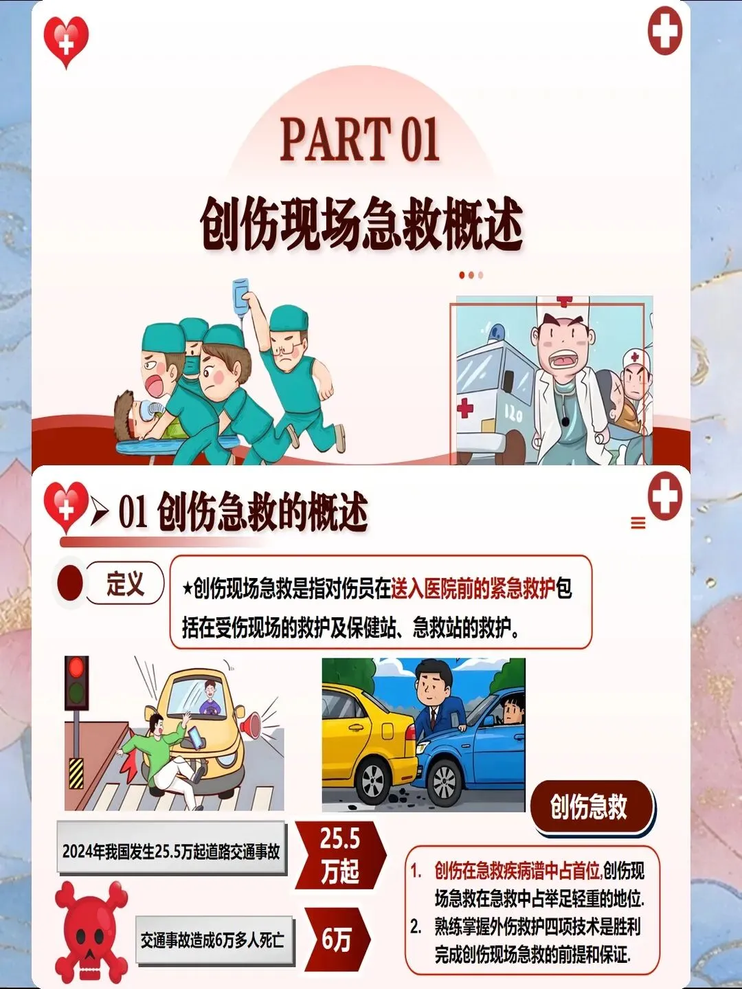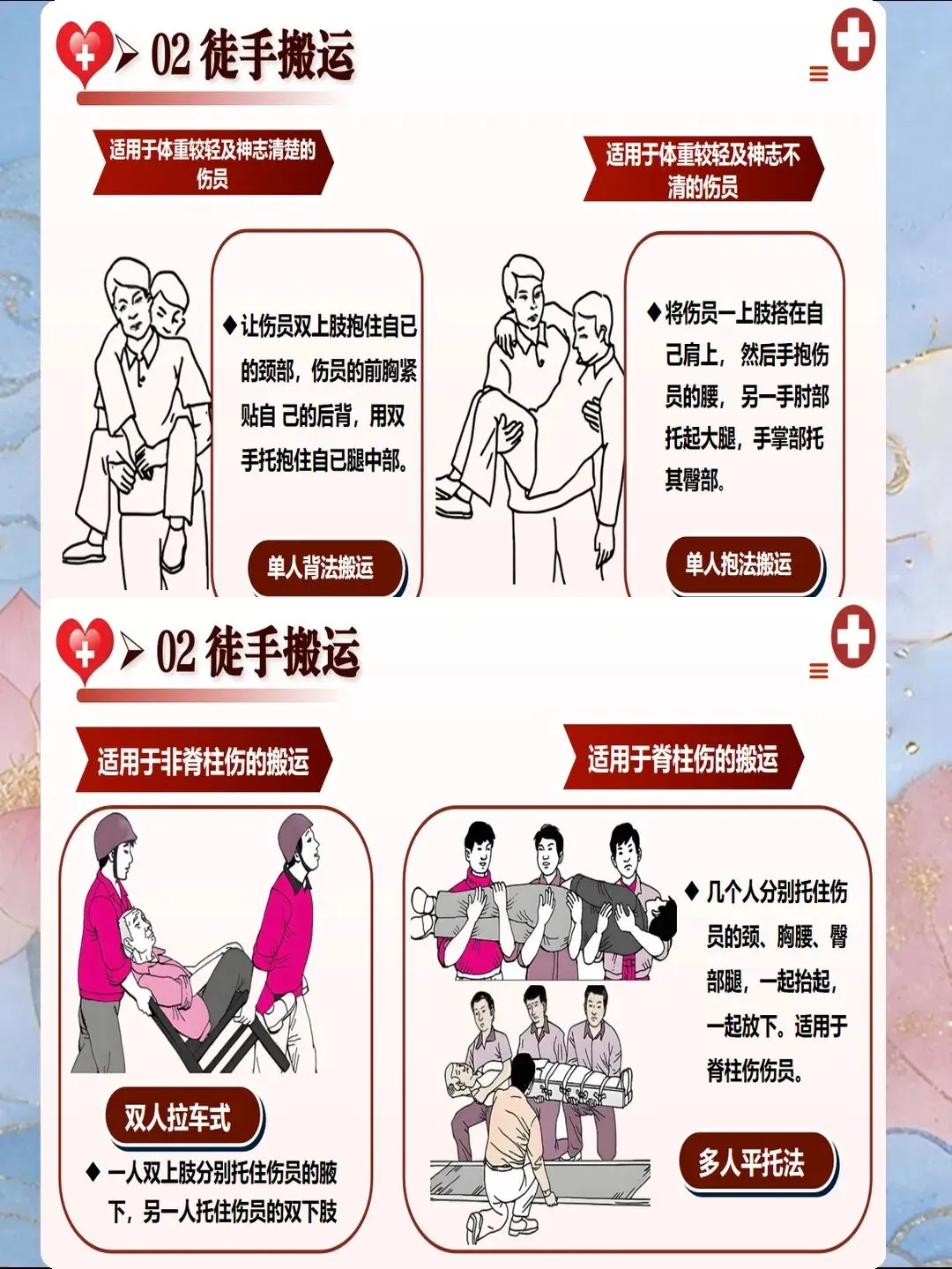 搬运是创伤急救的最后一环,也是最容易导致二次损伤的环节。搬运前需快速评估:意识状态、颈椎稳定性、骨盆完整性、四肢活动能力。对于疑似颈椎损伤患者,必须使用颈托固定,保持头颈躯干同轴转动。推荐采用四人搬运法:一人固定头部,三人分别负责肩部、腰部、下肢,统一指令同步抬起,保持脊柱平直。2025年引入"脊柱板铲式担架",可减少搬运过程中的脊柱移位,降低继发性脊髓损伤风险。