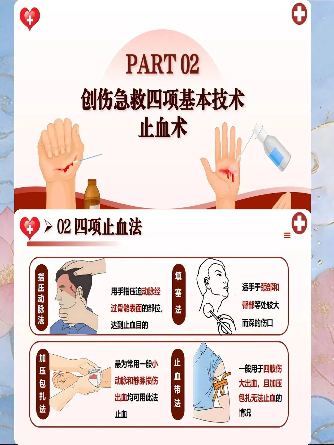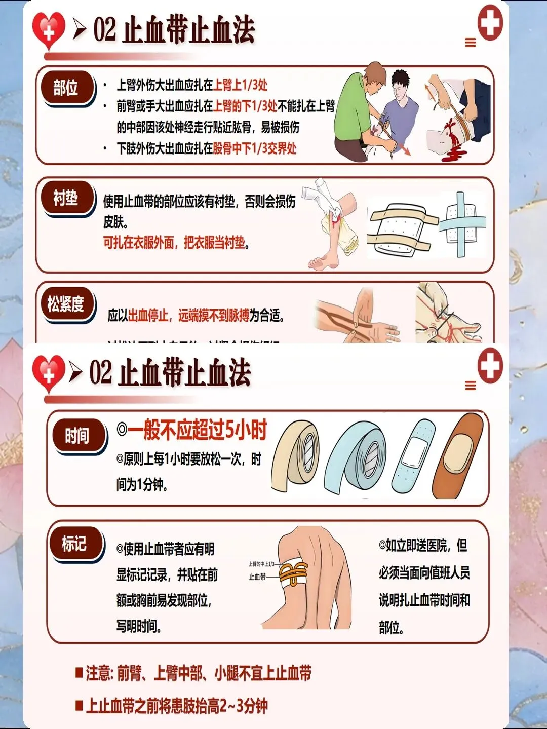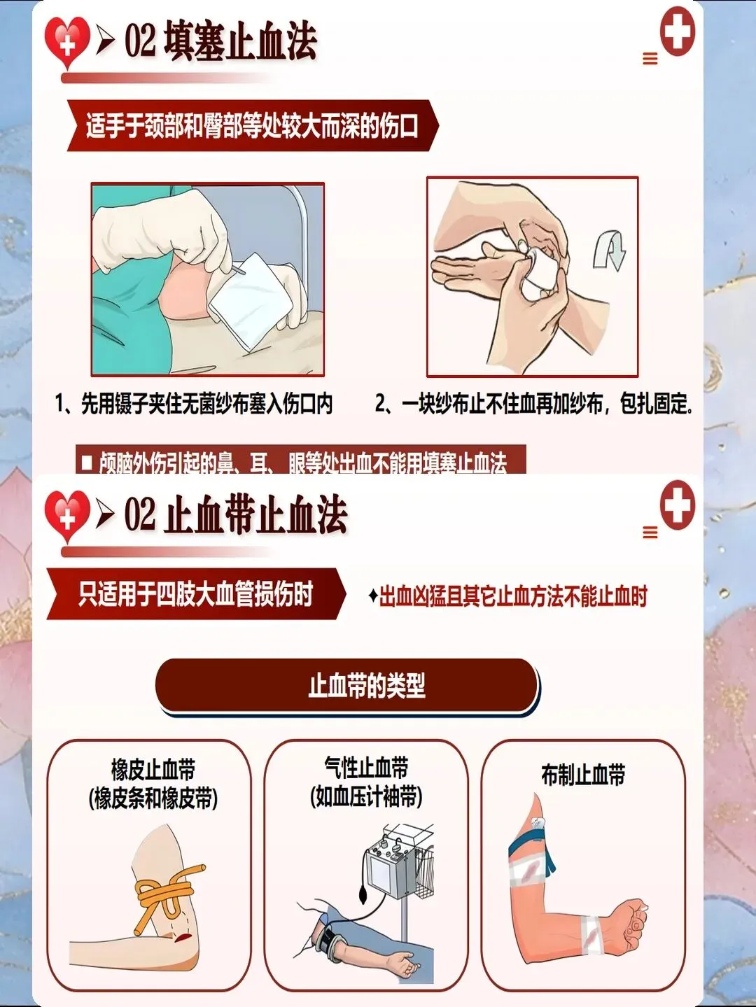 出血是创伤后早期死亡的首要原因,约30%-40%的创伤患者死于无法控制的出血。现场止血需遵循"优先控制致命性出血"原则。对于四肢出血,首选直接压迫止血法:使用无菌敷料覆盖伤口,用手掌或拇指持续压迫15-20分钟,力度以止血为宜,避免过度用力影响远端循环。若直接压迫无效,可采用止血带止血,但需严格掌握适应症与操作规范。2025年推荐使用战术止血带,宽度≥5cm,置于伤口近端5-10cm,标记上带时间,每60-90分钟放松1次,每次不超过2分钟,最长使用时间不超过4小时。